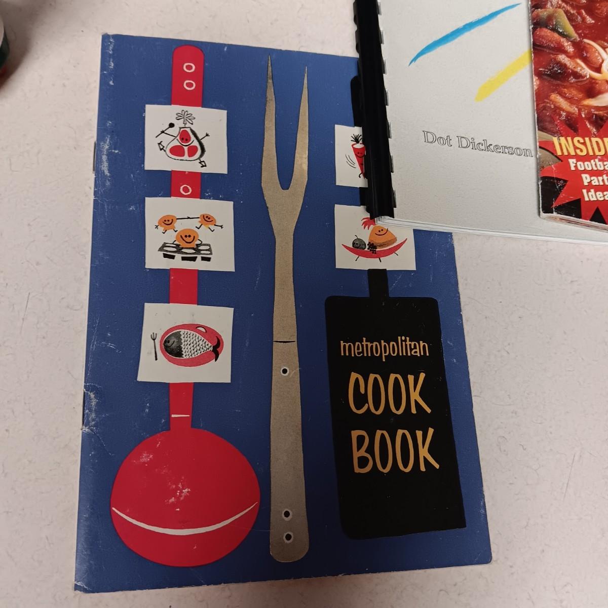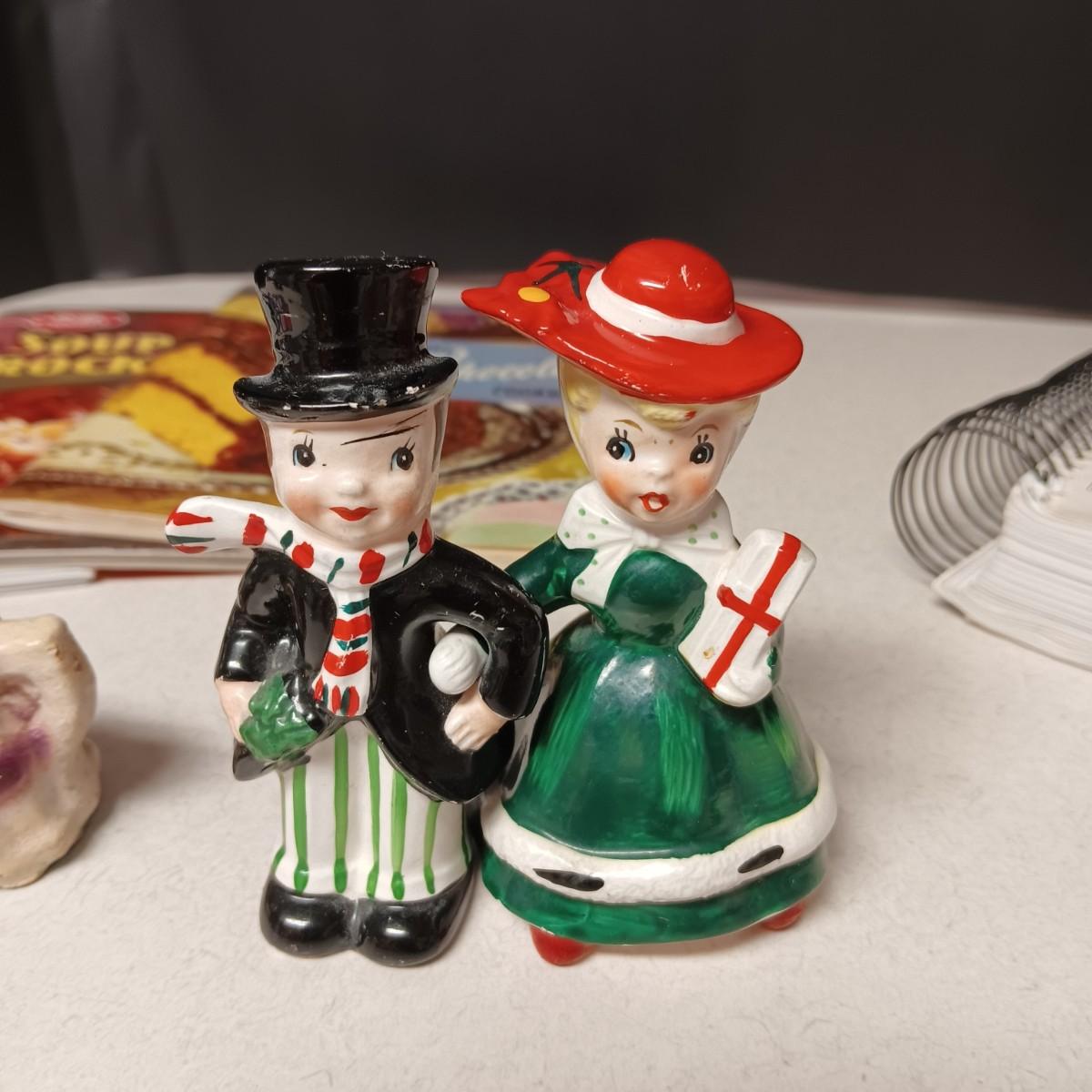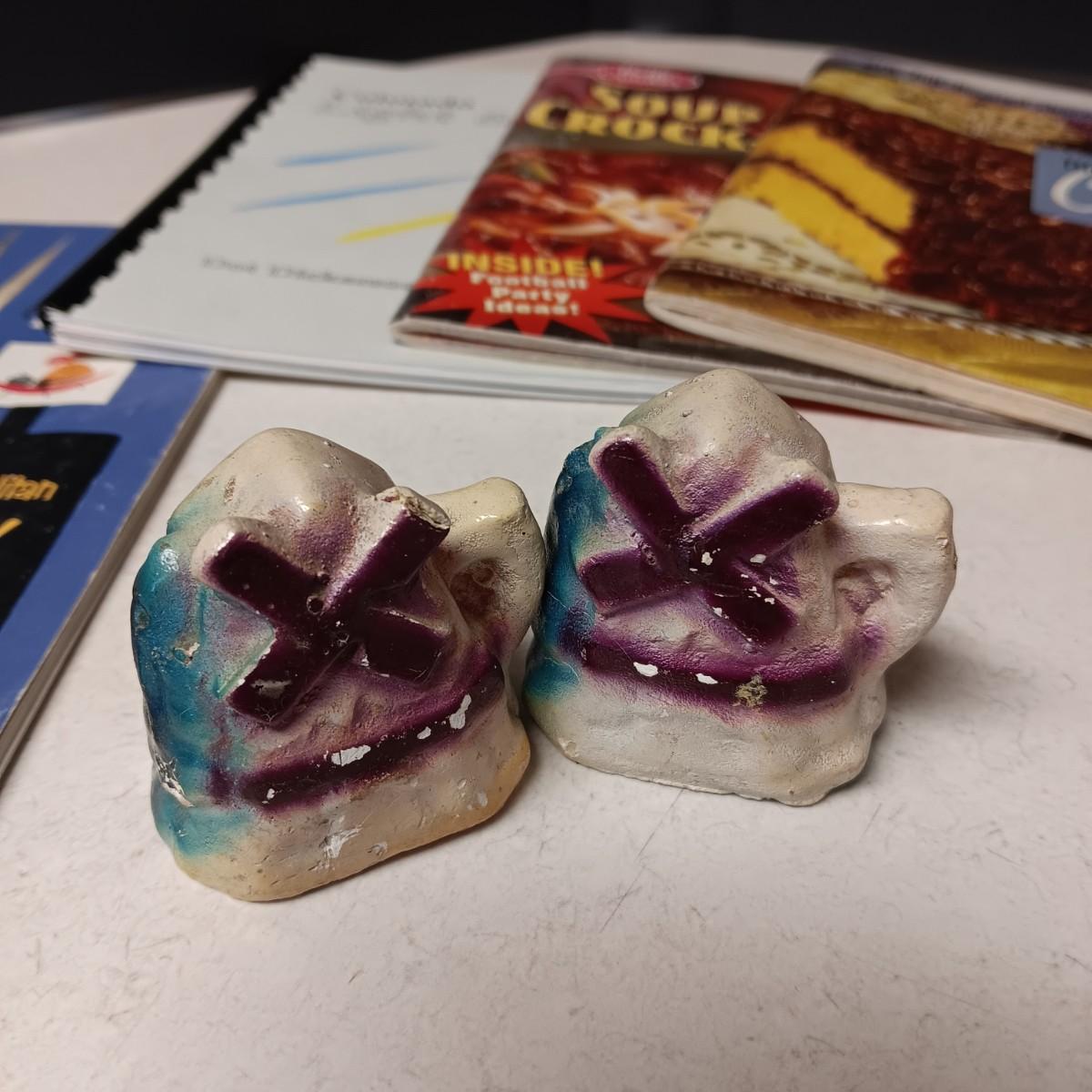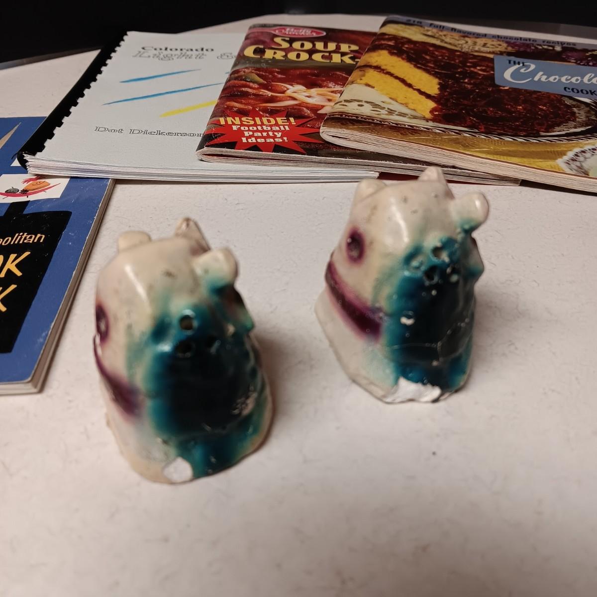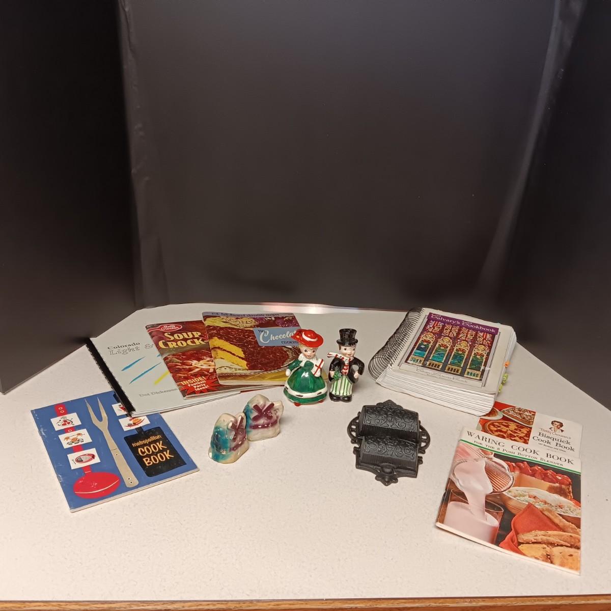 1935 CHALKWARE AND LEFTON SHAKERS, COOKBOOKS & CAST IRON MATCH HOLDER