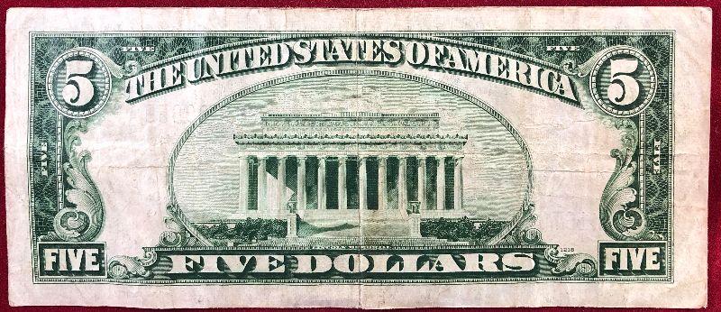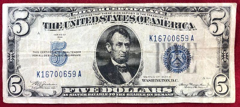 1935 Series A $5 Silver Certificate Blue Seal, circulated condition, has been folded. Shipping 3.95 anywhere in the US.