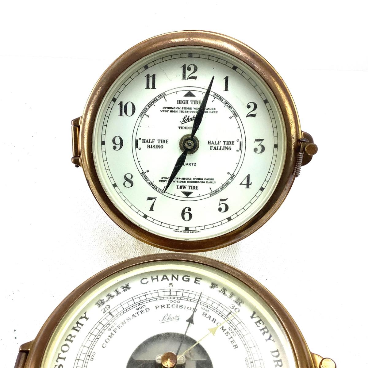 There is a Schatz Tide & Time and a Precision Barometer. They are 6" in diameter and 3.5" deep. There is some damage on one side that may be able to be polished out.