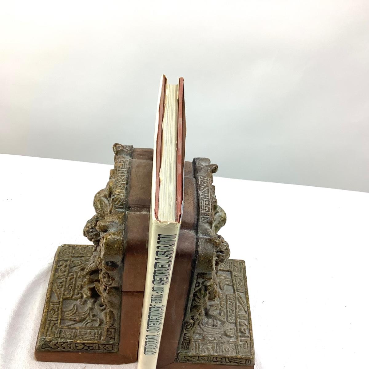The bookends are fragment sculpture marble and they measure 8" x 5" (4" deep). Included is the book Mysteries of the Ancient World.