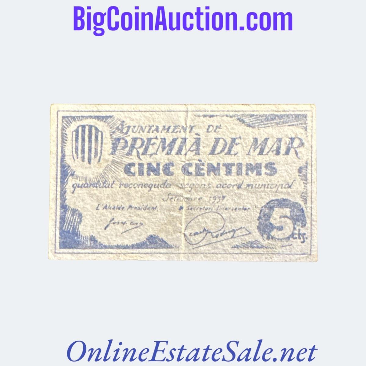 1937 SPAIN CIVIL WAR PRIMIA DE MAR 5 CENTIMS