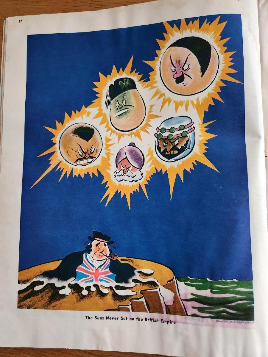 This auction lot is for a copy of the 1939 Ken Magazine - March 9th Edition. This magazine is the last of the 1st year of publication issues in the large format before it was decreased in size. This edition is in OK condition for an 85 year old magazine. Some light wrinkling and staining from storage moisture. The graphics are crisp and frameable. This magazine has about 86 pages. The center page is loose but in place and intact.