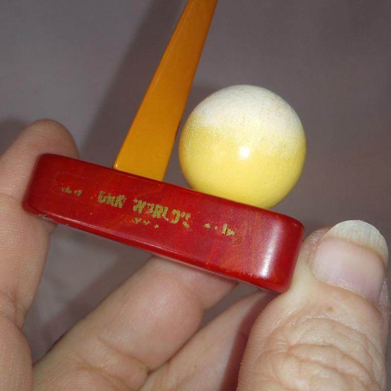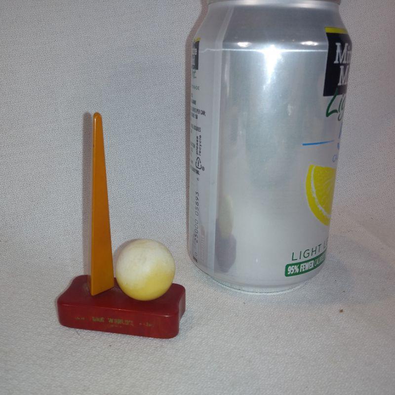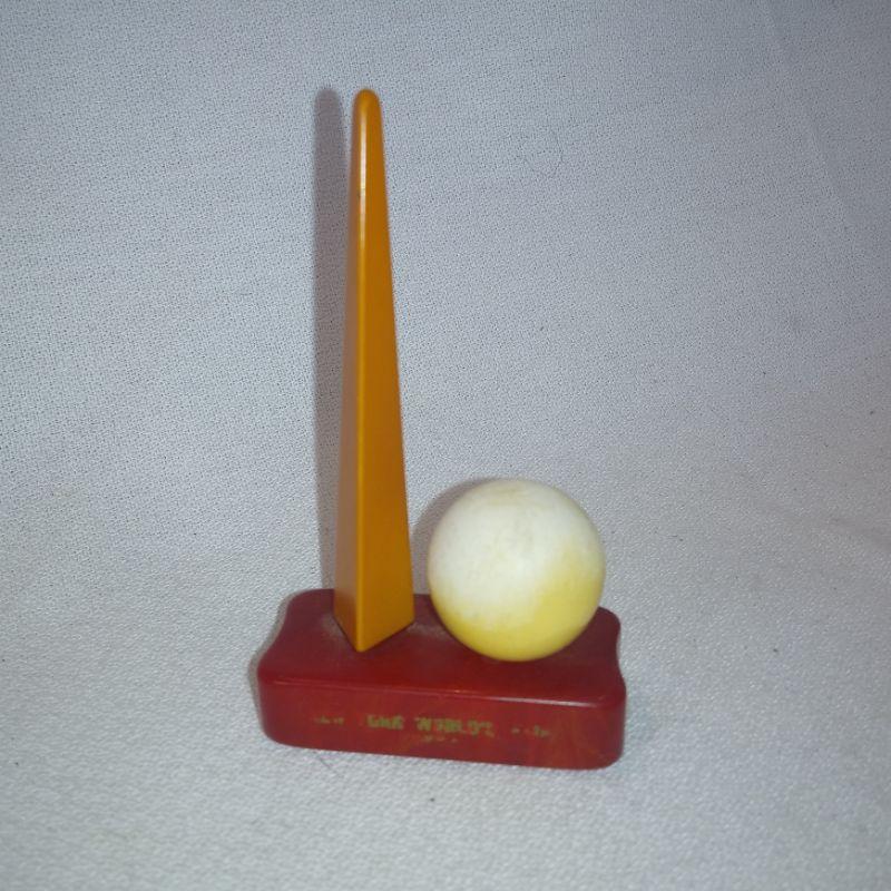This is a little Bakelite souvenir from the 1939 New York World's Fair. It is a small replica of the Trylon Perisphere. The print on the bottom from has some paint loss. Very neat. Exhibition collectors will prize this little gem.