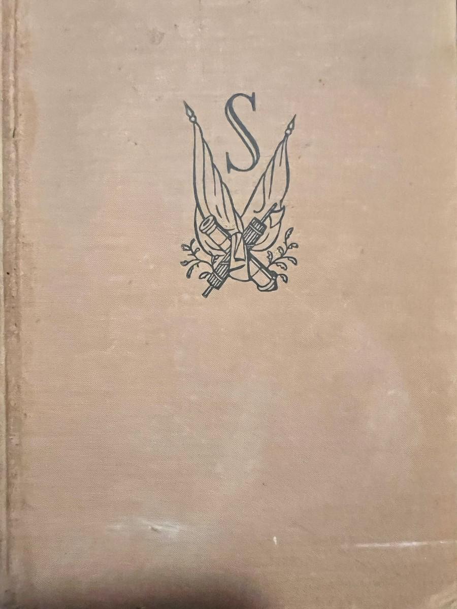 Tan cloth boards feature an embossed emblem on the front cover and a navy-and-gold spine label.