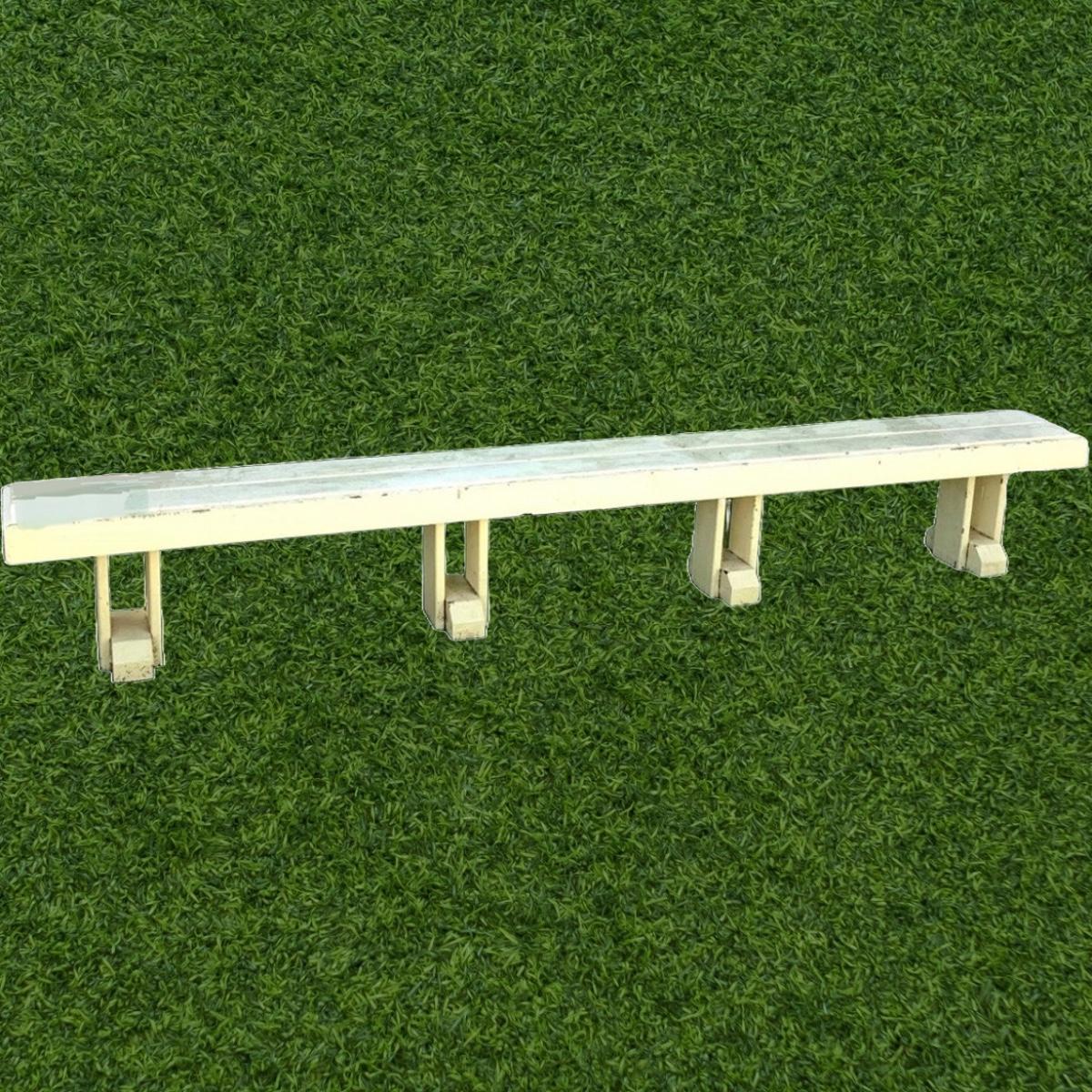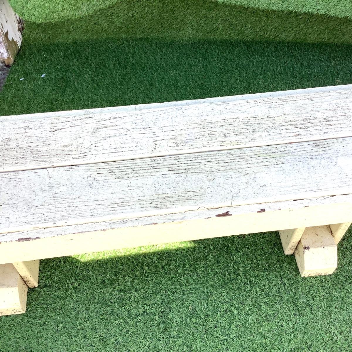 Pale Yellow Painted Wooden Bench with distressed and chipped paint. Measures 119"L, 12.5"W, 17"H.