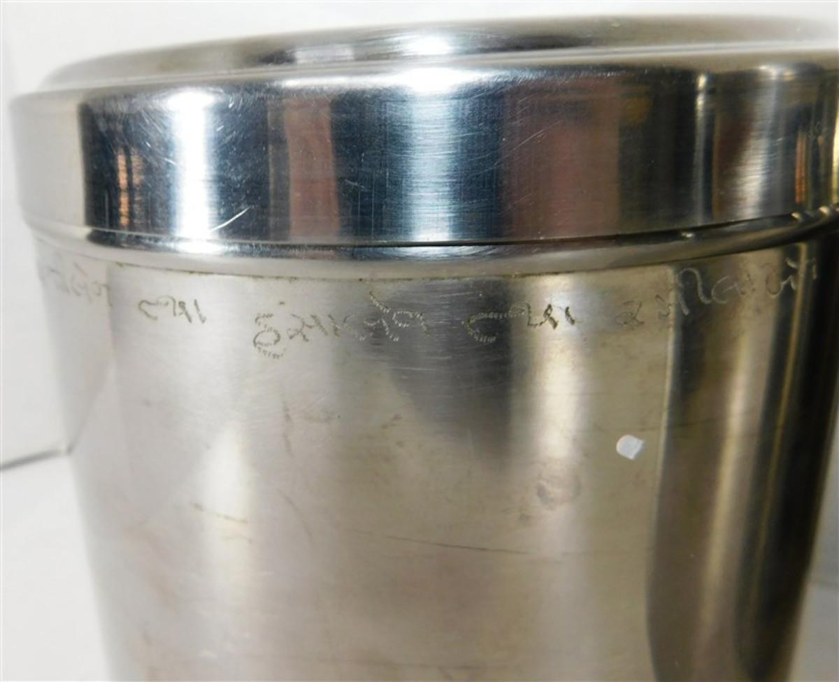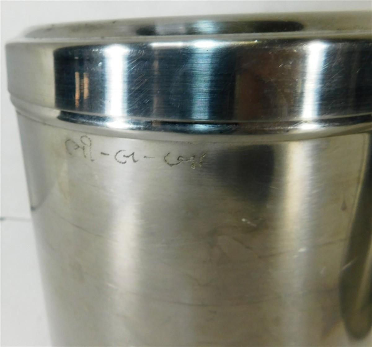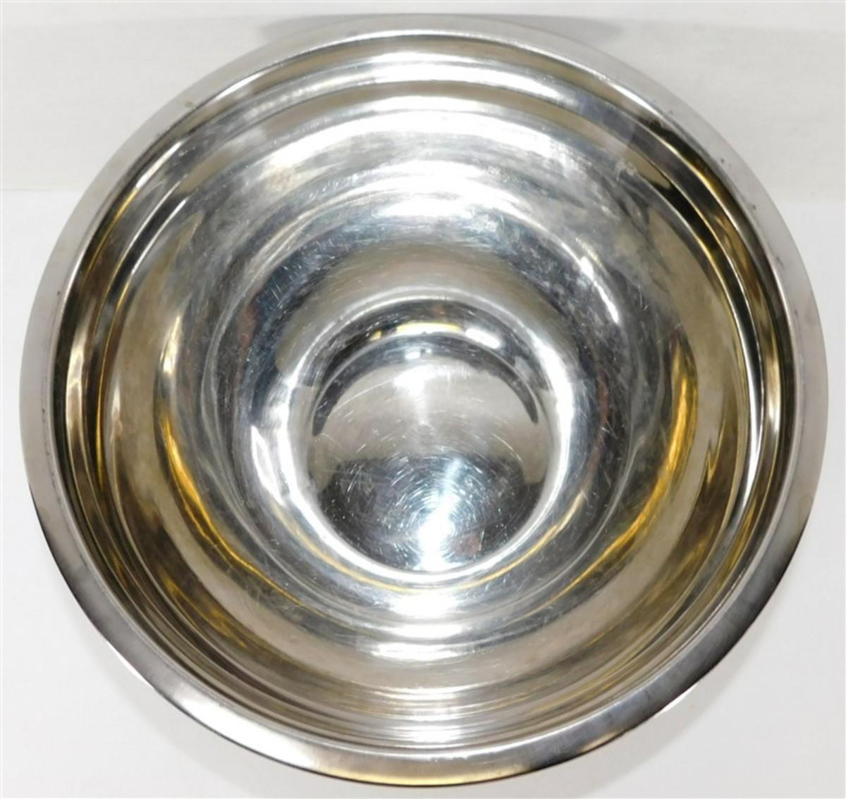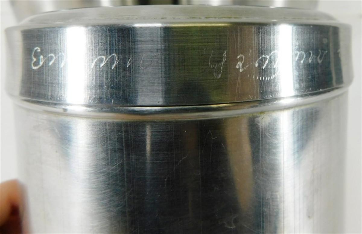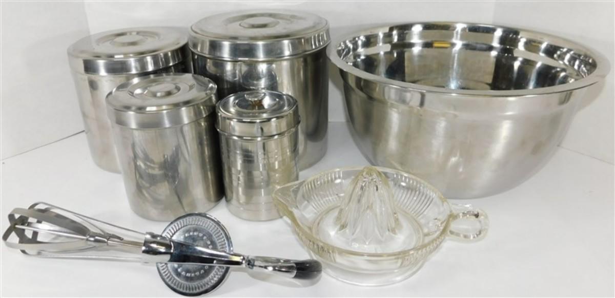 194 Lot of 7 Kitchen Items- Large Stainless Mixing Bowl 12"12" Vintage Flint Mixer- Lot 4 Stainless Storage Containers (small engraving on containers)- Glass Juicer Few Dings 8 x4