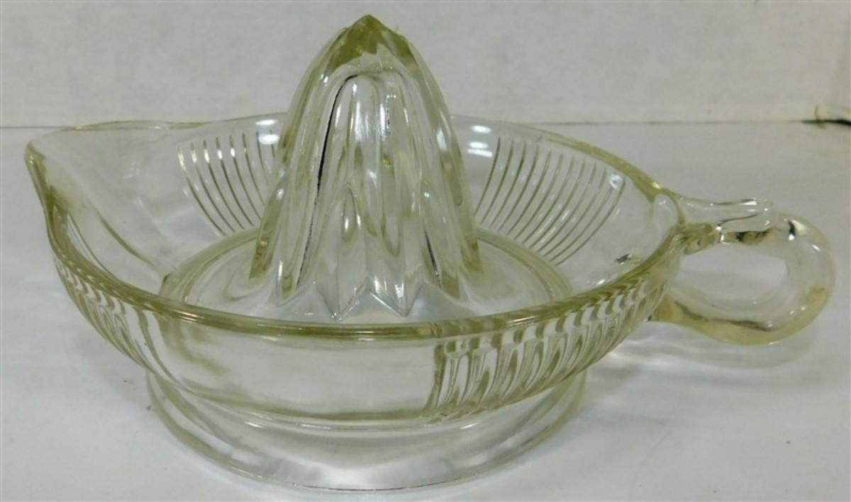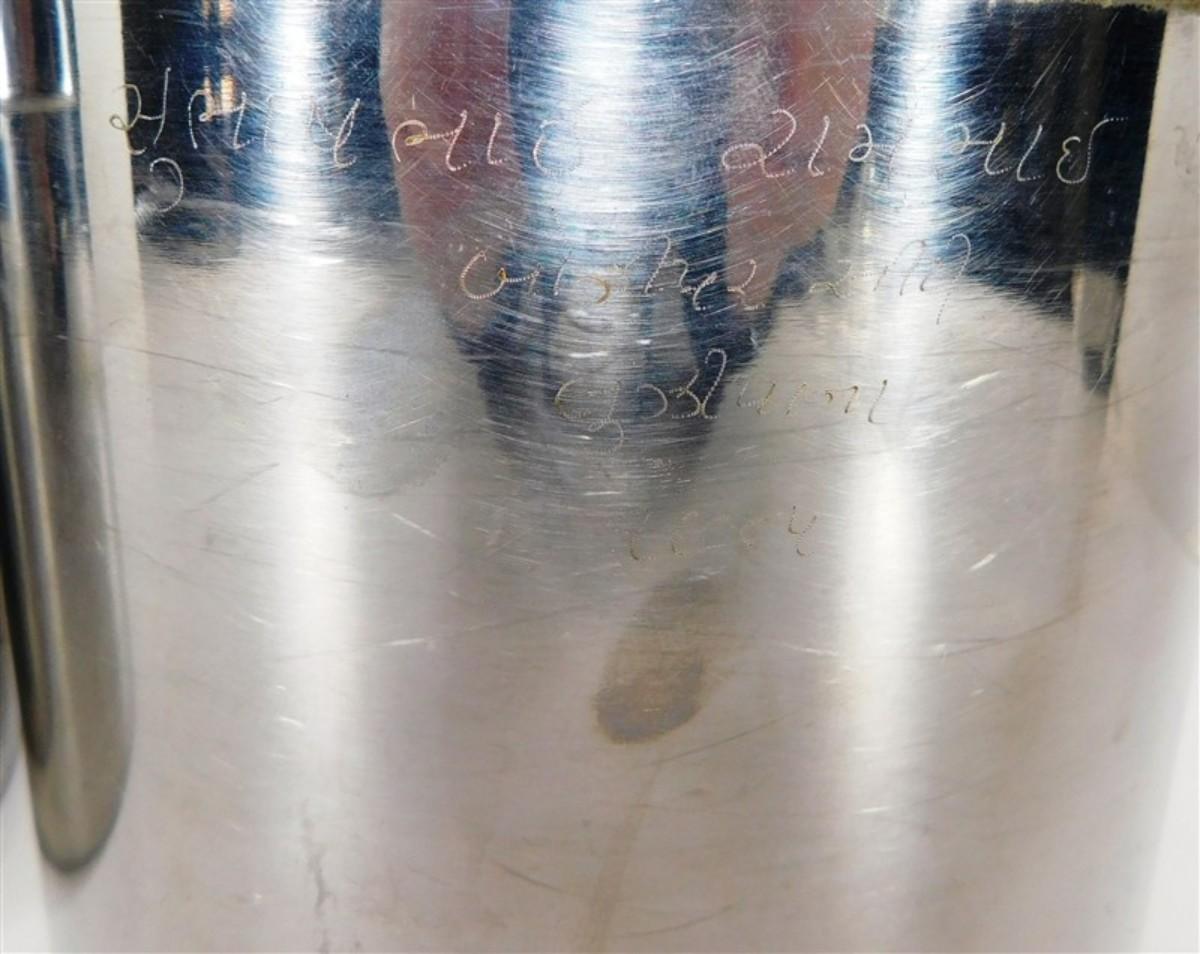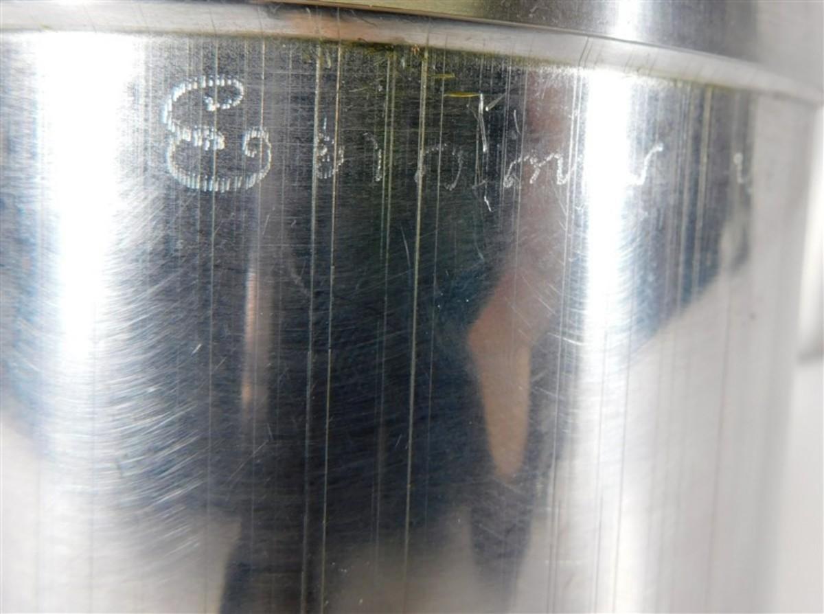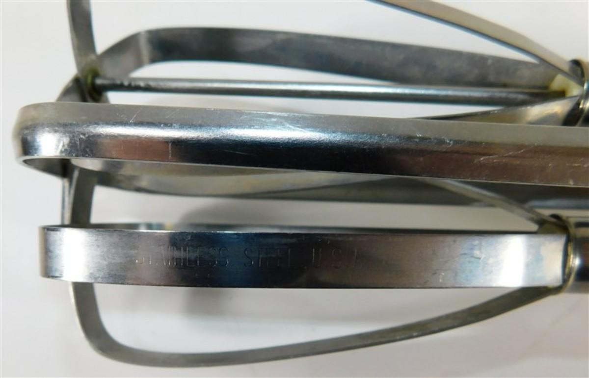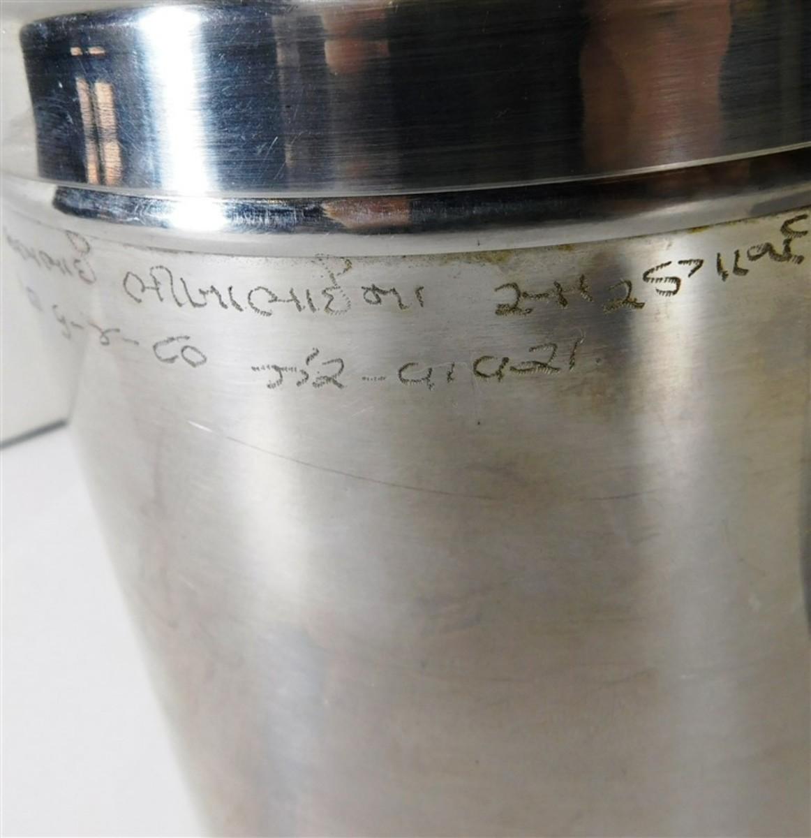 194 Lot of 7 Kitchen Items- Large Stainless Mixing Bowl 12"12" Vintage Flint Mixer- Lot 4 Stainless Storage Containers (small engraving on containers)- Glass Juicer Few Dings 8 x4