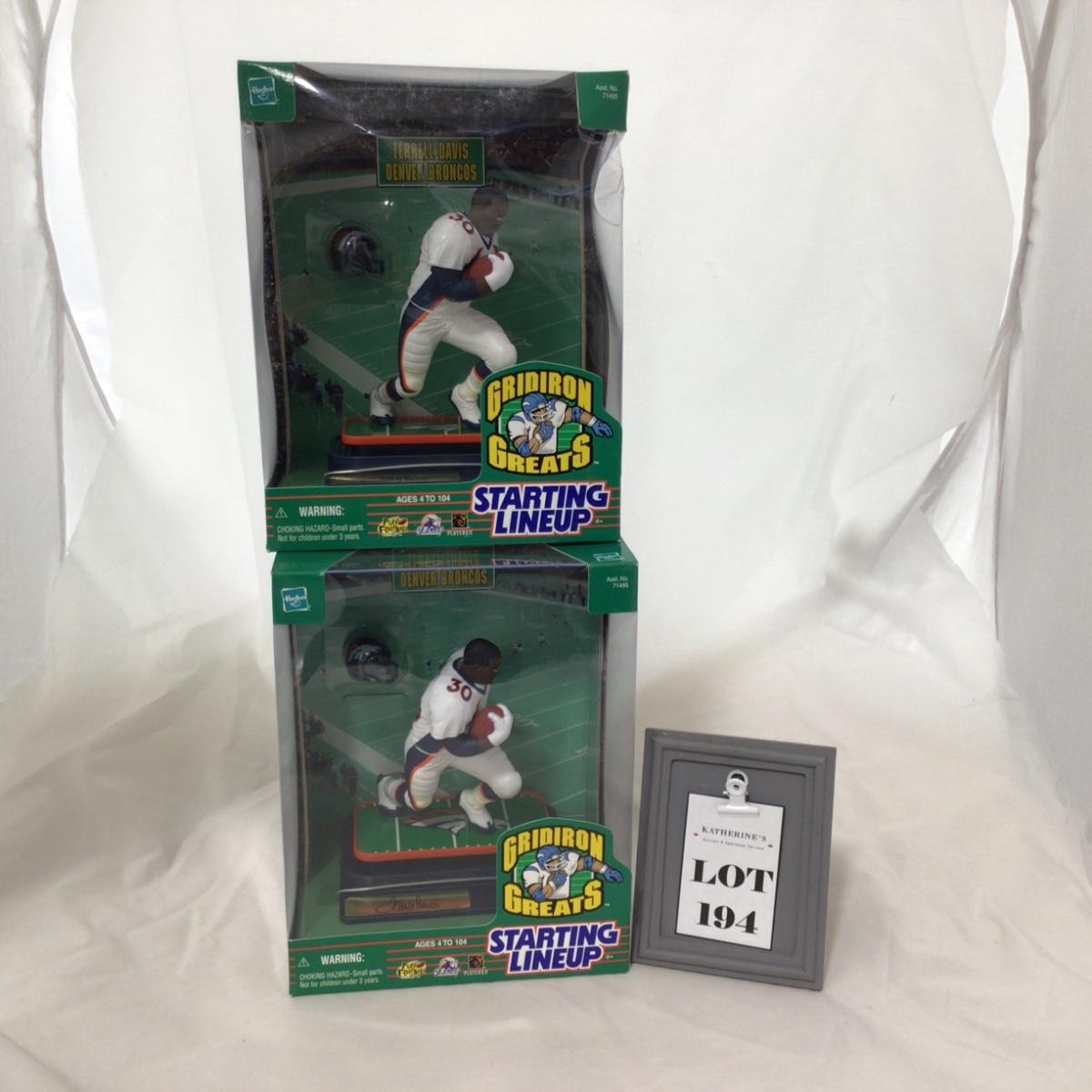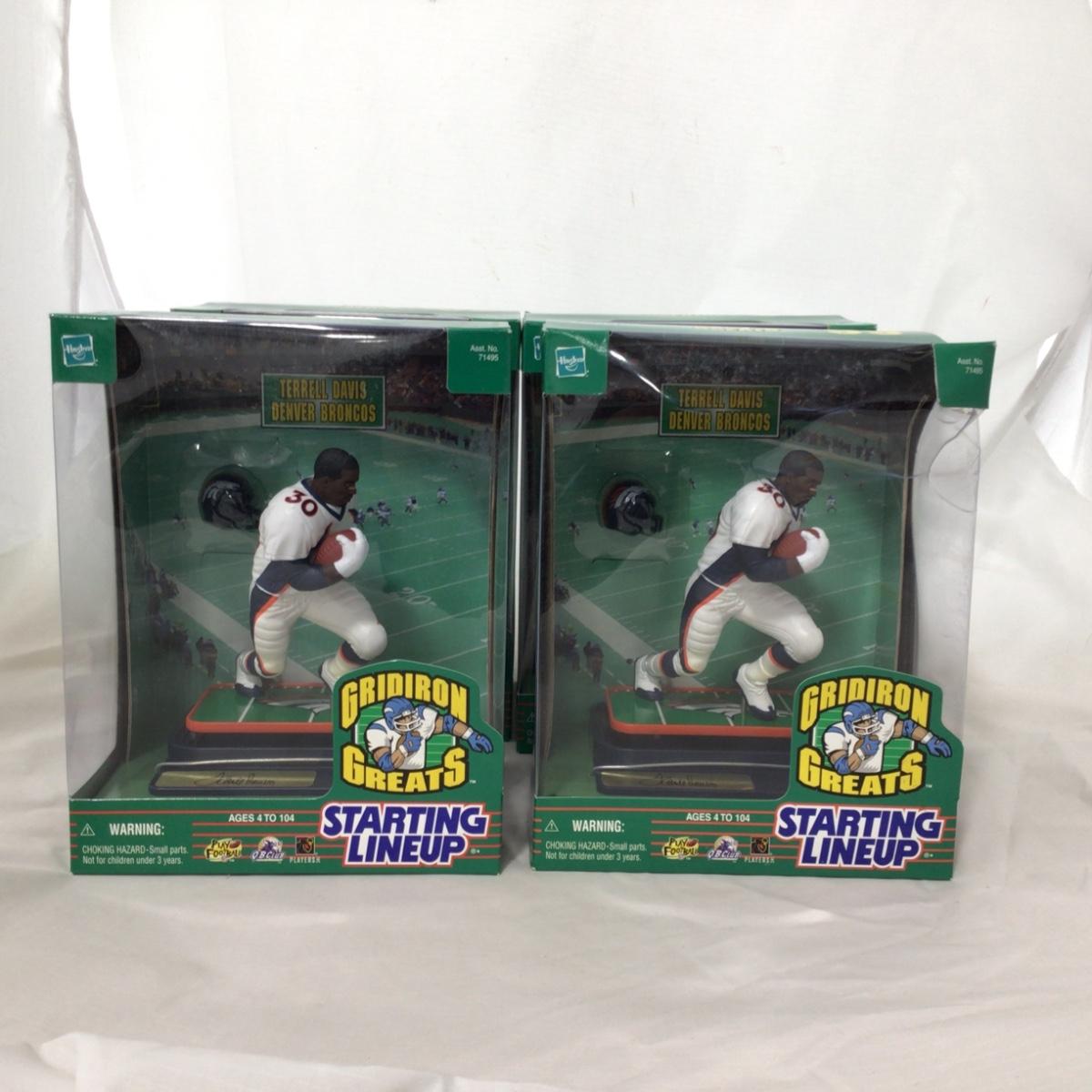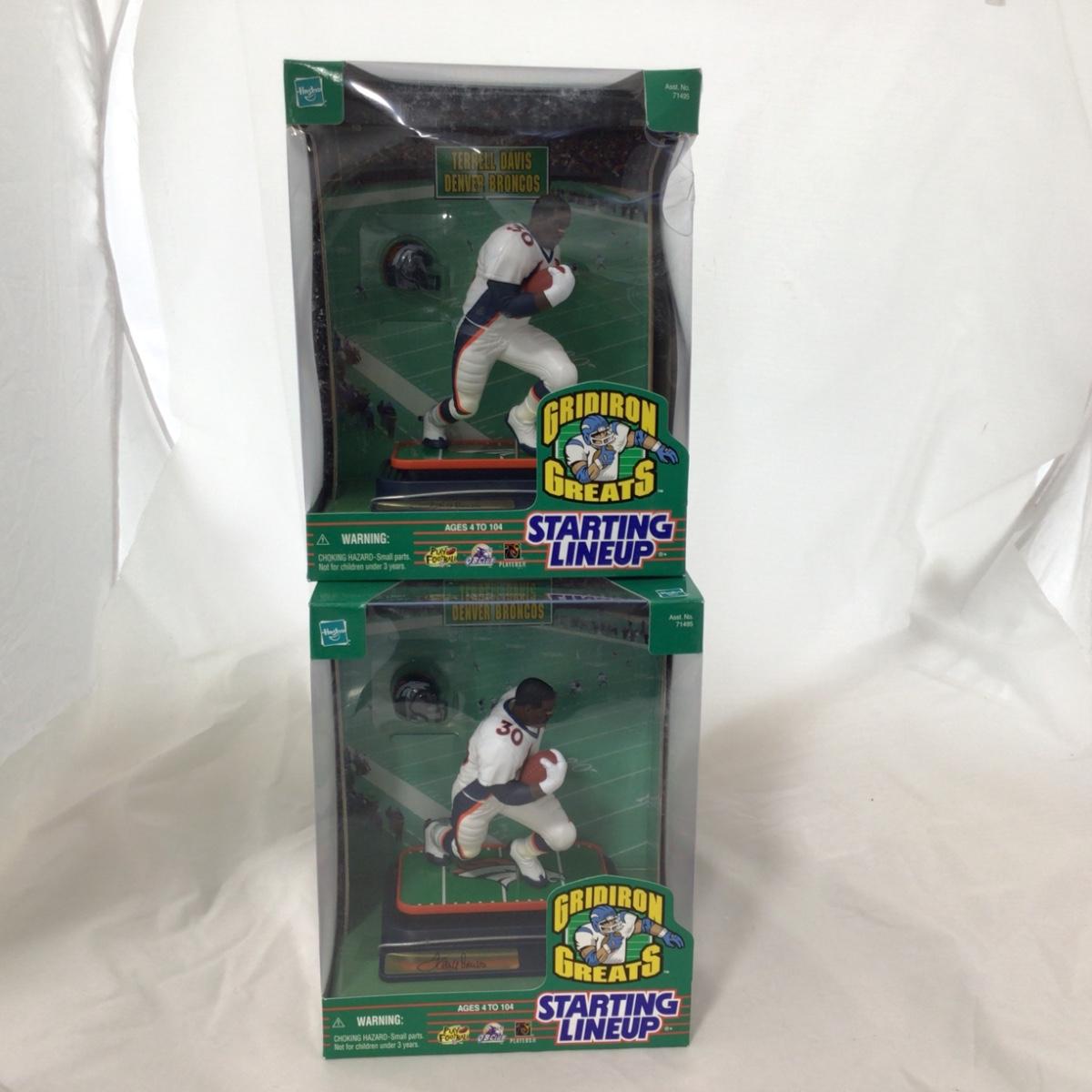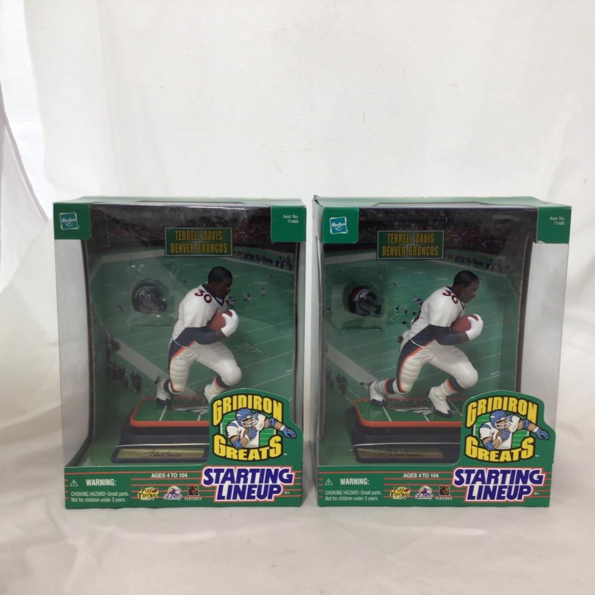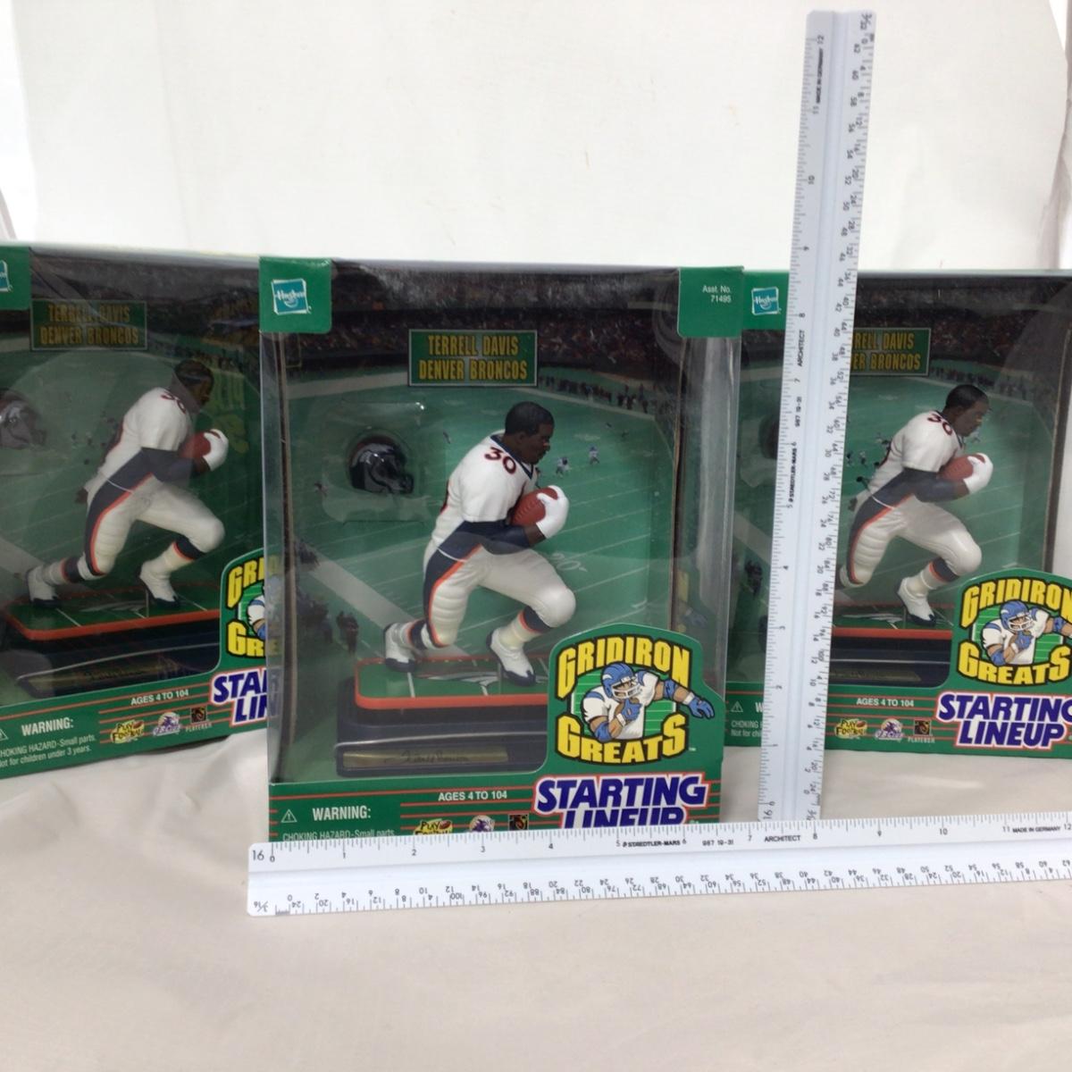 Four starting lineups gridiron greats figures of Broncos #30 Terrell Davis. Please see photos for details and condition. ::: Shipping is available on this lot. If you require shipping you must let us know at the close of the auction. We will coordinate with you after the item has been won. Shipping fees will include insurance up to or exceeding the value of all items being mailed. If you have any questions regarding this lot please contact the auctioneer either via this website, by direct email or by phone. PICK UP TIMES and other important information can be found in the TERMS and DESCRIPTION of the auction. Please take a look for pertinent information. Thanks!