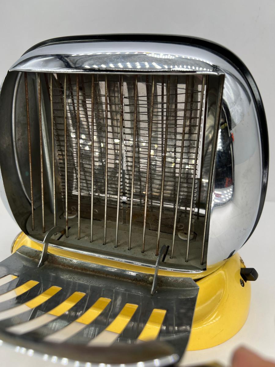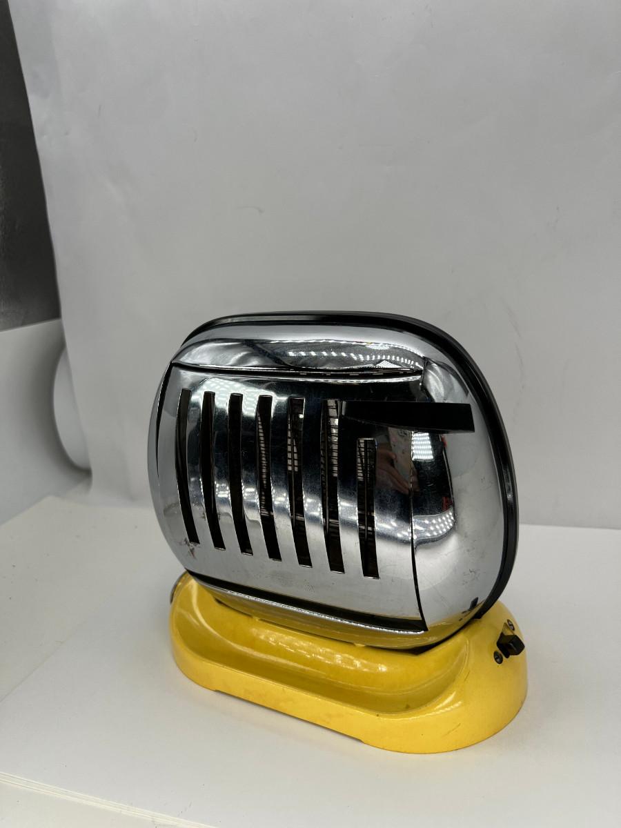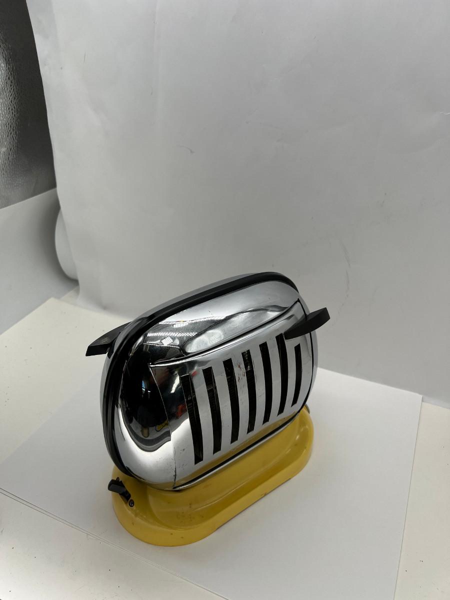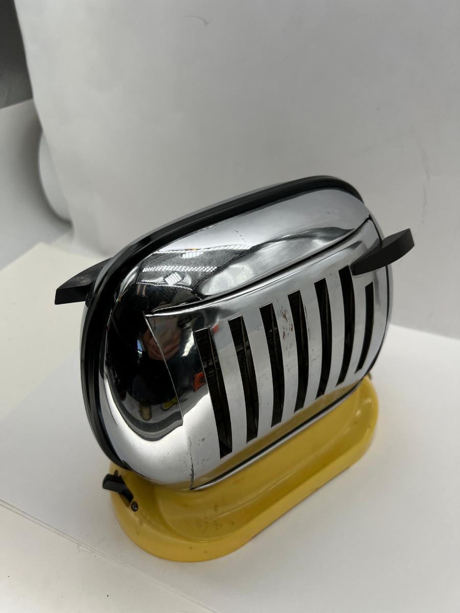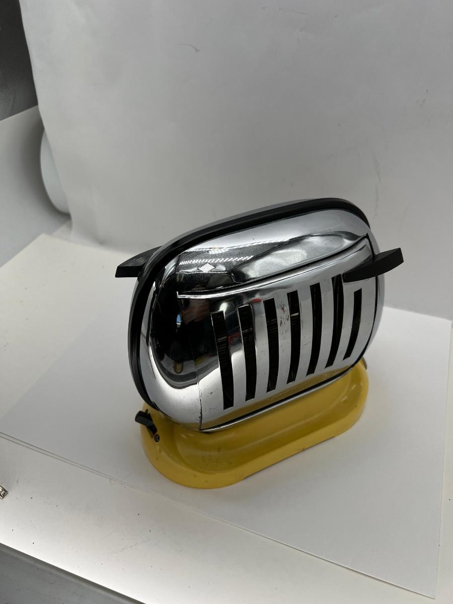 This is the toaster you are missing in your collection! Chrome-plated toaster 'Maybaum Type 581' with side flaps; base in yellow melamine. Unit is being sold as a "non-working" vintage electronic device that should be gone over by a qualified technician prior to use. Good condition with some slight finish faults, cord is missing.