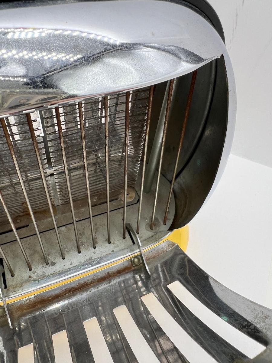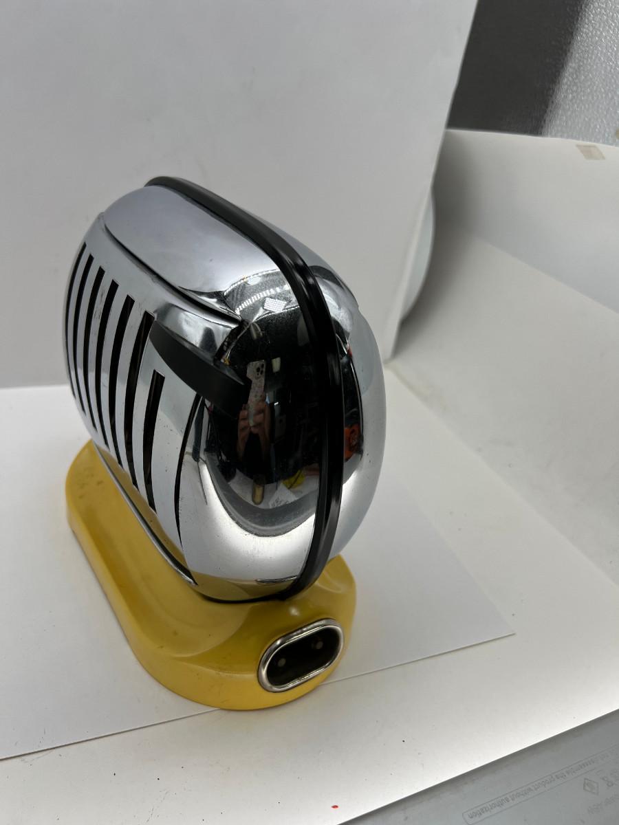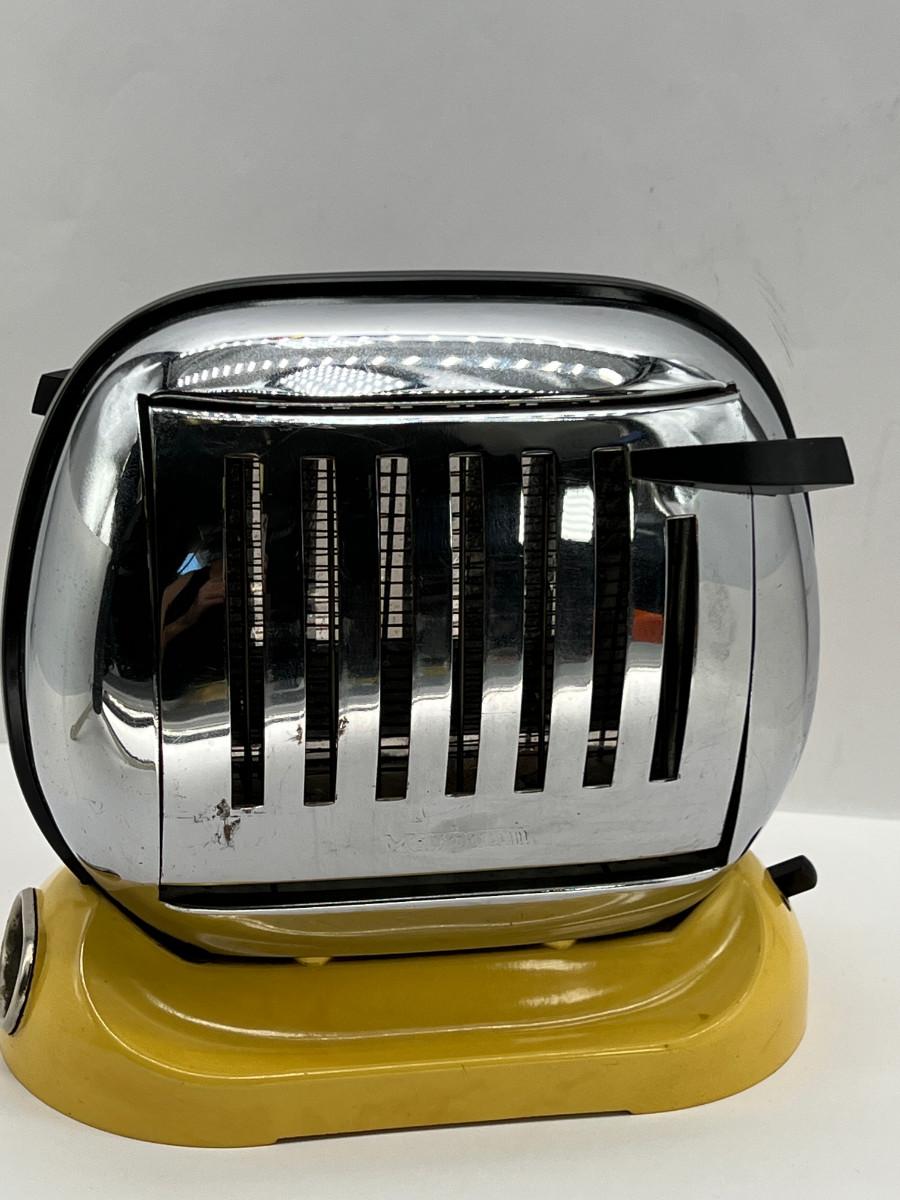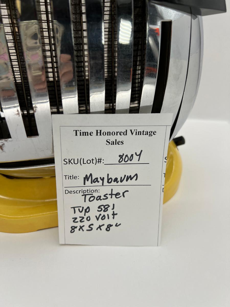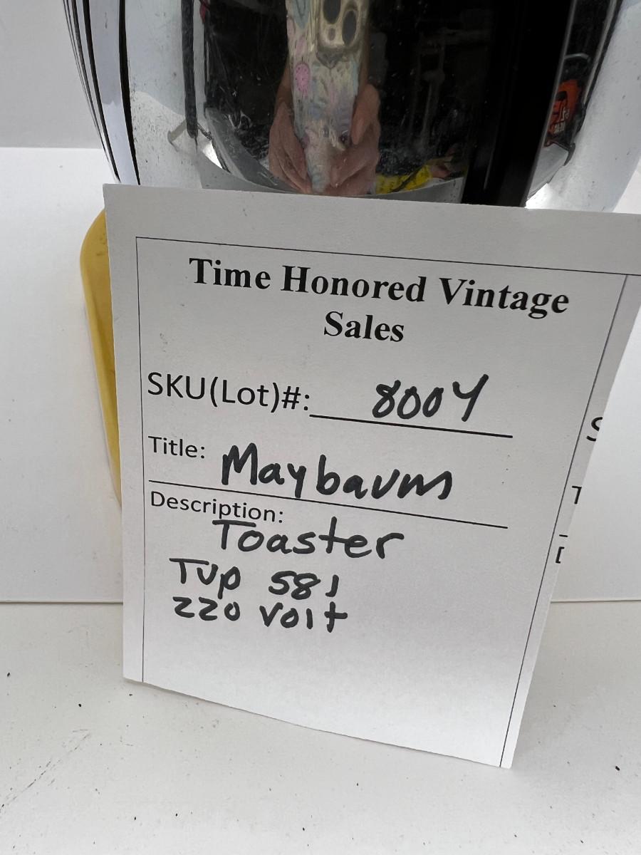 This is the toaster you are missing in your collection! Chrome-plated toaster 'Maybaum Type 581' with side flaps; base in yellow melamine. Unit is being sold as a "non-working" vintage electronic device that should be gone over by a qualified technician prior to use. Good condition with some slight finish faults, cord is missing.
