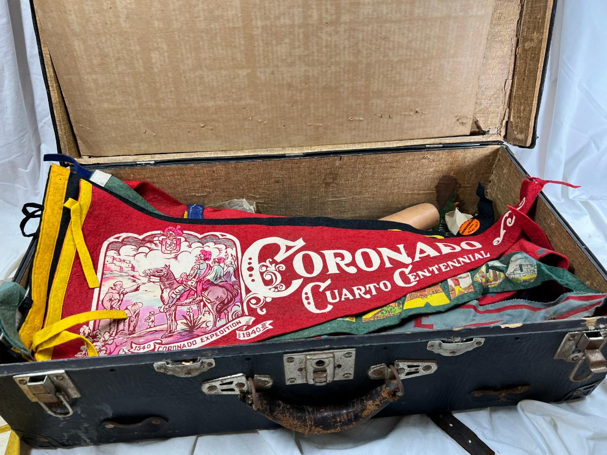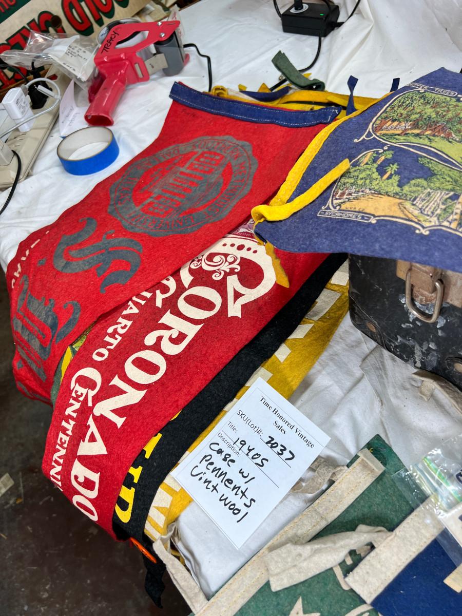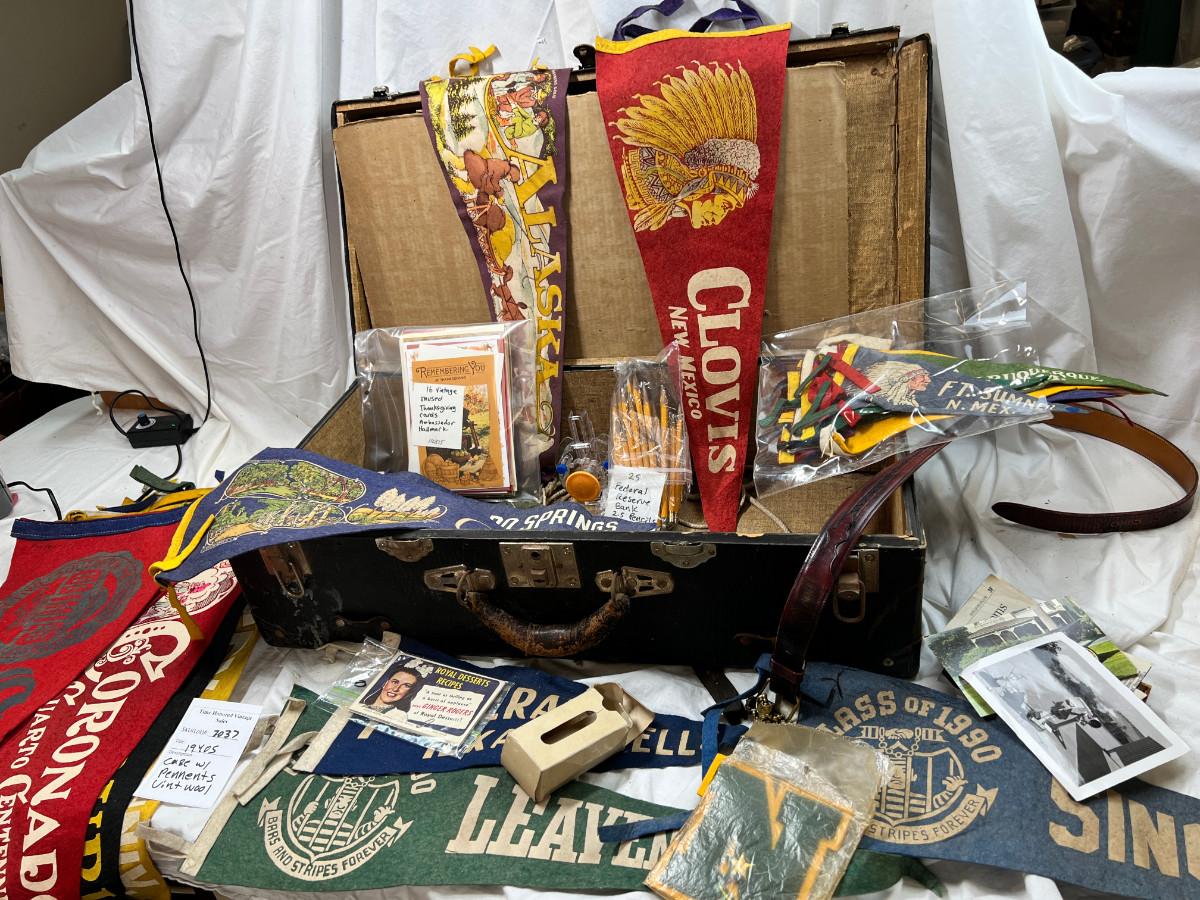 Antique Wool pennants large and small in a 1940s suitcase. Most of the pennants are in good shape with the occasional hole or dirt. This collection has many states and universities, sports teams. There is also a bag full of mini pennants. The case itself is in rough shape. Defiantly from the 40s. I got this out of a storage locker that had been sealed for over 20 years, and the gentleman who owned it was military. Did he get these on his travels with this trunk?