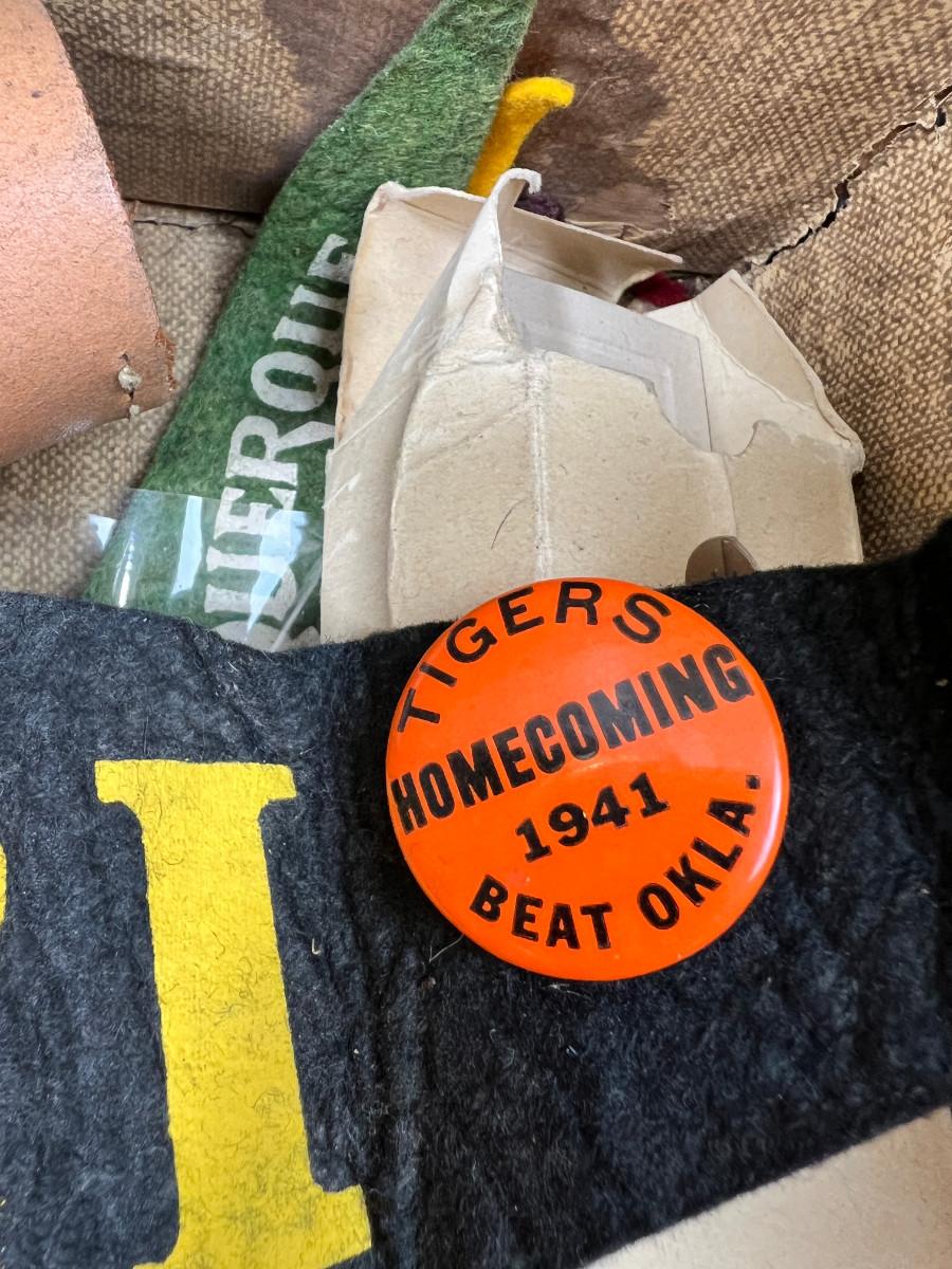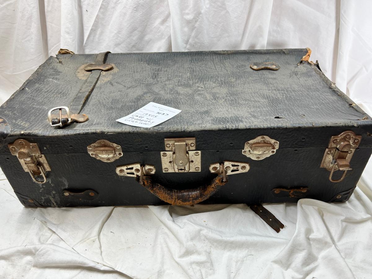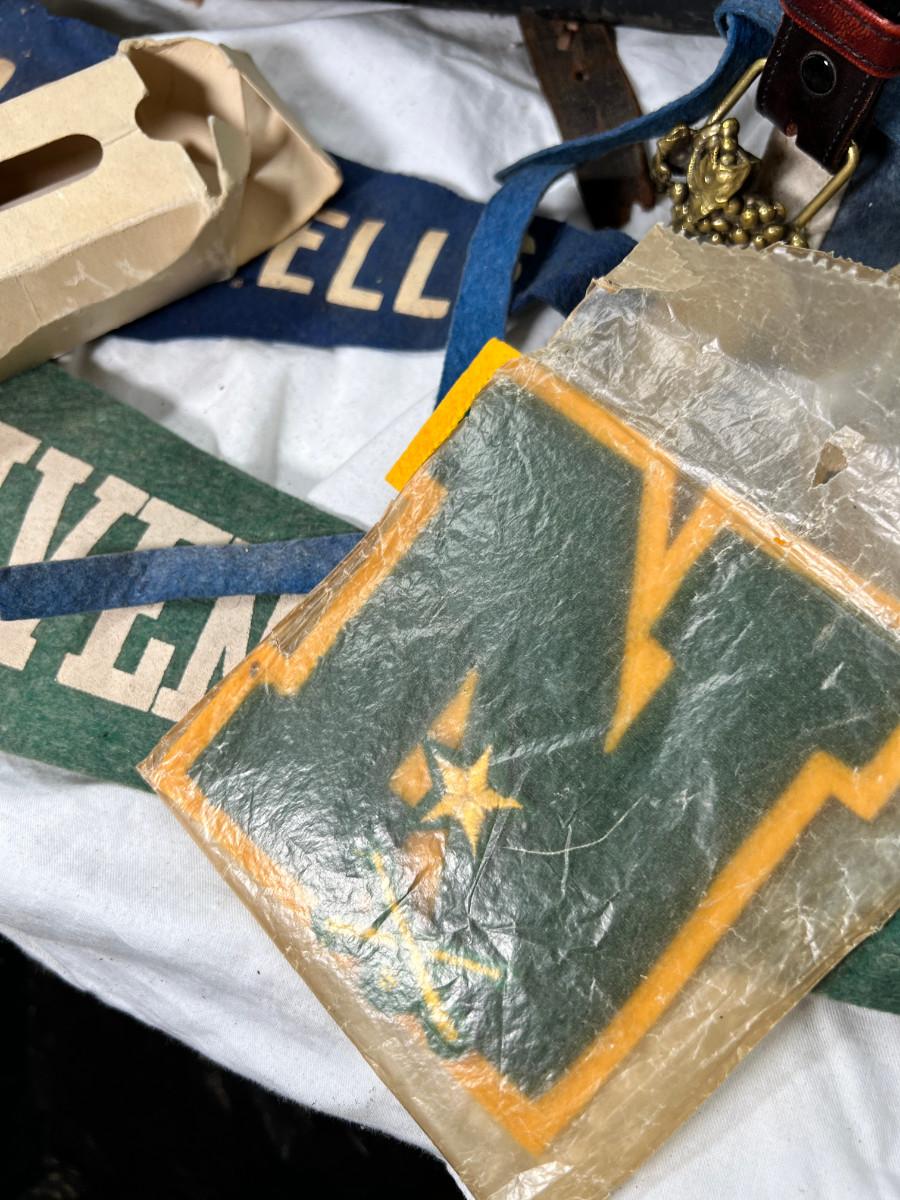 Antique Wool pennants large and small in a 1940s suitcase. Most of the pennants are in good shape with the occasional hole or dirt. This collection has many states and universities, sports teams. There is also a bag full of mini pennants. The case itself is in rough shape. Defiantly from the 40s. I got this out of a storage locker that had been sealed for over 20 years, and the gentleman who owned it was military. Did he get these on his travels with this trunk?