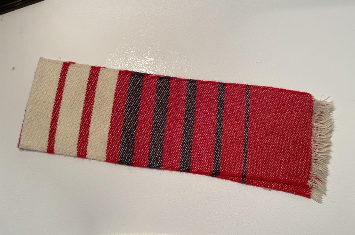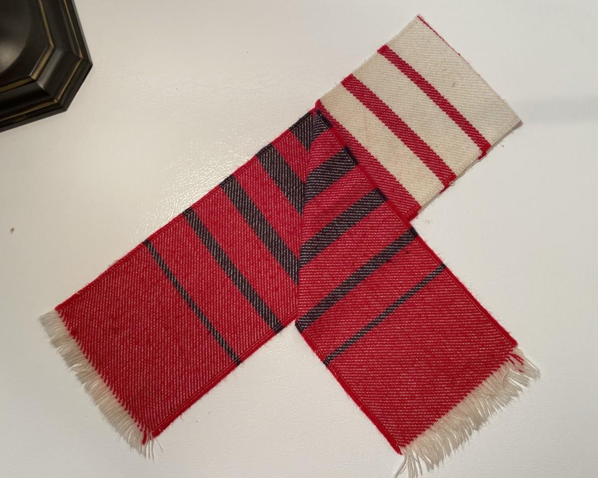 This is such a soft scarf although it is made of what appears to be wool. It is about 36 inches long and about 5.5 inches wide in excellent condition.