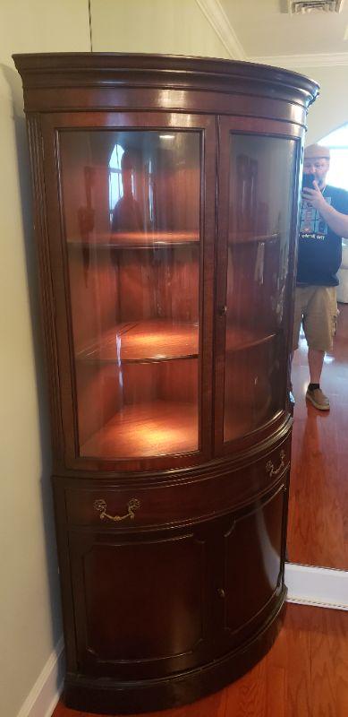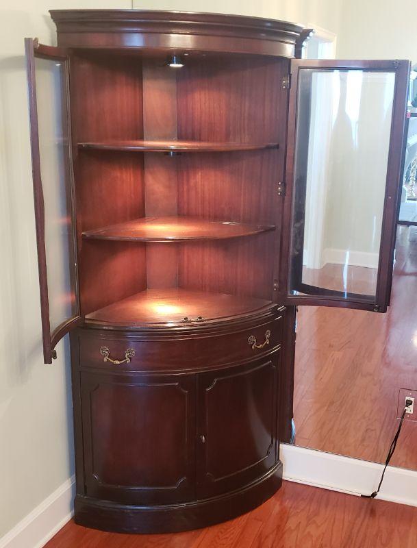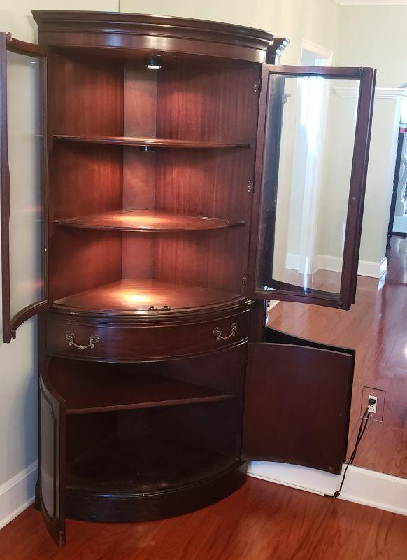 1940s Curved Glass Demilune Form Mahogany Corner China Cabinet from the White Fine Furniture Company, 6 H