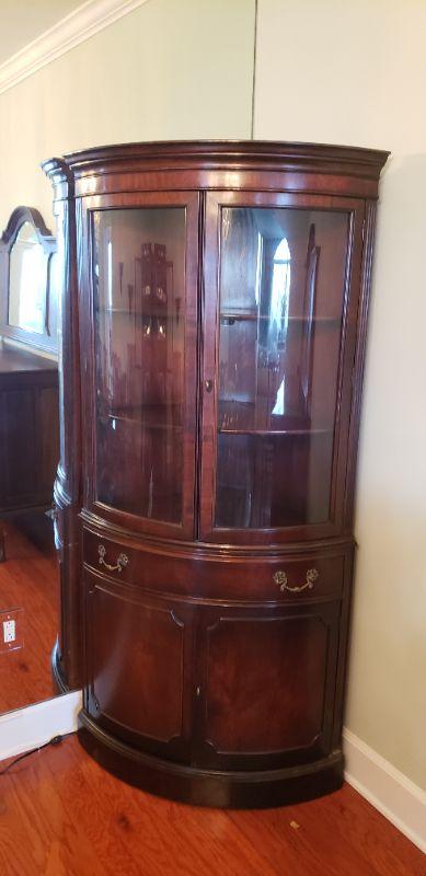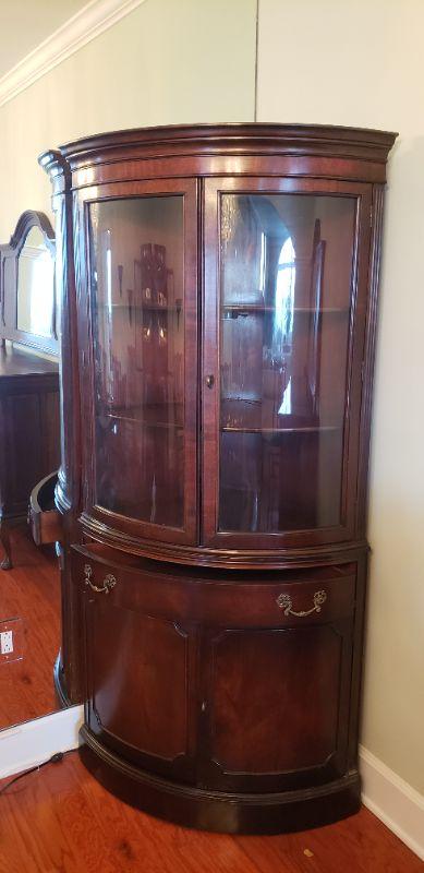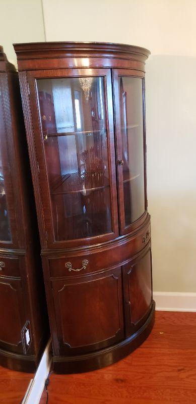 1940s Curved Glass Demilune Form Mahogany Corner China Cabinet from the White Fine Furniture Company, 6 H