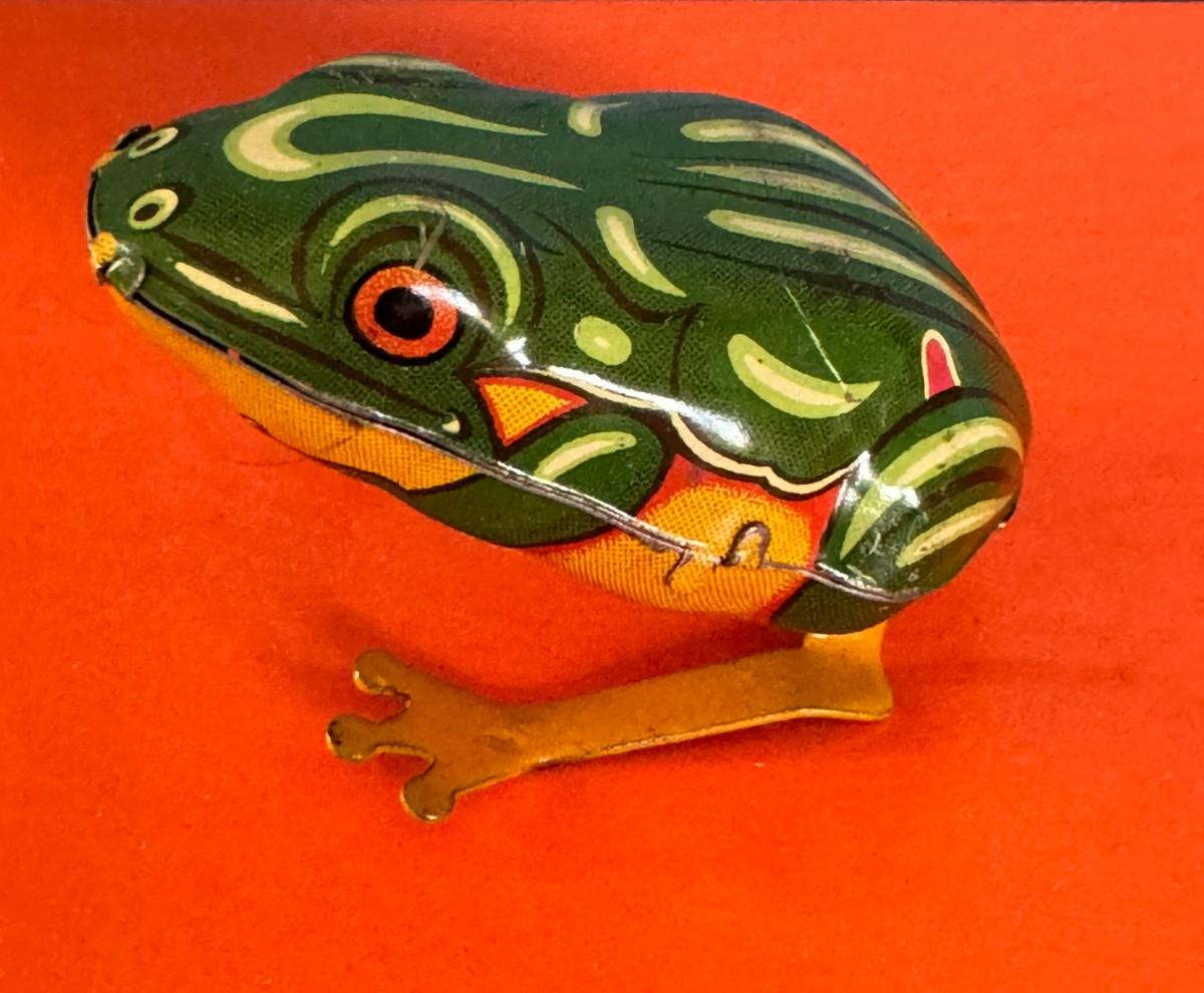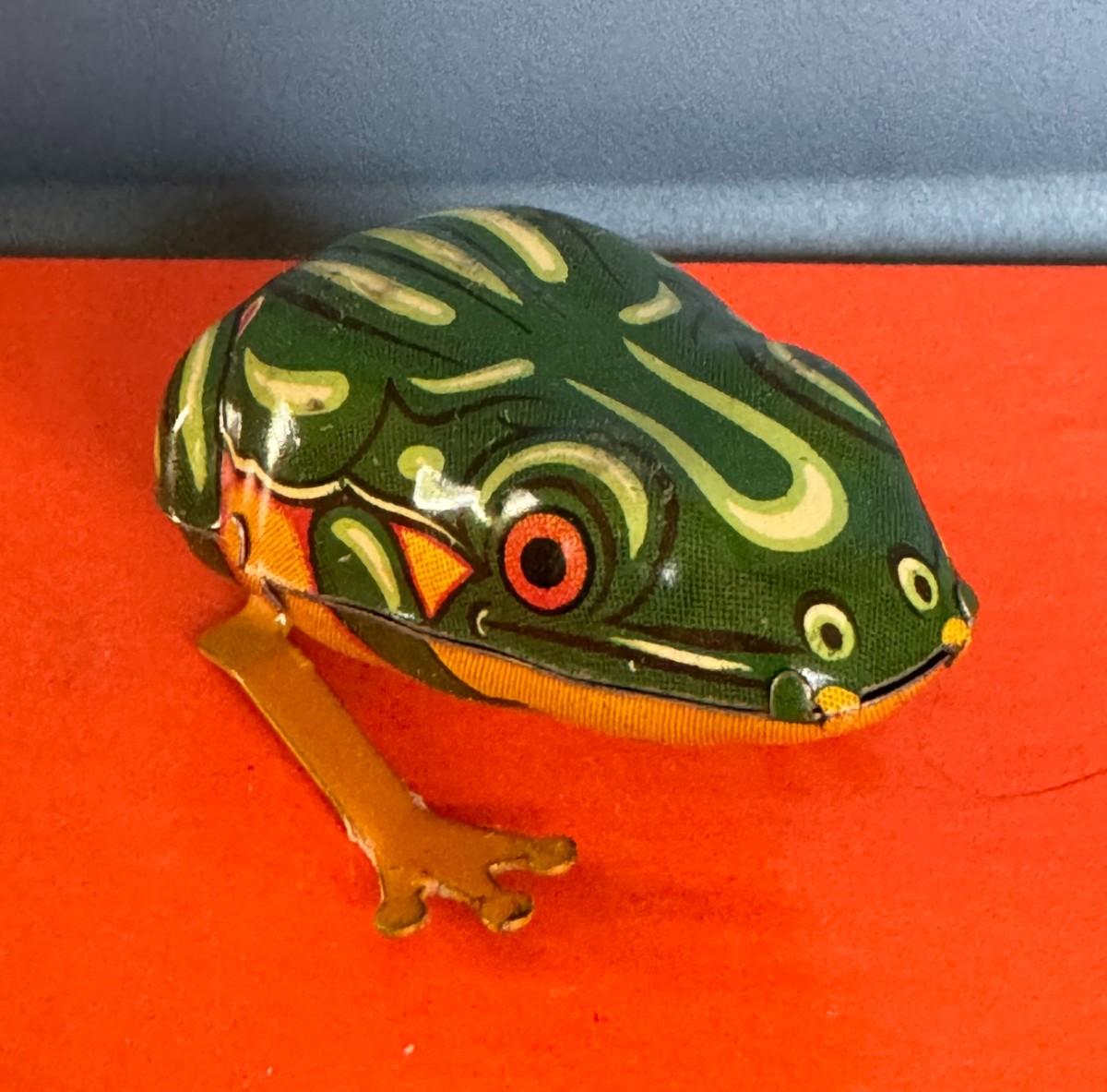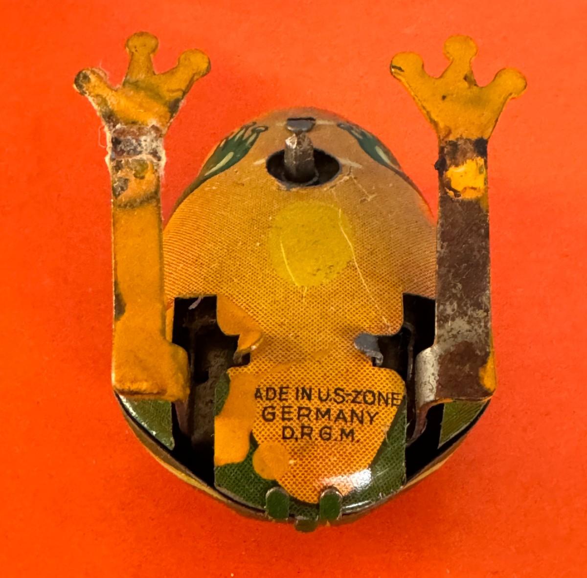 The image shows a vintage tin wind-up frog toy made in US Zone Germany in the 1940s.