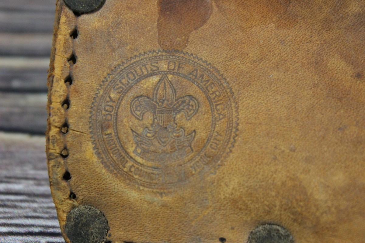 13" Official Boy Scouts hatchet, there is some natural ware throughout the whole piece. The leather sheath measures 5" across and one of the straps is ripped.