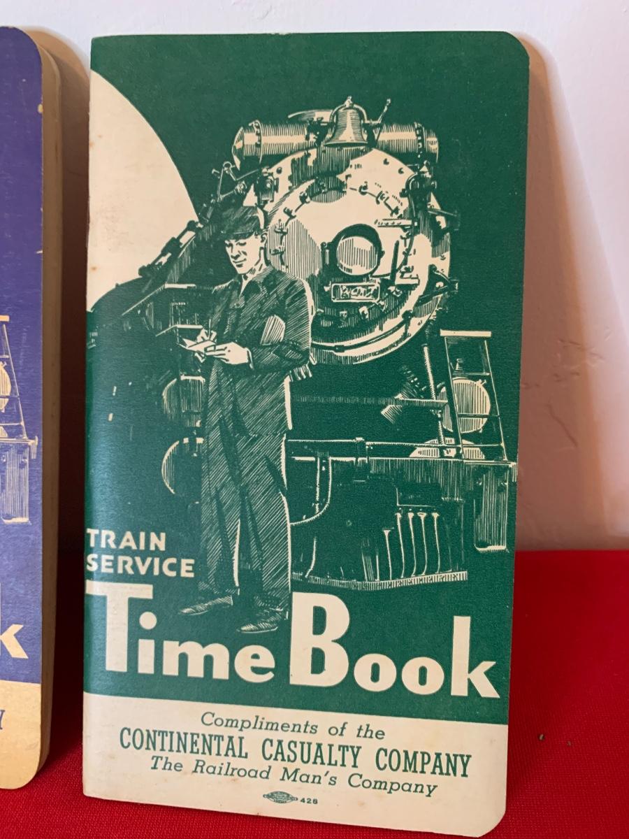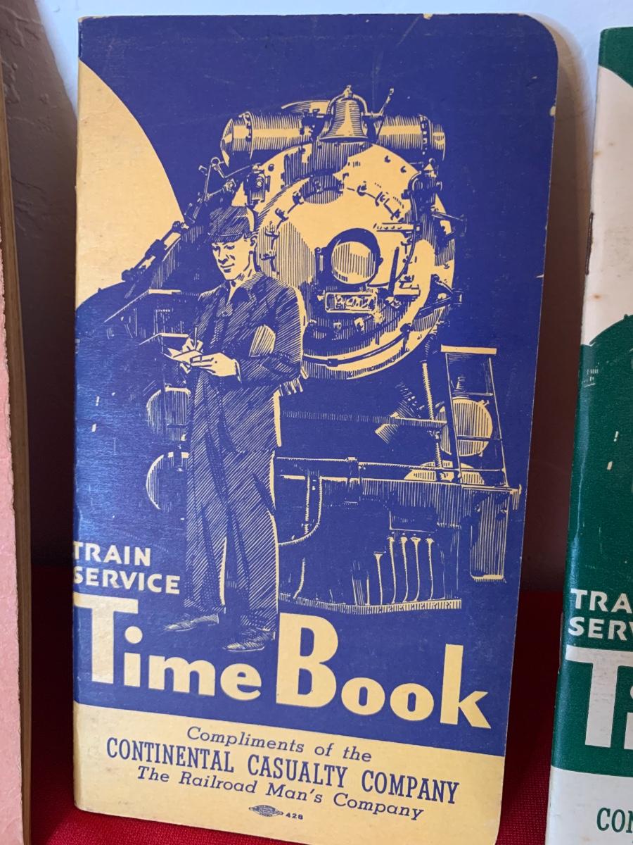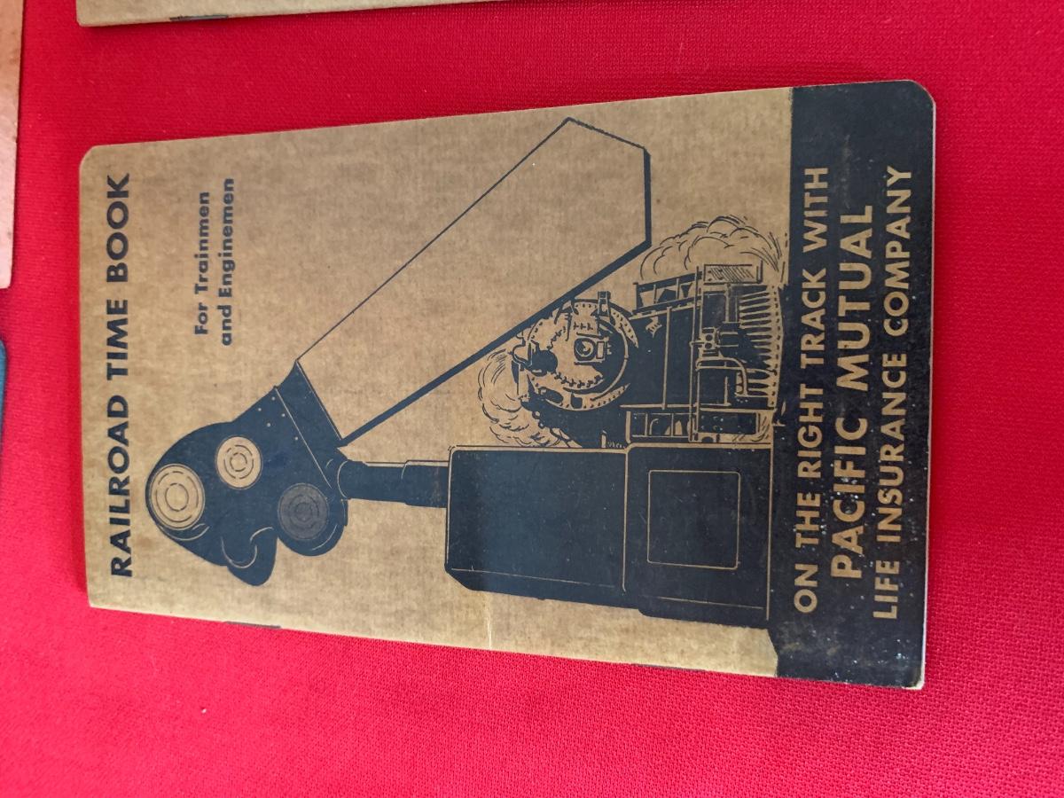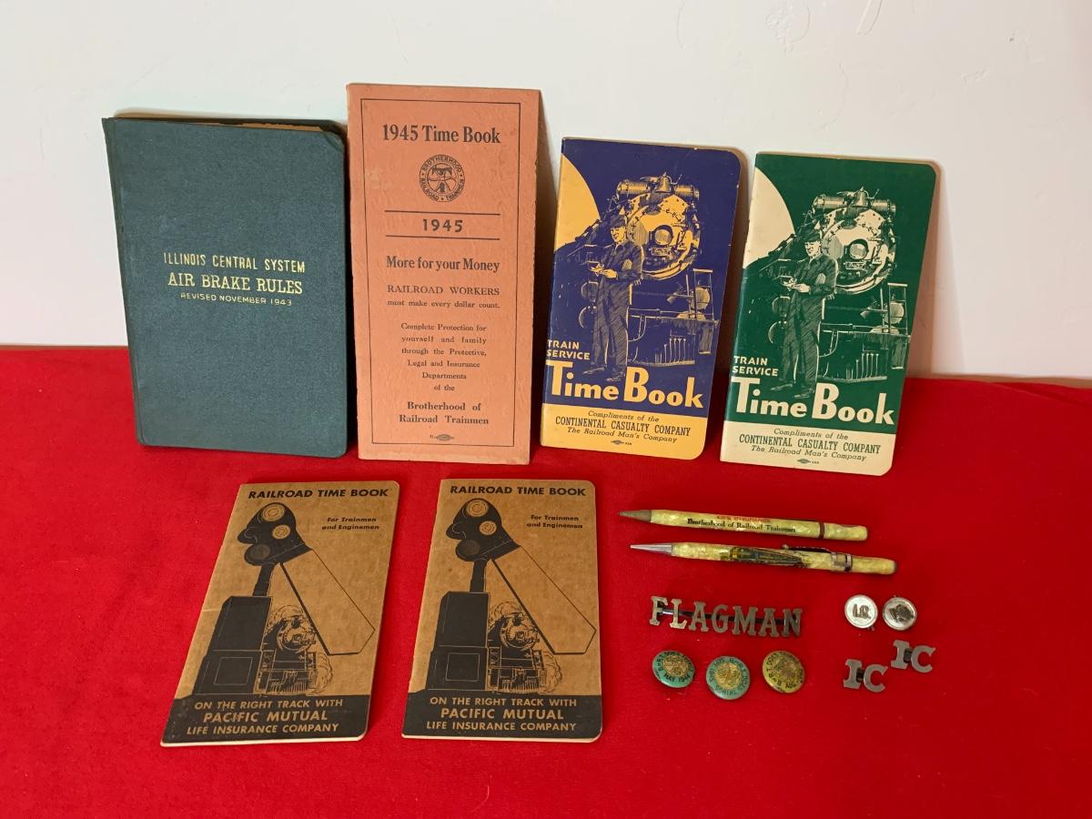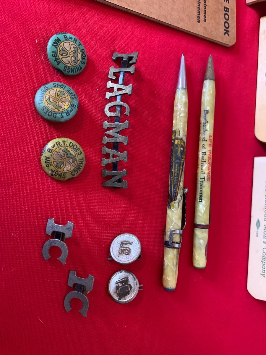 1943 RR Break Rules Book, 1945 Time Book and others, two RR pencils, buttons and pins.