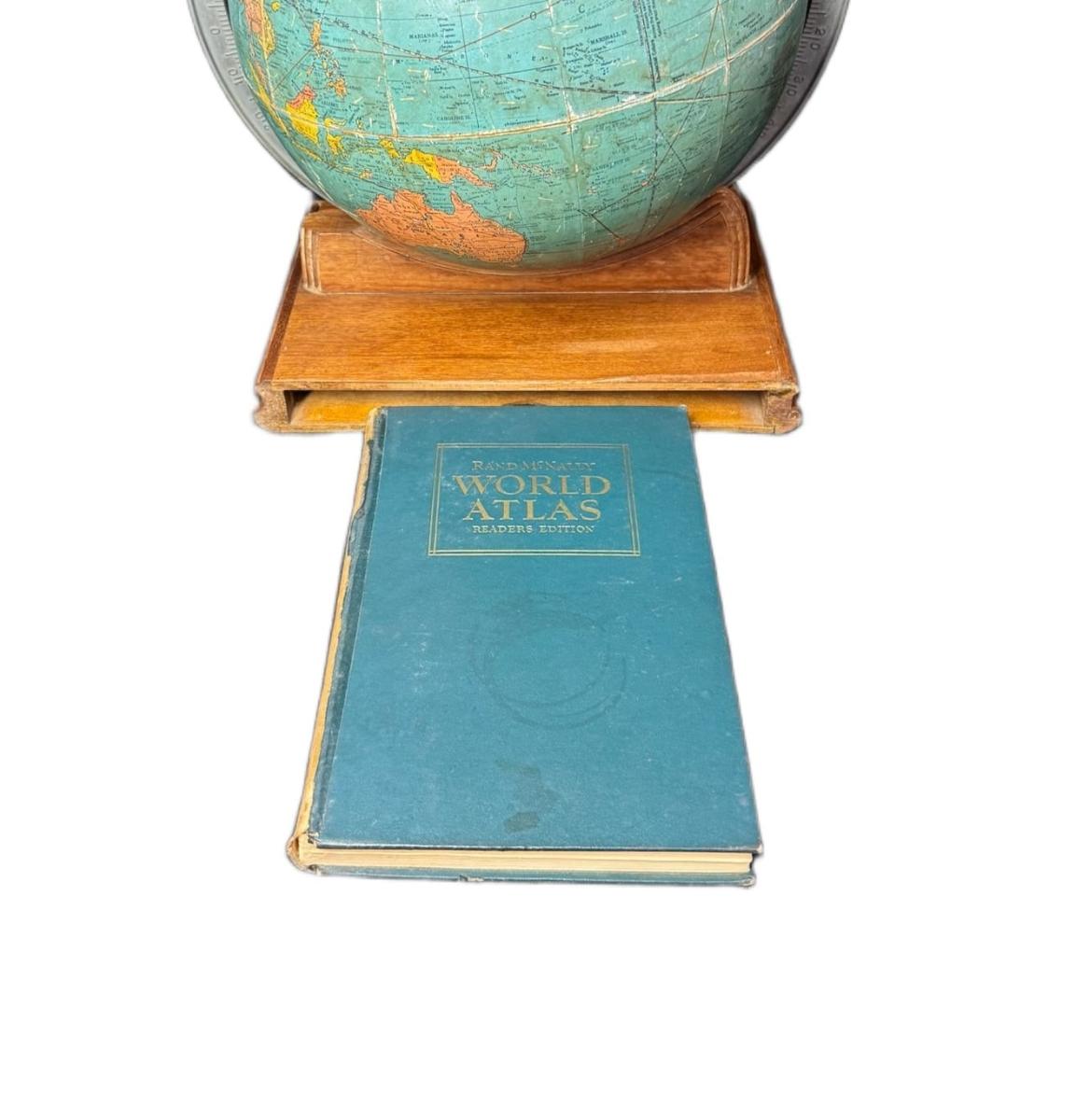This piece includes the original 1943 Rand McNally World Atlas Readers Edition. Age related wear. The base is believed to be mahogany. [CS]