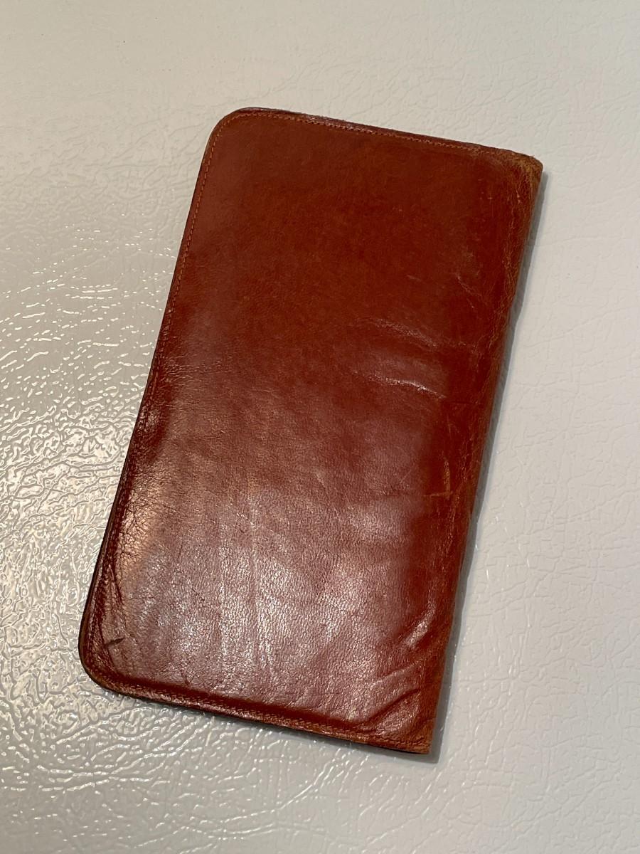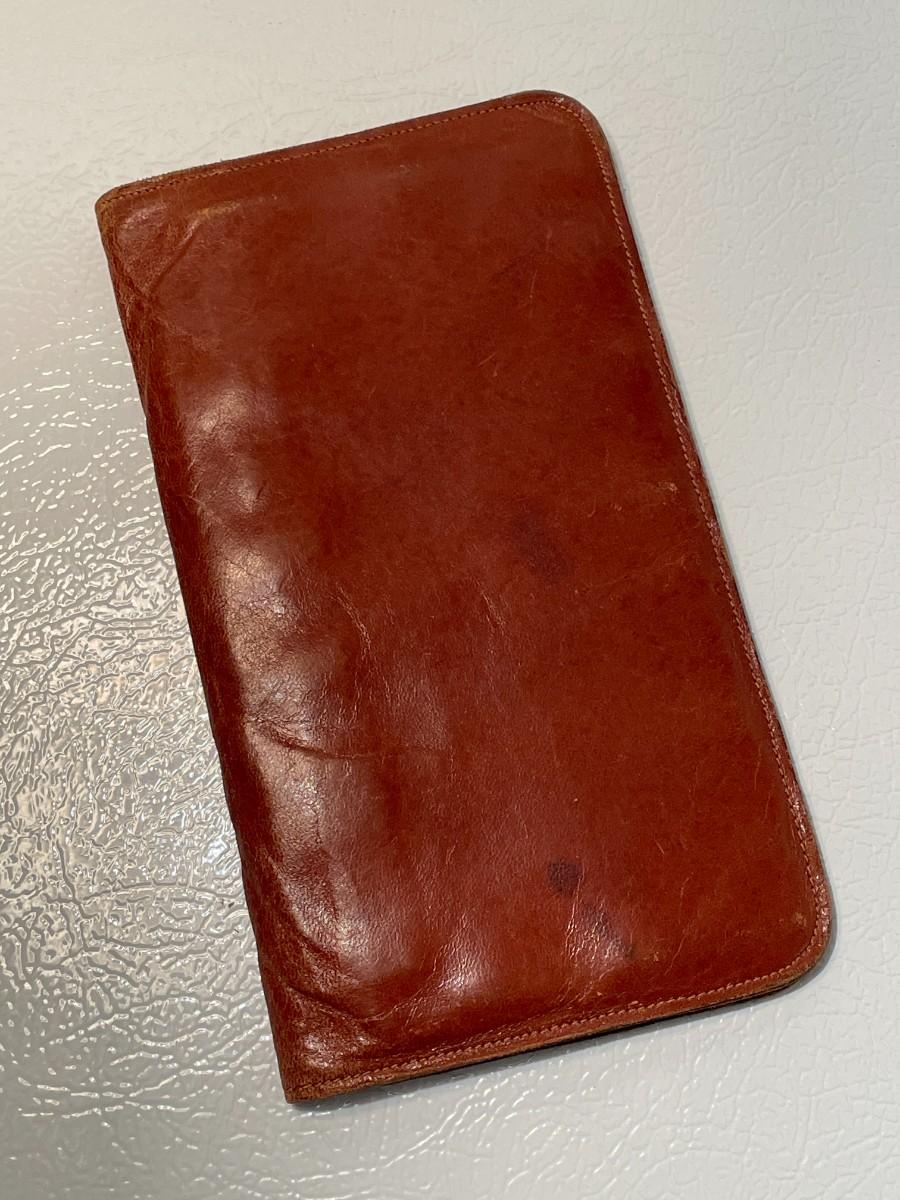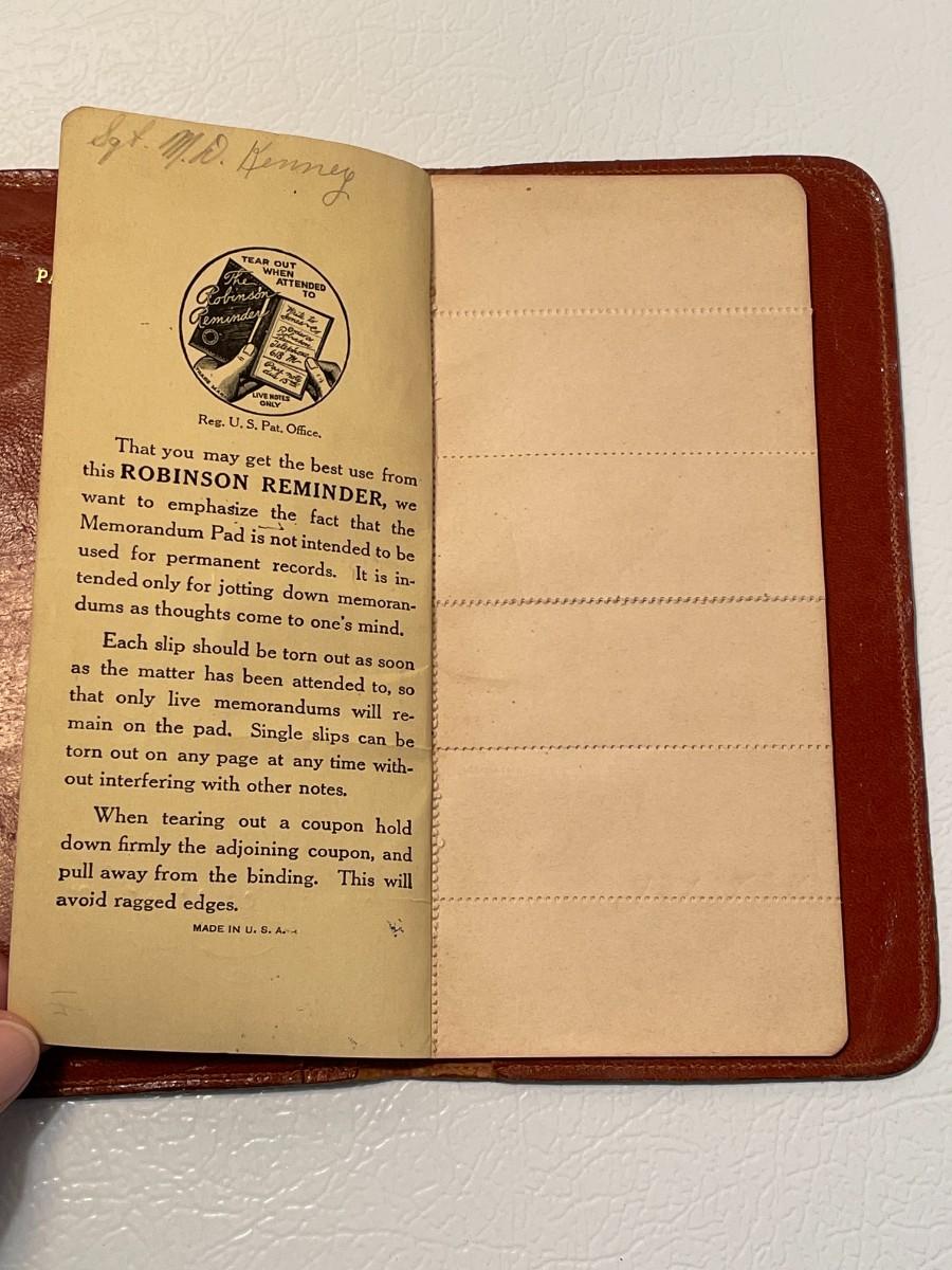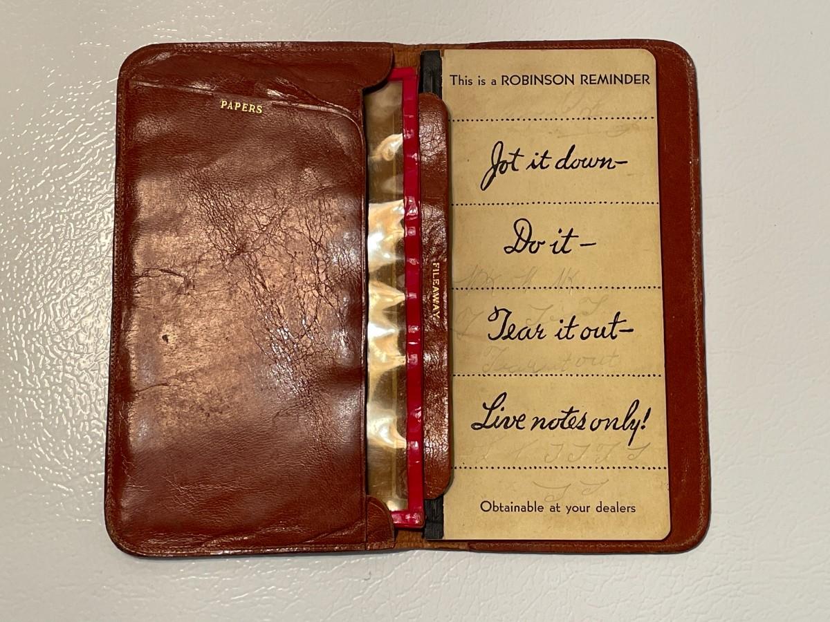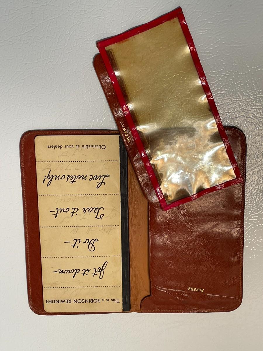 The consignor's uncle had this Robinson Reminder and he died during WWII so we know that it is late 1930s - early 1940s. It is made of very soft saddle leather and has a compartment for important papers as well as the organizer pad with a few pieces torn out. It is just over 7 inches by 4 inches.