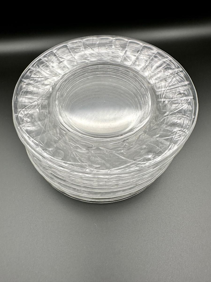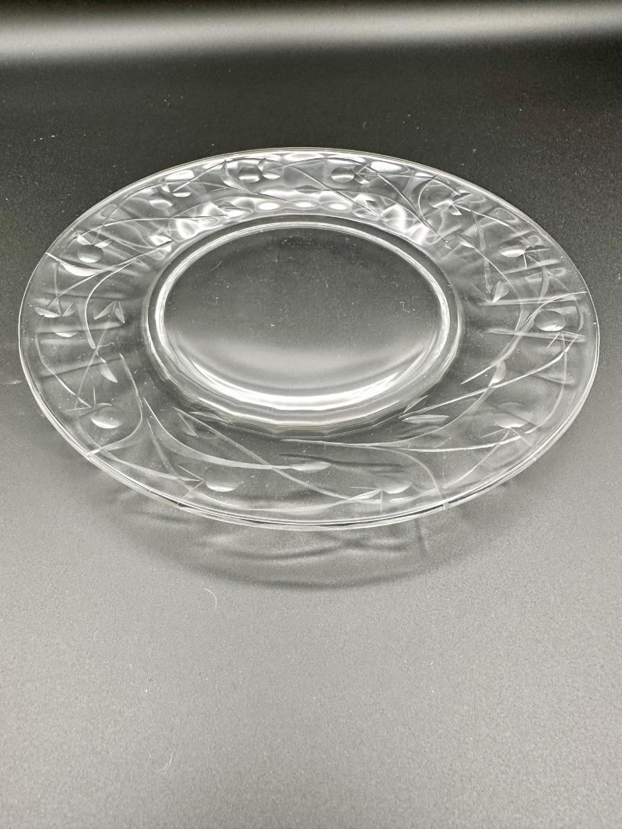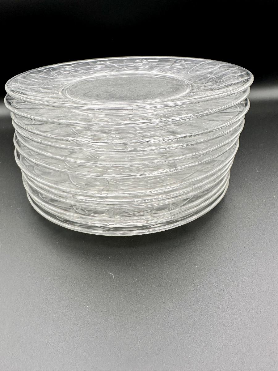 This is a lot of 12 salad plates in the Mulberry pattern by Fostoria. The Mulberry pattern was produced from 1940 to 1959, hand molded and etched by American craftsmen. These delicate etched plates have an intertwined pattern of branches and berries and intricate classic crystal stem pattern. Drawing in photos for pattern reference.