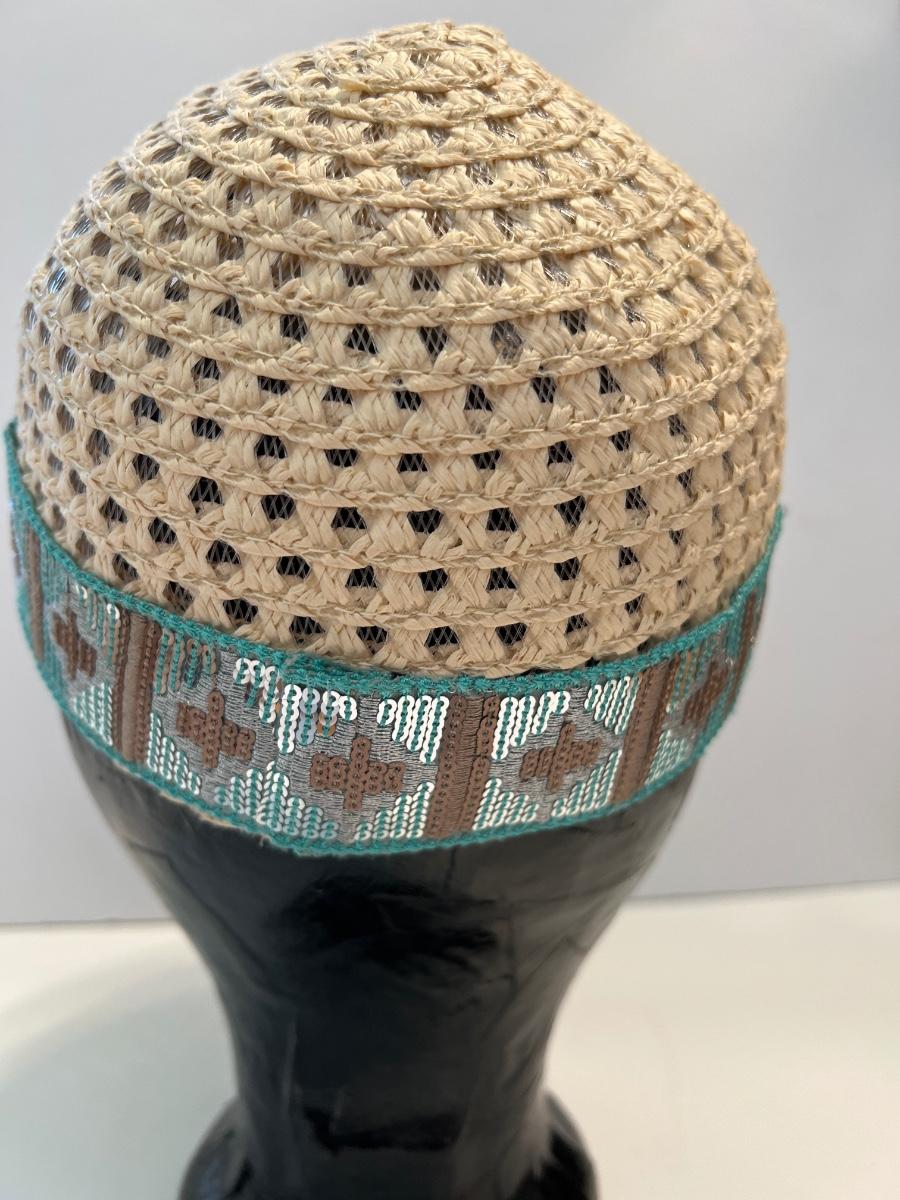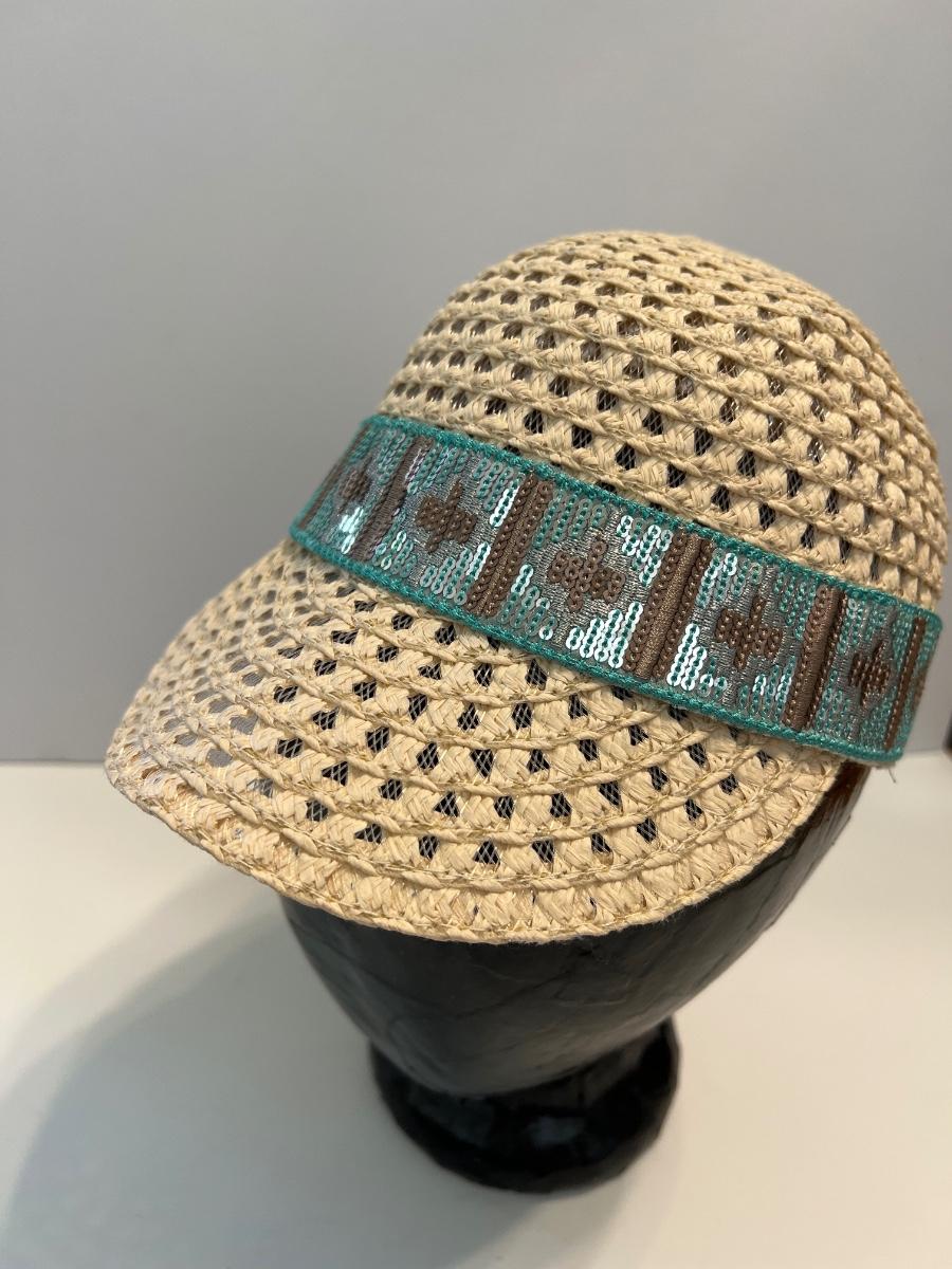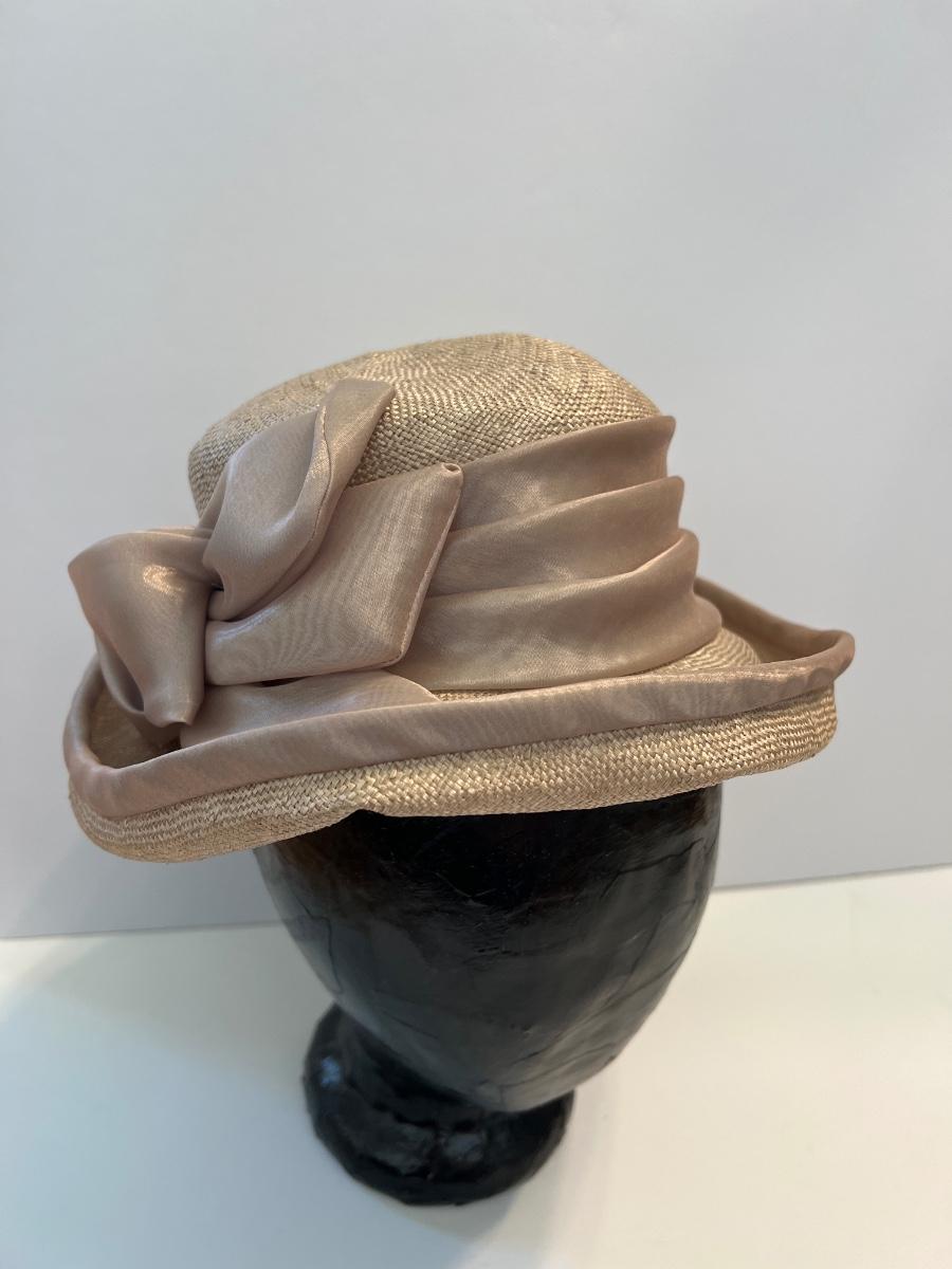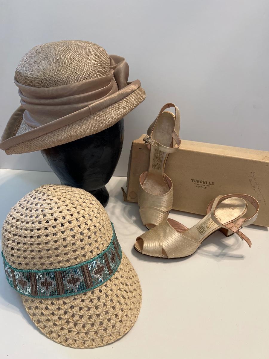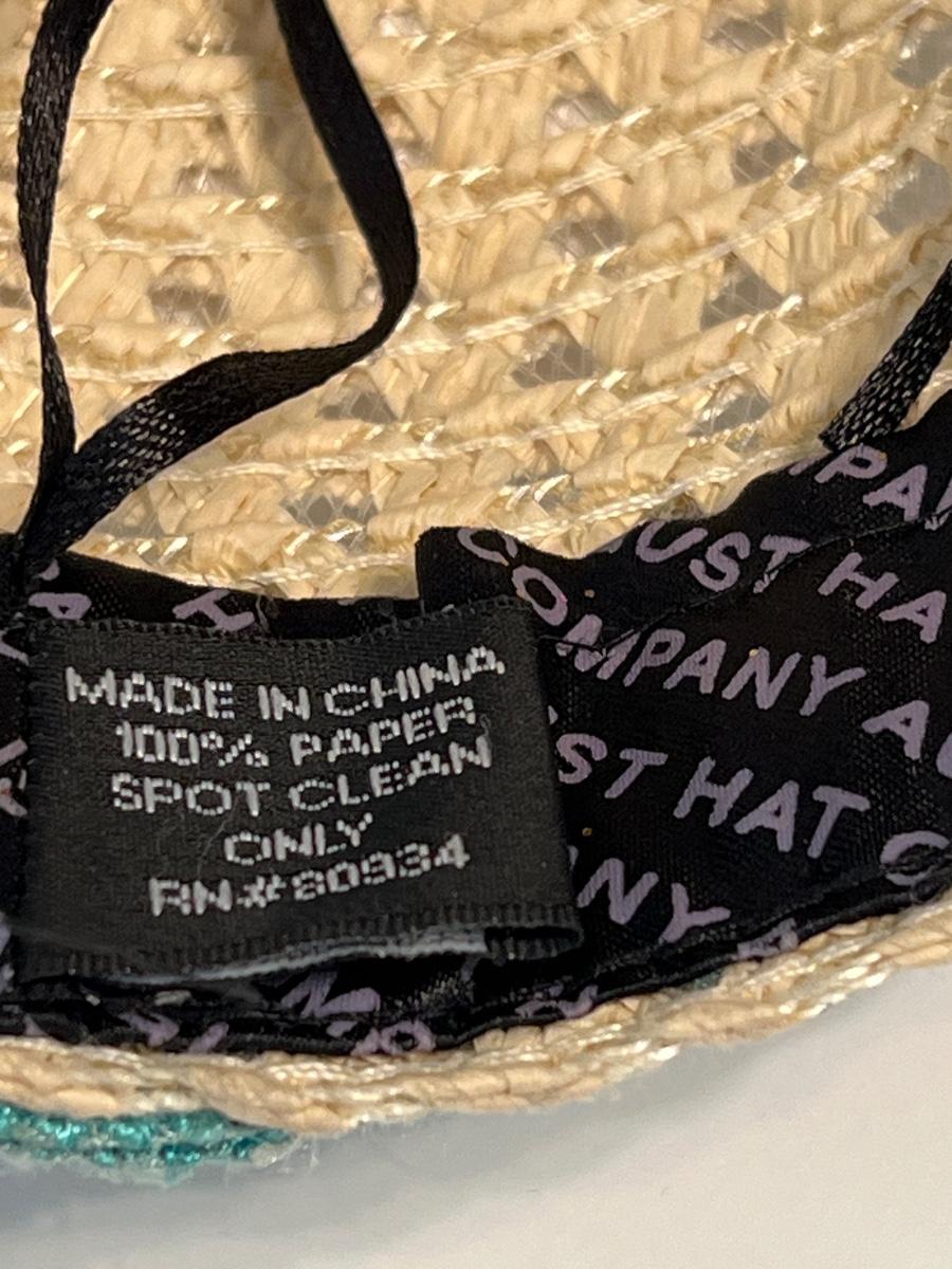 Two hats - one newer made of paper with sequined band and the other straw style with sheer tan ribbon band and bow.