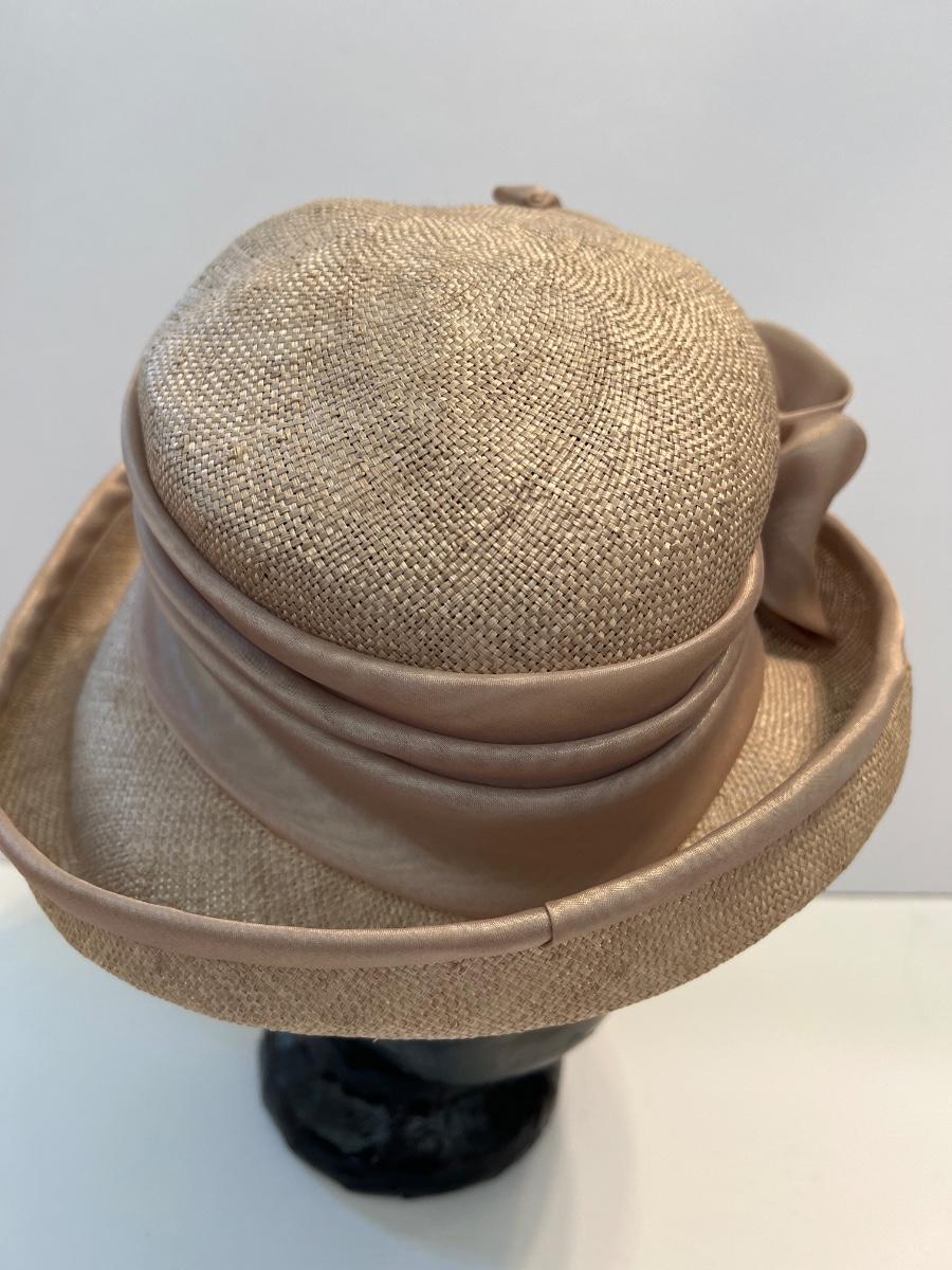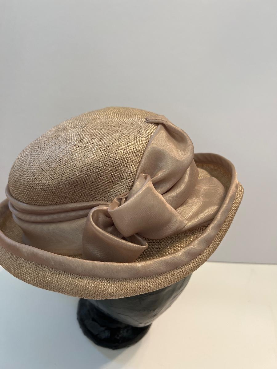 Two hats - one newer made of paper with sequined band and the other straw style with sheer tan ribbon band and bow.