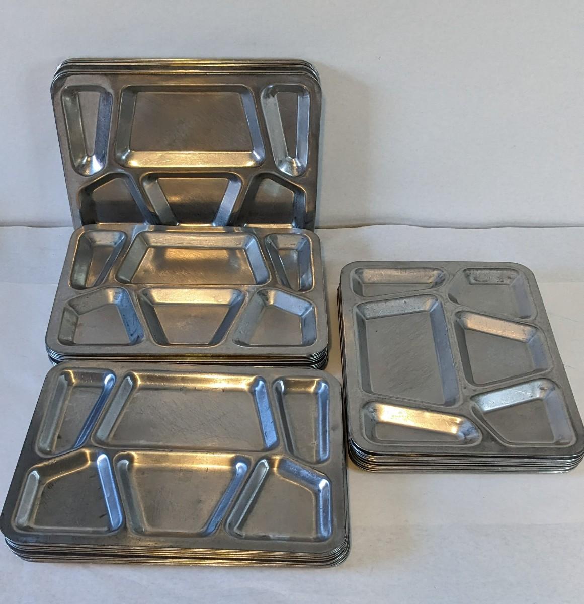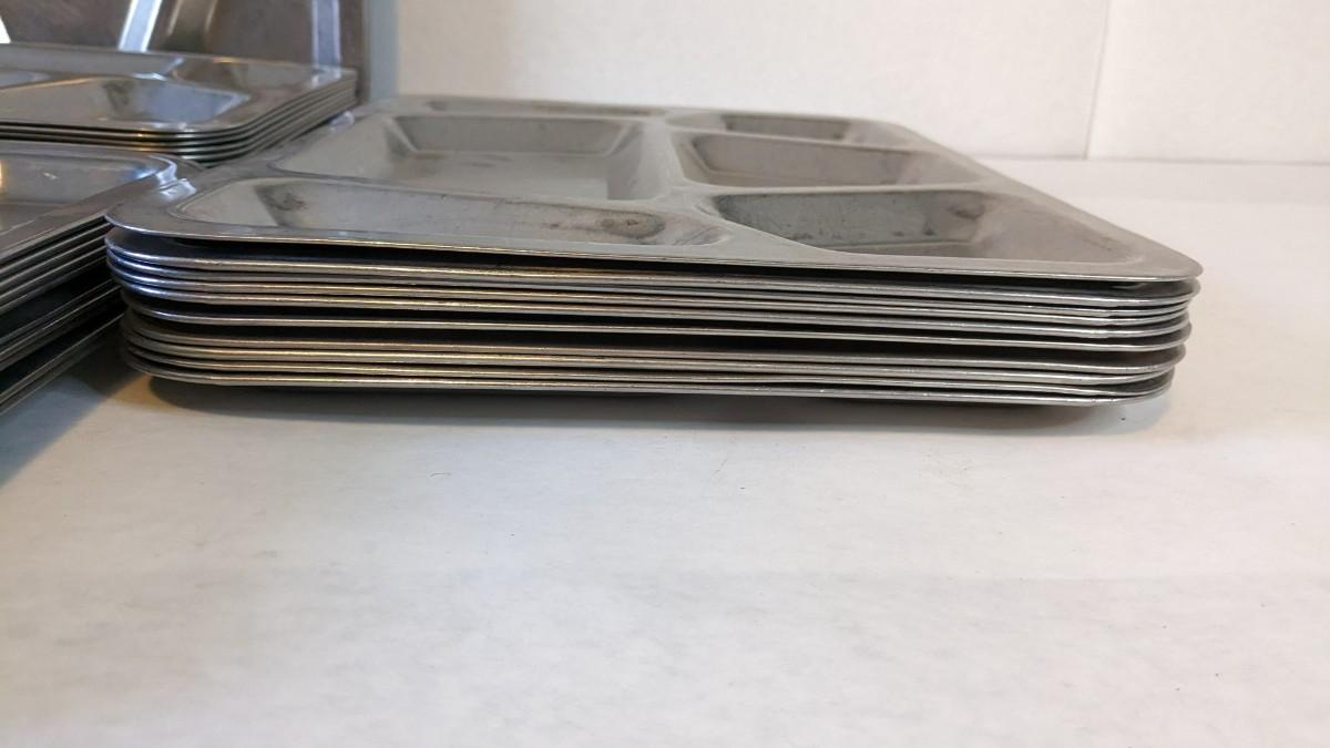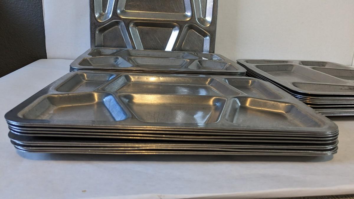 (42) 15.5"x11.75", 6 compartment eating trays, some are marked Rollton MFG, Carrollton MFG, and FTP. All are the same design and very neat WWII era pieces. Note this is almost 70 lbs and will be costly if requesting shipping.