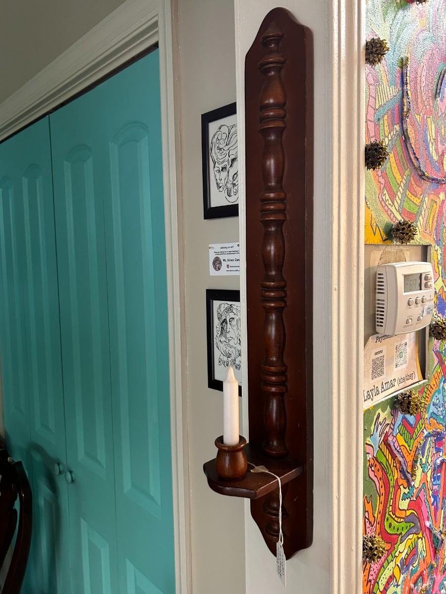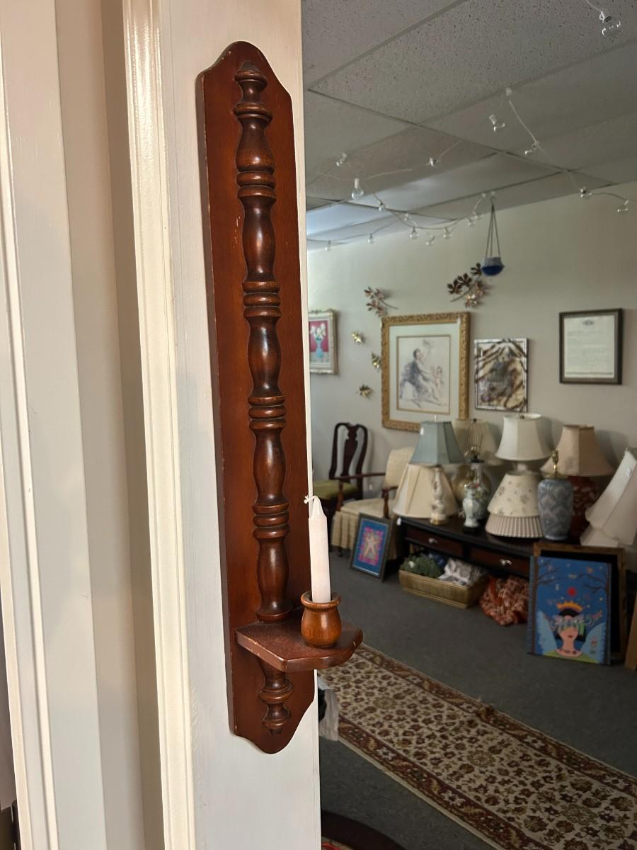 Pair of solid wood candle sconces, 1940s American décor, fit taper or spell candles, approx. 20" tall, 3" deep. NEAR MINT