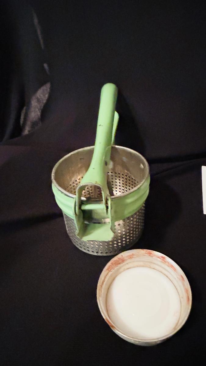 A green-handled potato ricer/masher