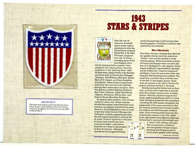 Official MLB Team Patch from Cooperstown Collection by Willabee & Ward, comes in protective sleeve with statistics and info card. The Stars and Stripes patch was worn by every Major League Team between 1943 and 1945 as a symbol of support for the American war effort in World War II.