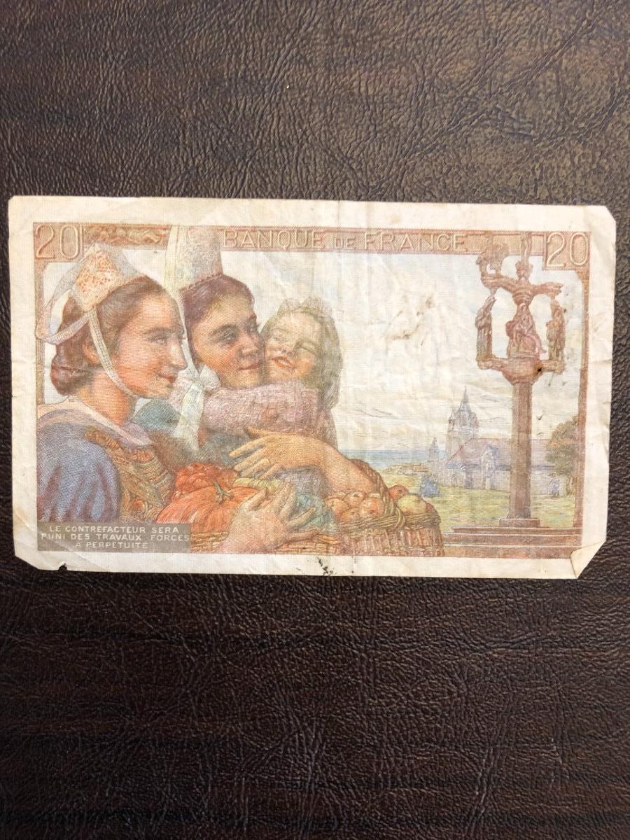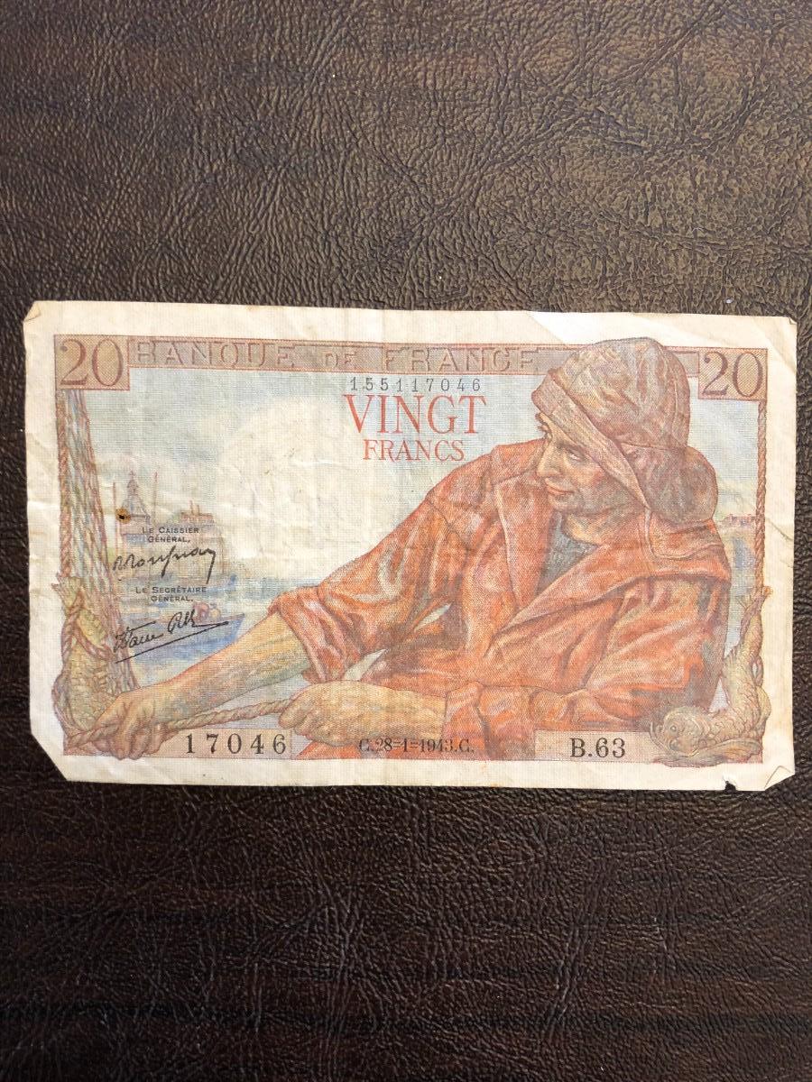 1943 WWII $20 FRANCS BANQUE DE FRANCE BANK NOTE