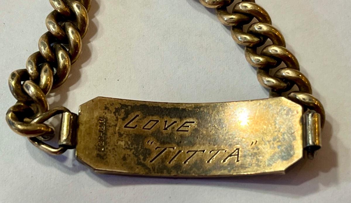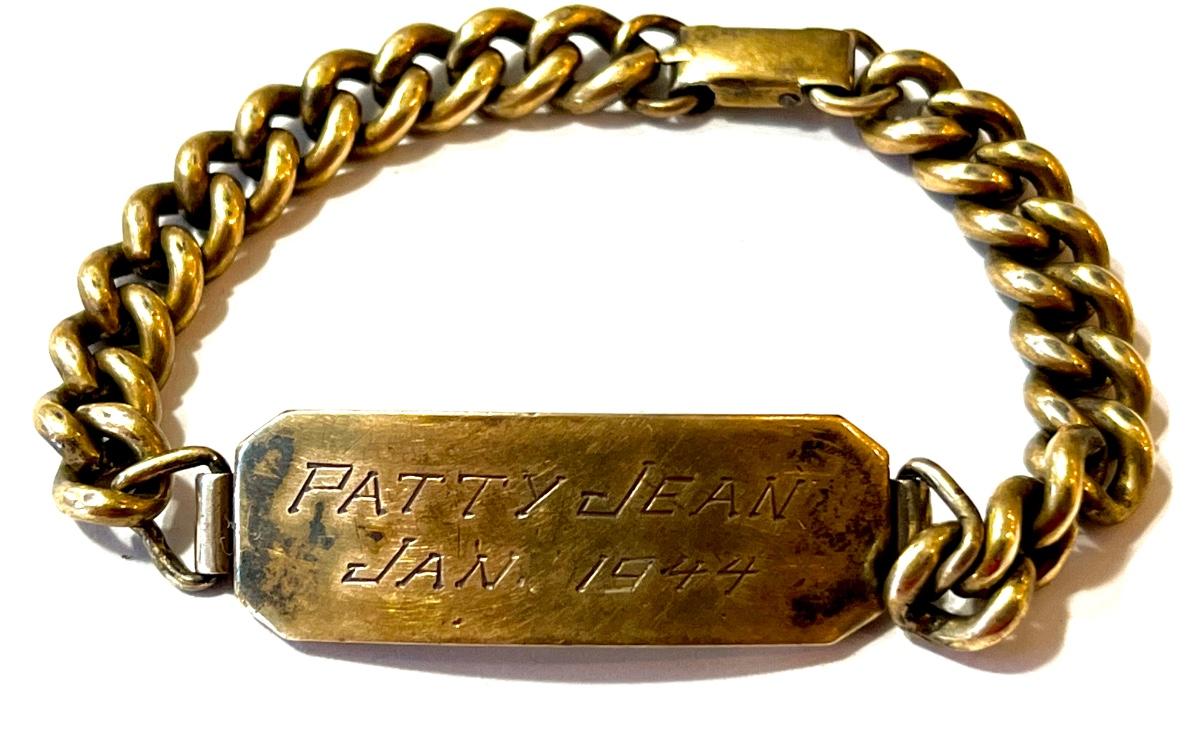 This is for a tiny, tiny wrist. It is 1/20 12 karat gold and is inscribed “Patty Jean Jan. 1944”.