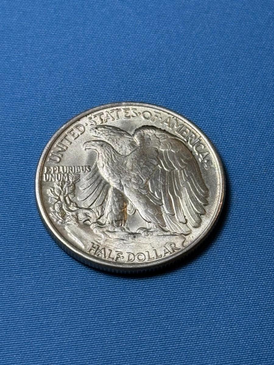 1944-P UNCIRCULATED CONDITION WALKING LIBERTY SILVER HALF DOLLAR AS PICTURED. (COIN 25), $5 DOMESTIC SHIPPING.