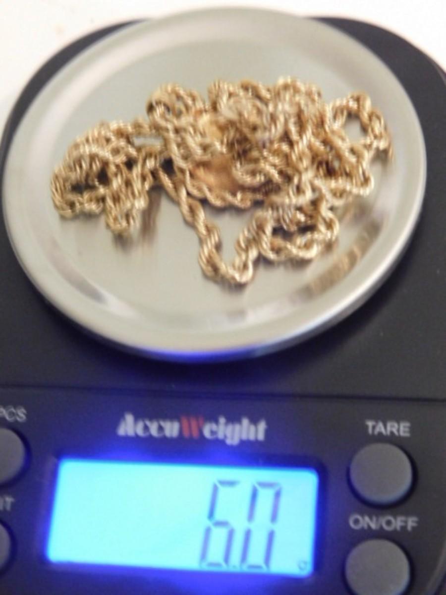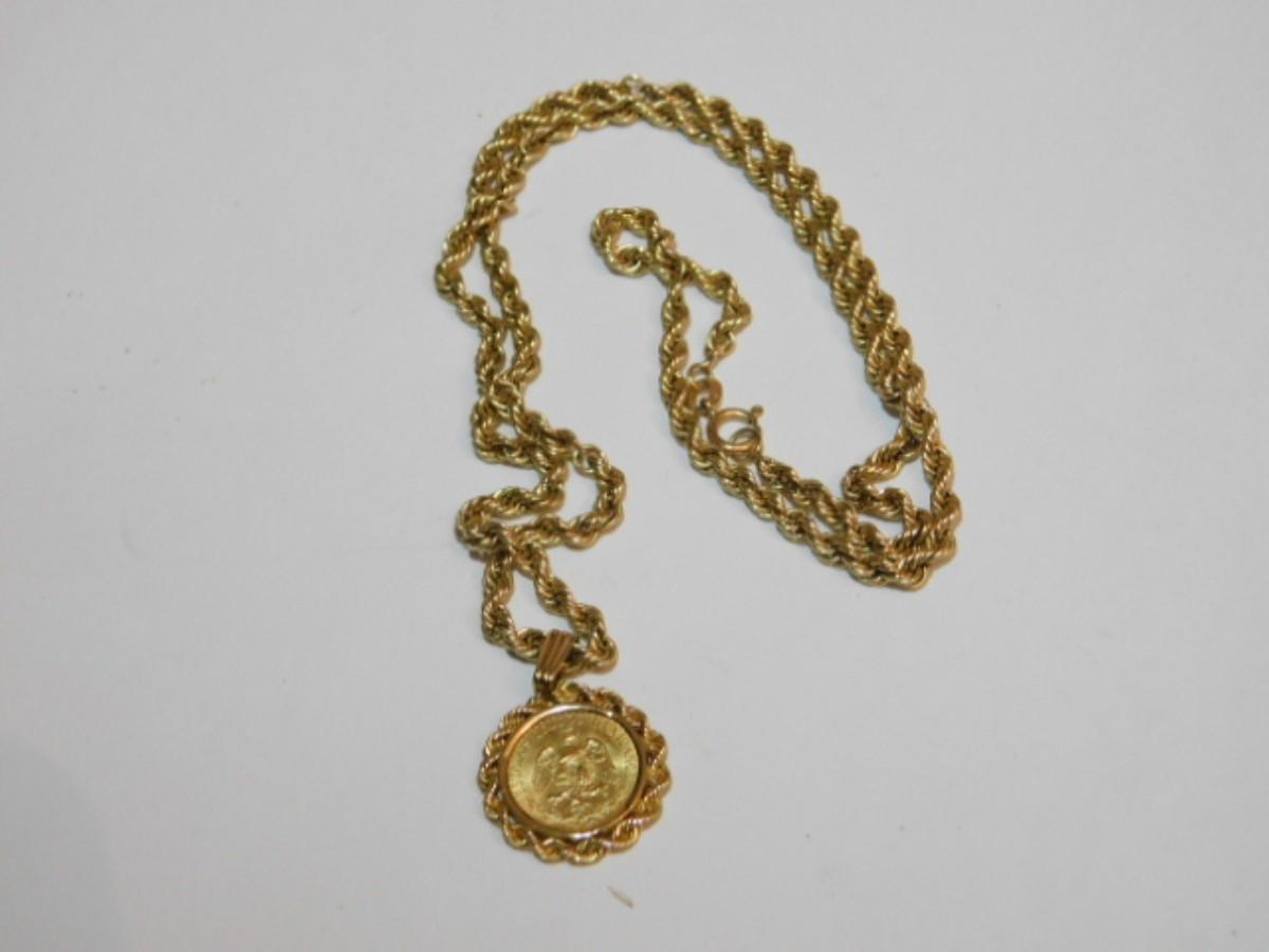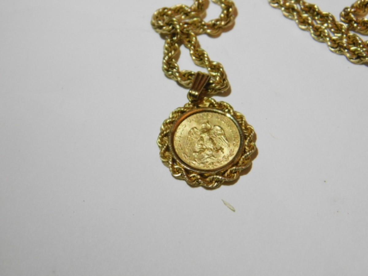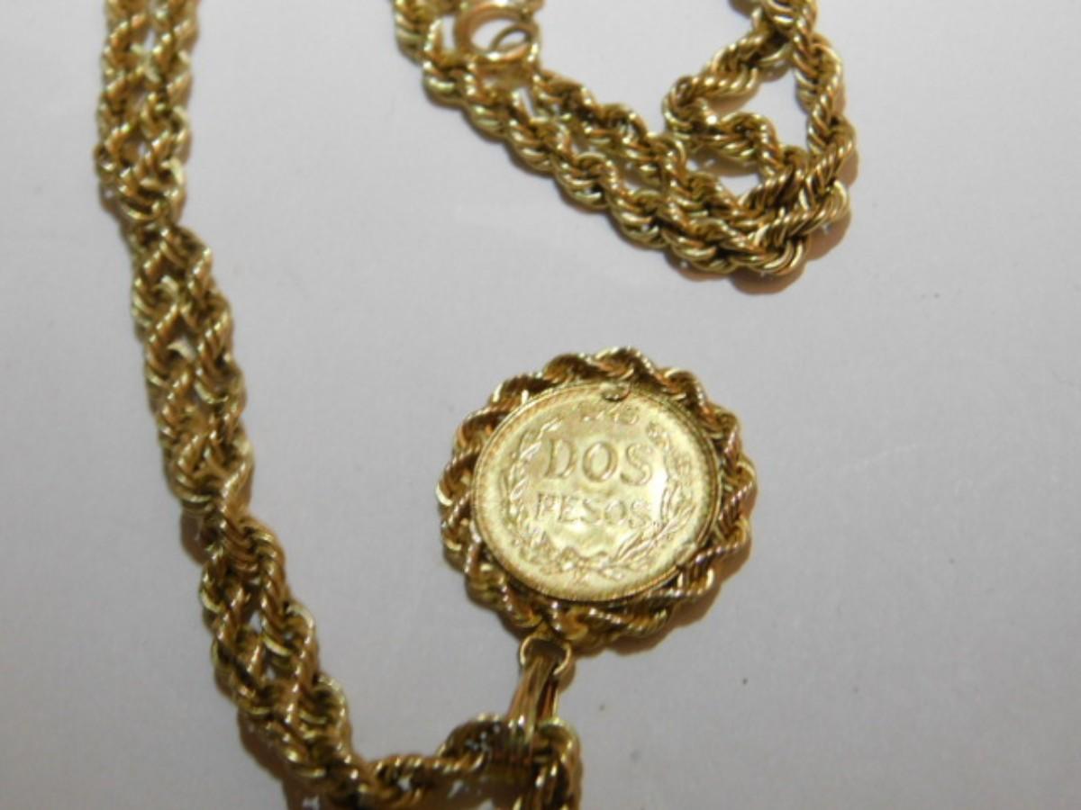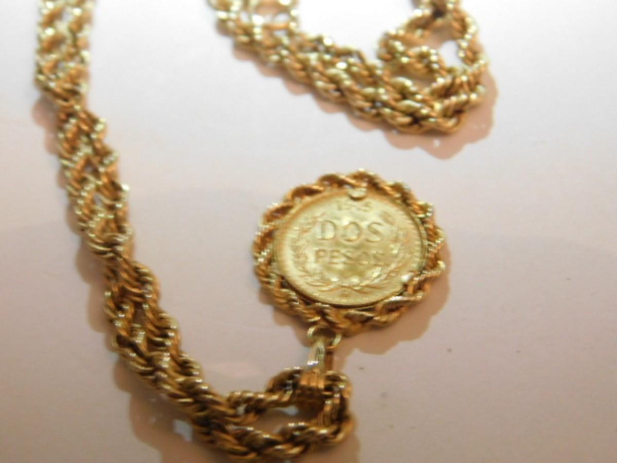 1945 Gold Dos Pesos Mexican Coin as Slide Pendant on 14kt Gold French Rope Necklace 6 grams Total Weight
