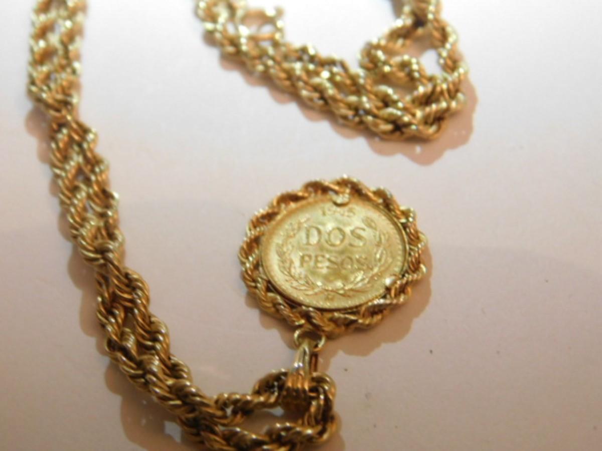 1945 Gold Dos Pesos Mexican Coin as Slide Pendant on 14kt Gold French Rope Necklace