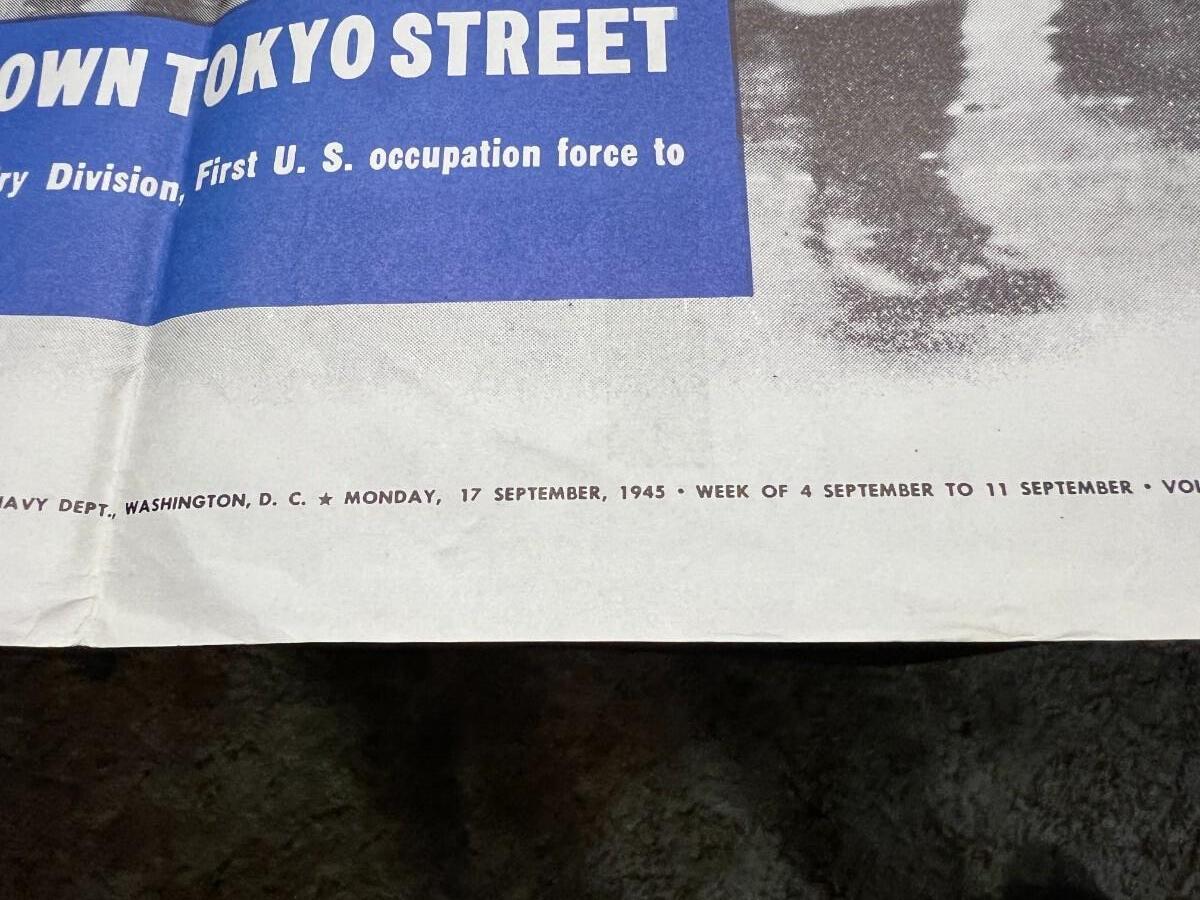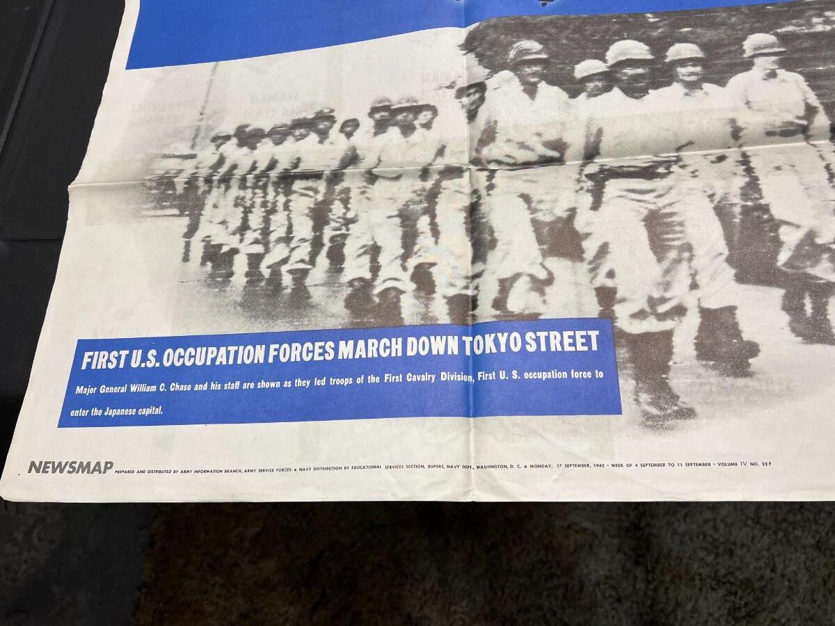 1945 News Map for the Armed Forces of American Troops and Japan. Features an image of the United States US troops marching down a Tokyo street. Condition as shown.