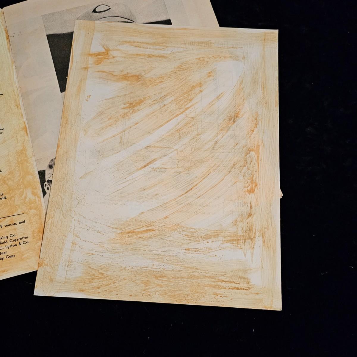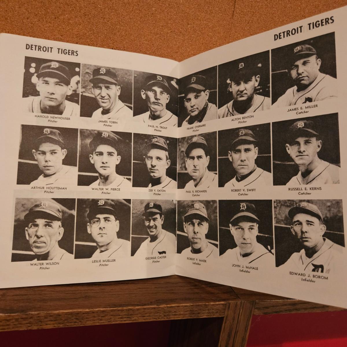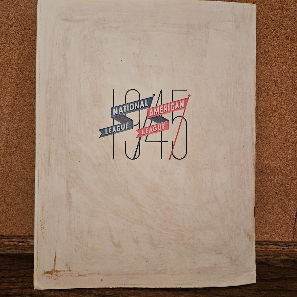 A 1945 World Series program between the Chicago Cubs and the Detroit Tigers. It measures approximately 8.5" x 11". Some pages have discoloration and have come unglued, including the cover. See attached pictures for more information about condition. Shipping available