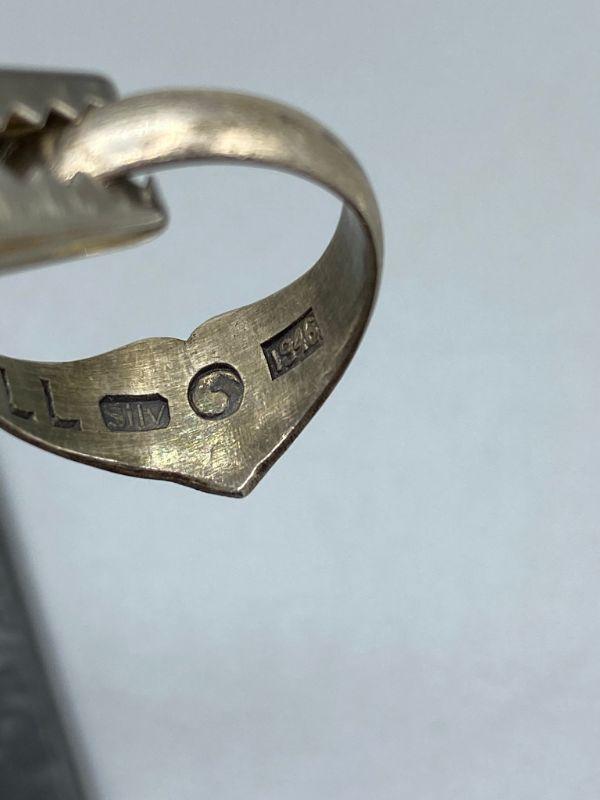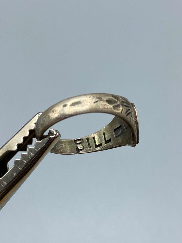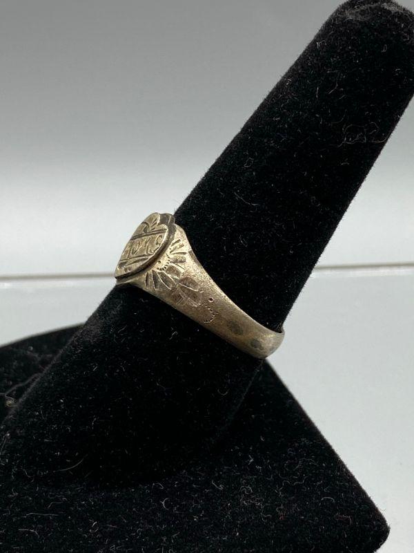 Sterling silver etched heart ring. Dated 1945, believe it is a WWII loved ones ring. Engraved Mom on heart and the name Bill is stamped into the inside. Date is also stamped inside with "silv" and what looks like a yin-yang symbol. Fits more like a 8.