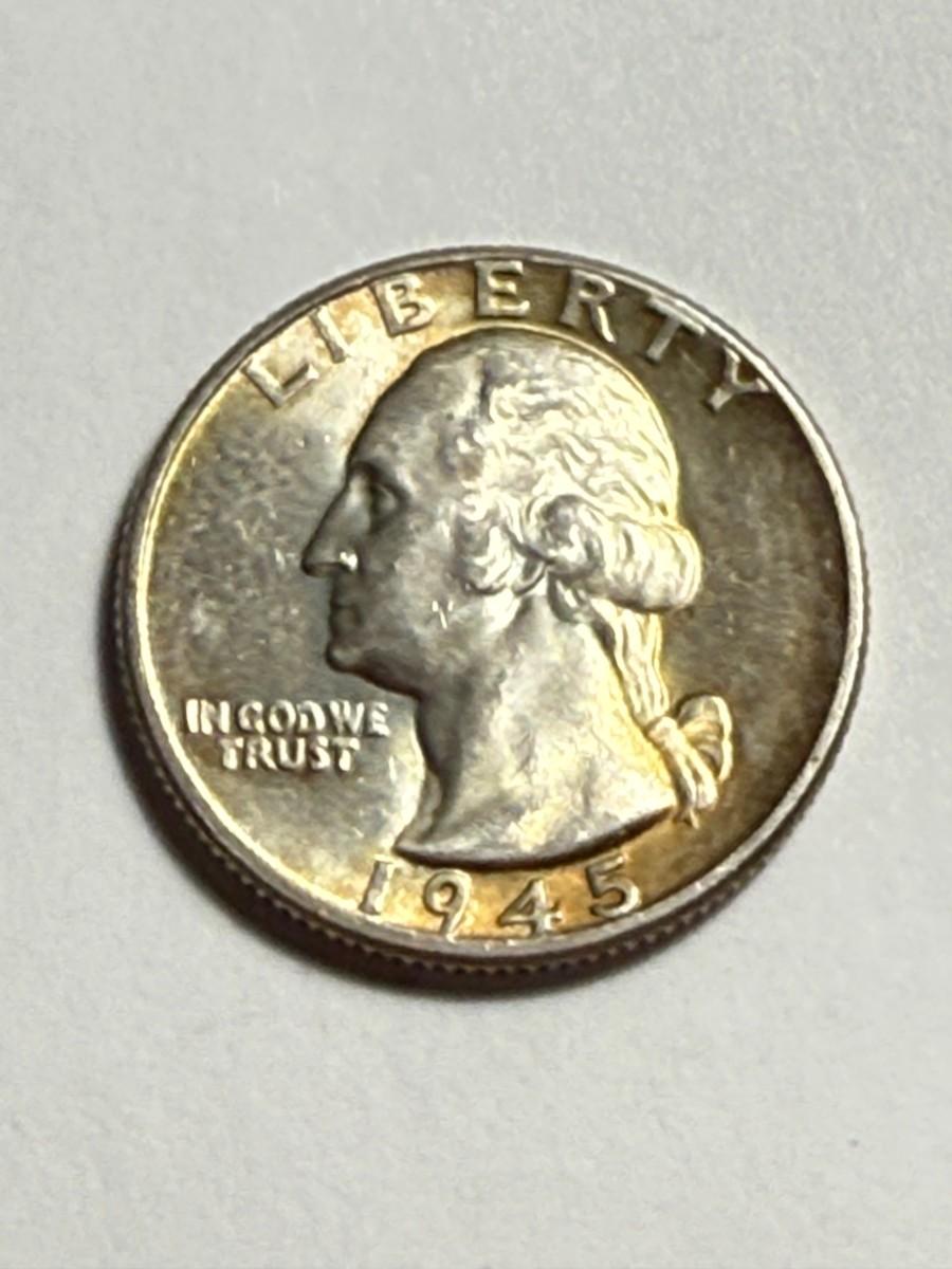 1945-P AU58 CONDITION WASHINGTON SILVER QUARTER AS PICTURED. $5 DOMESTIC SHIPPING.