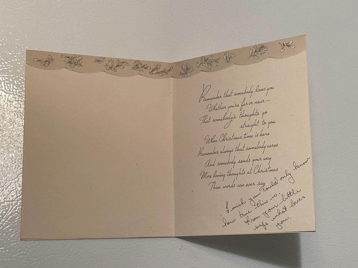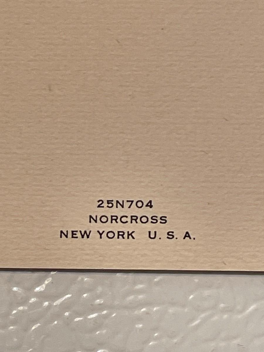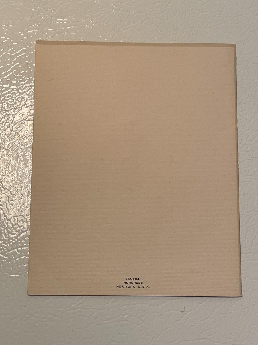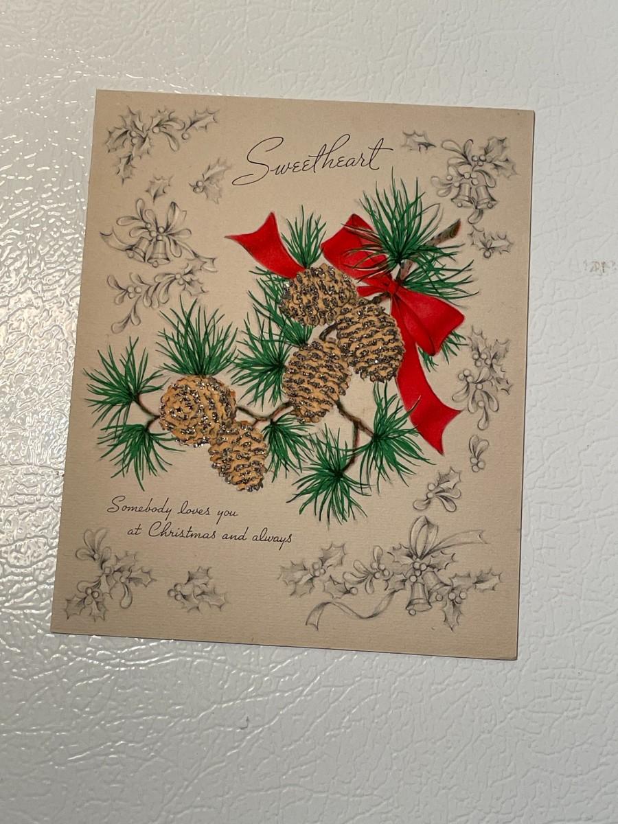 This card is in excellent condition and has pincones on the front embellished with fine glitter. It is produced by Norcross and measures about 4.875 inches by 6 inches.