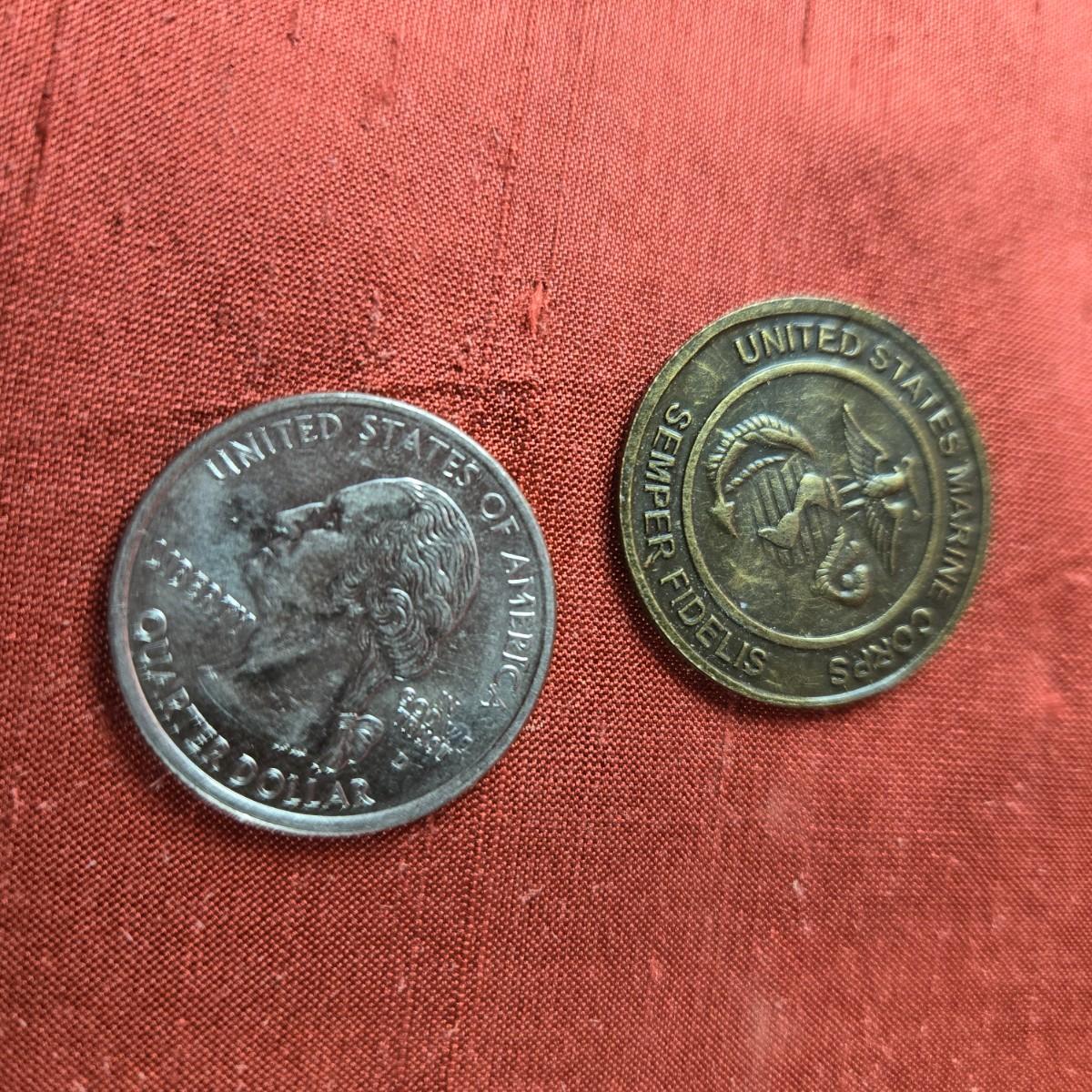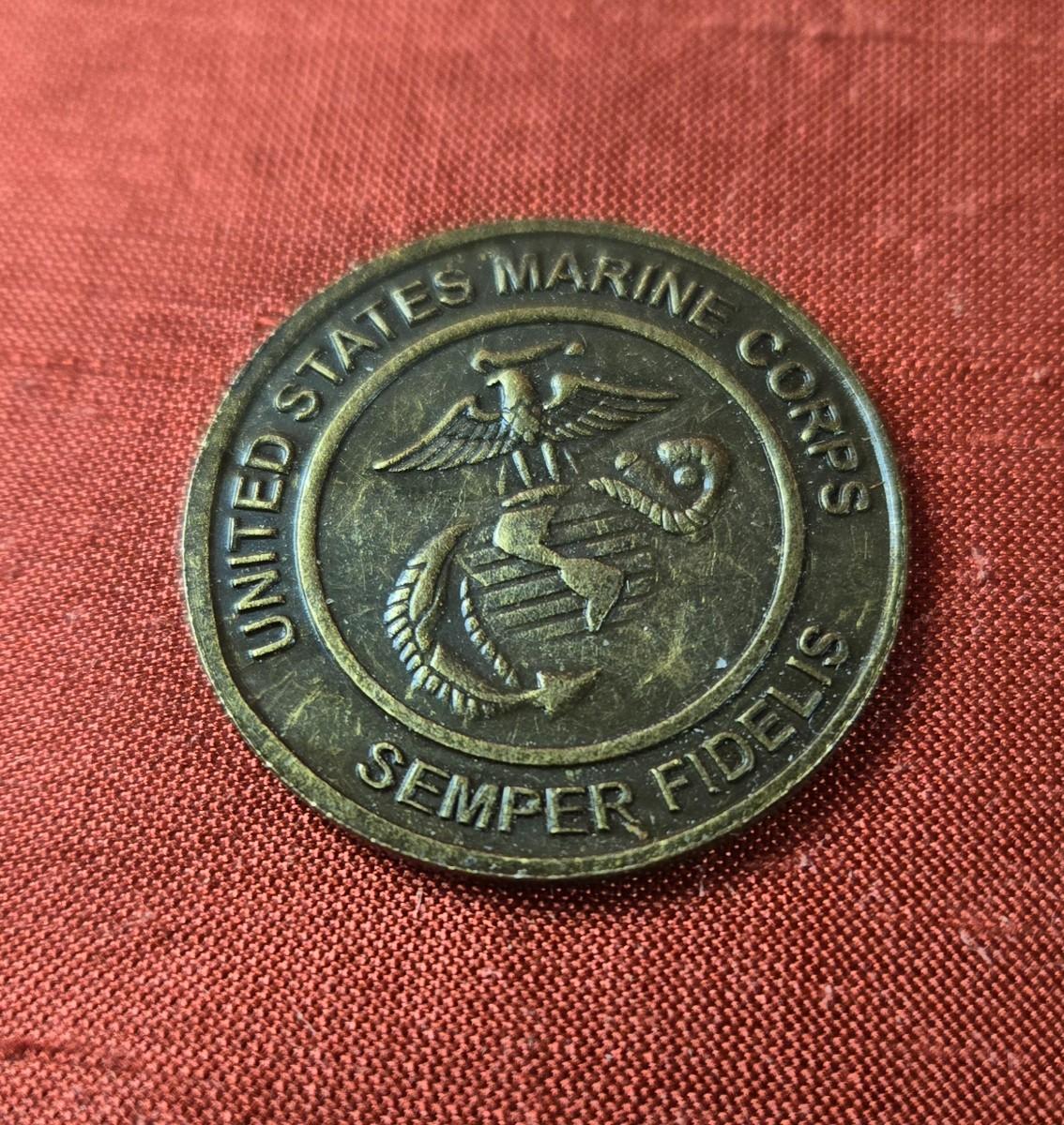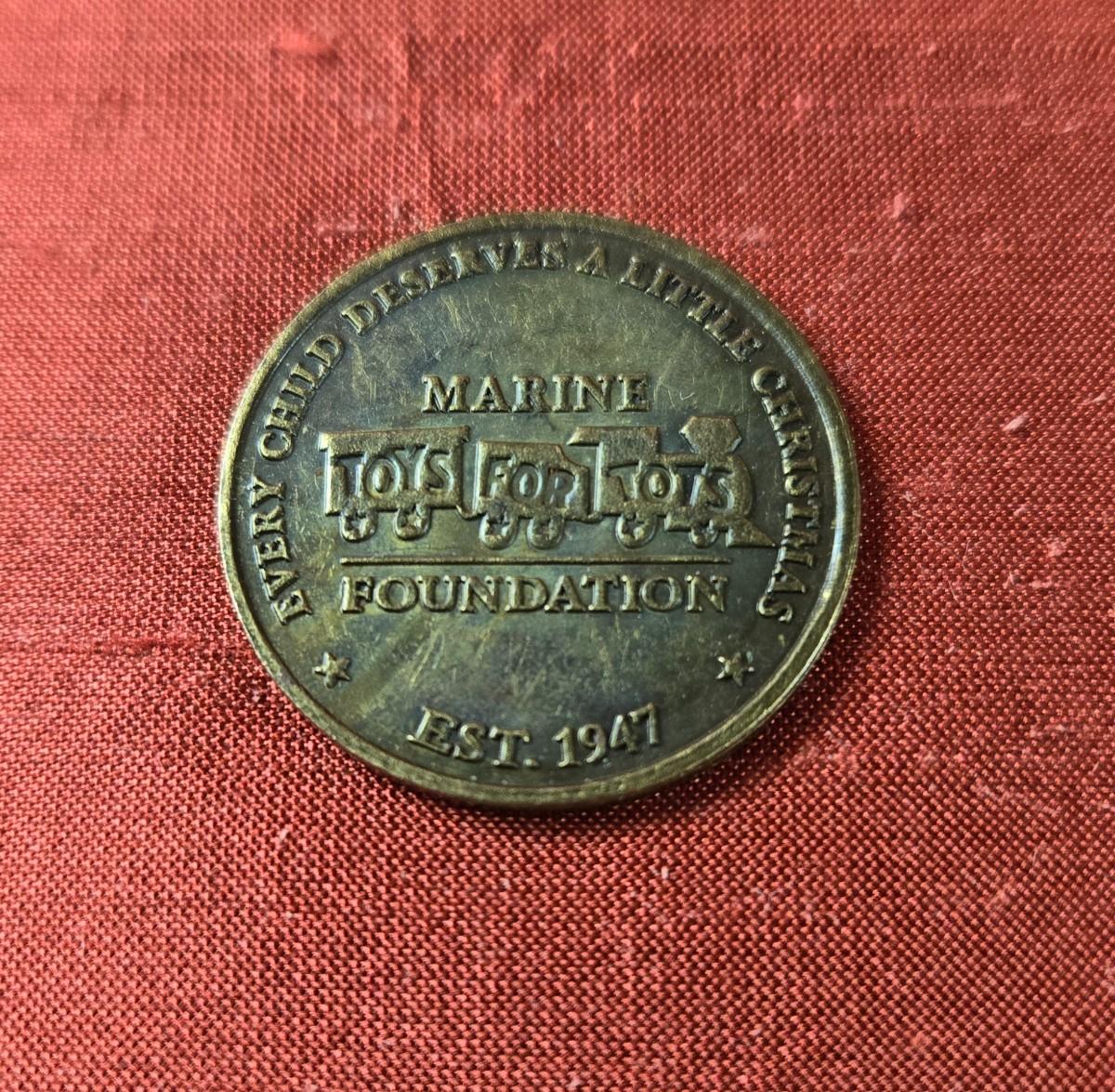This auction lot is for a 1947 Marine Toy for Tots Coin. This is a coin struck as a memento for the Toys for Tots Charity Program given by the Marines with a donation. It is dated 1947 - used condition.