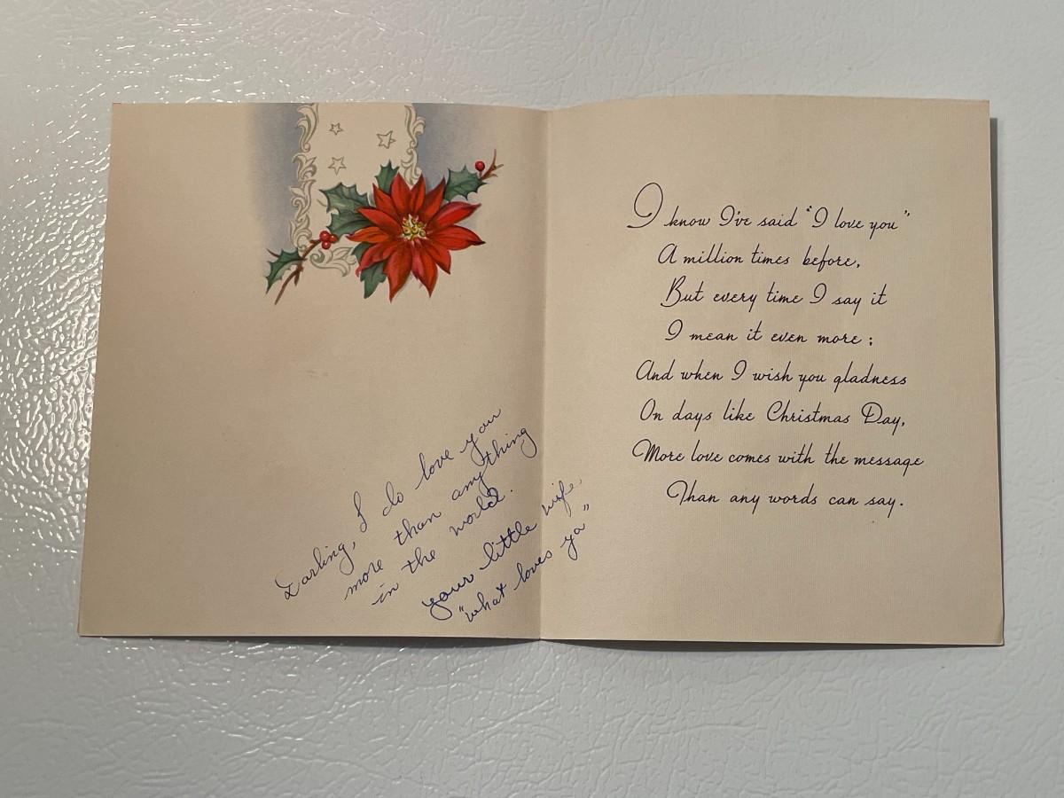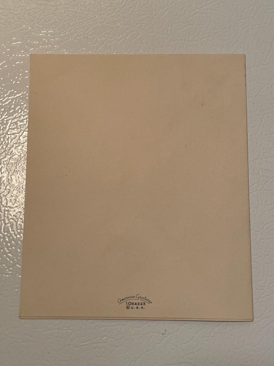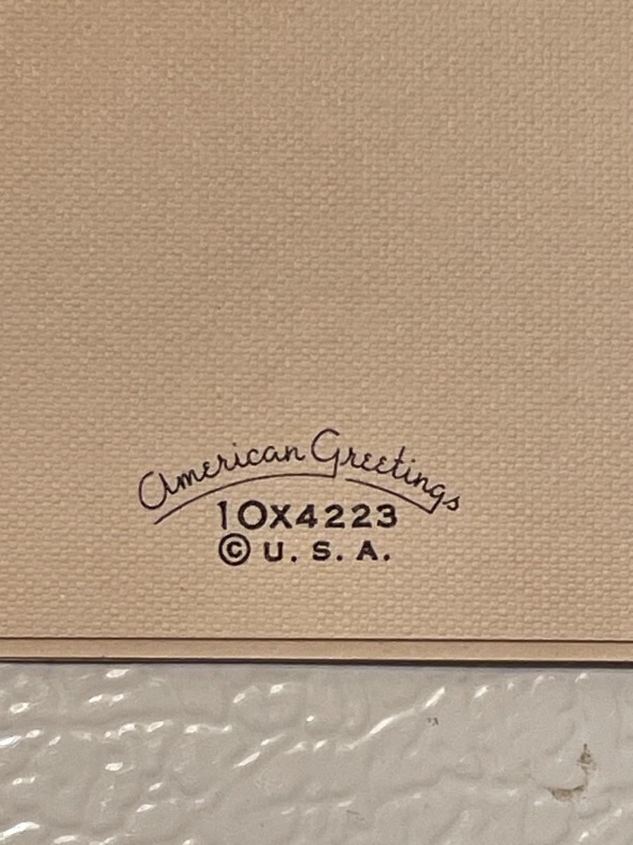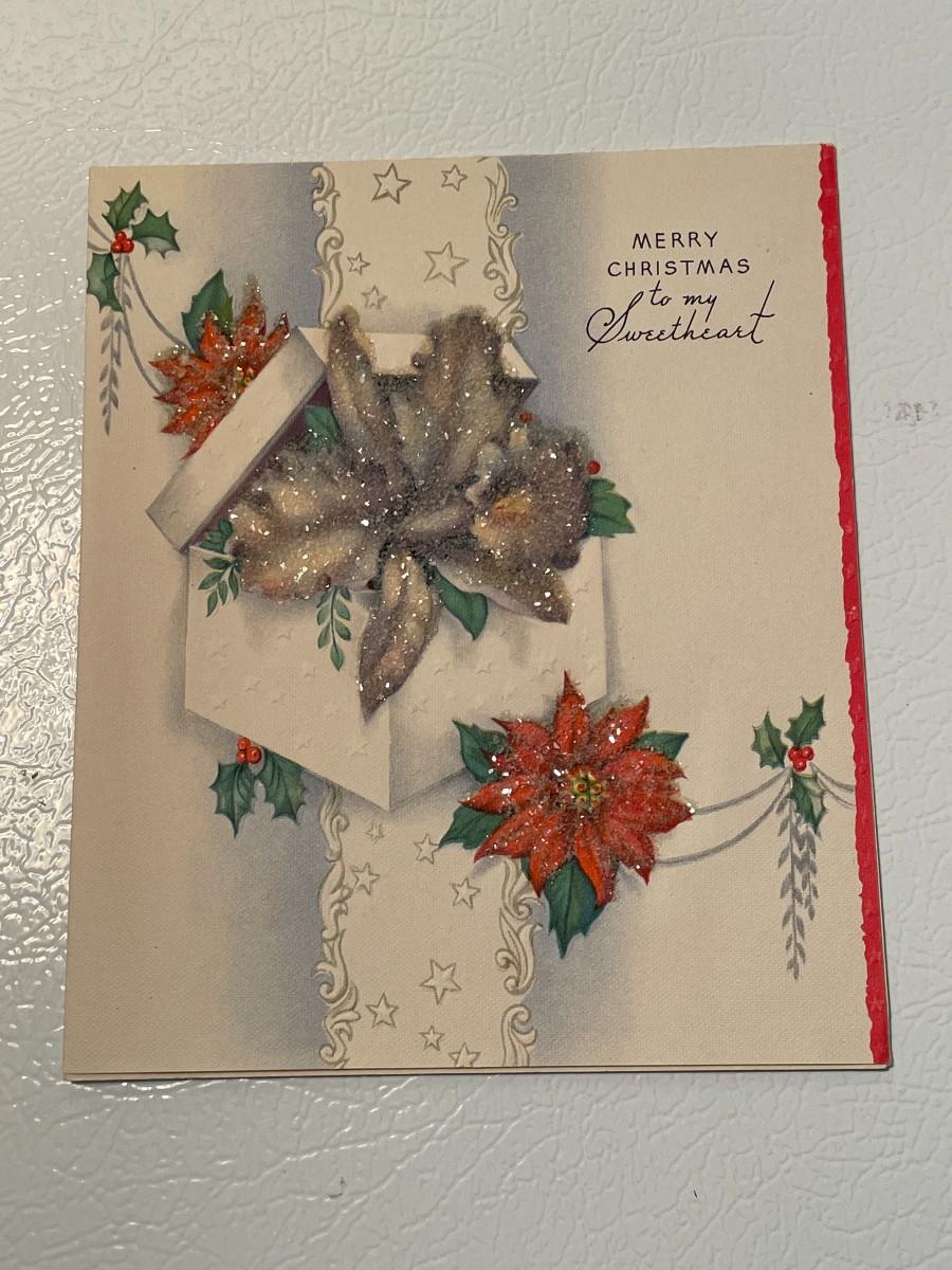 This card is about 5 inches by 6 inches and the picture on the front is embellished with fine glitter. In great condition.