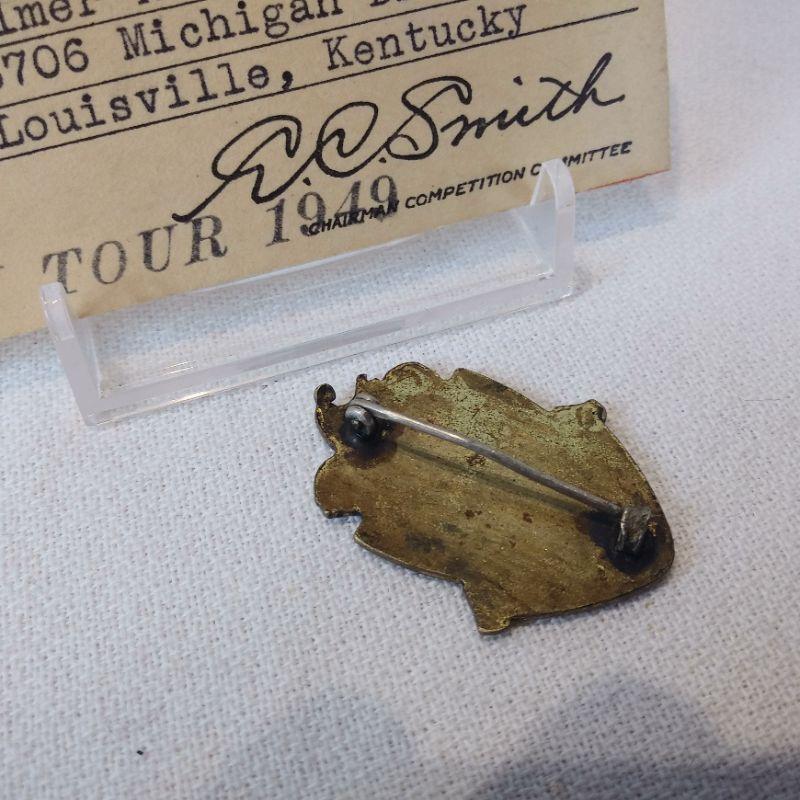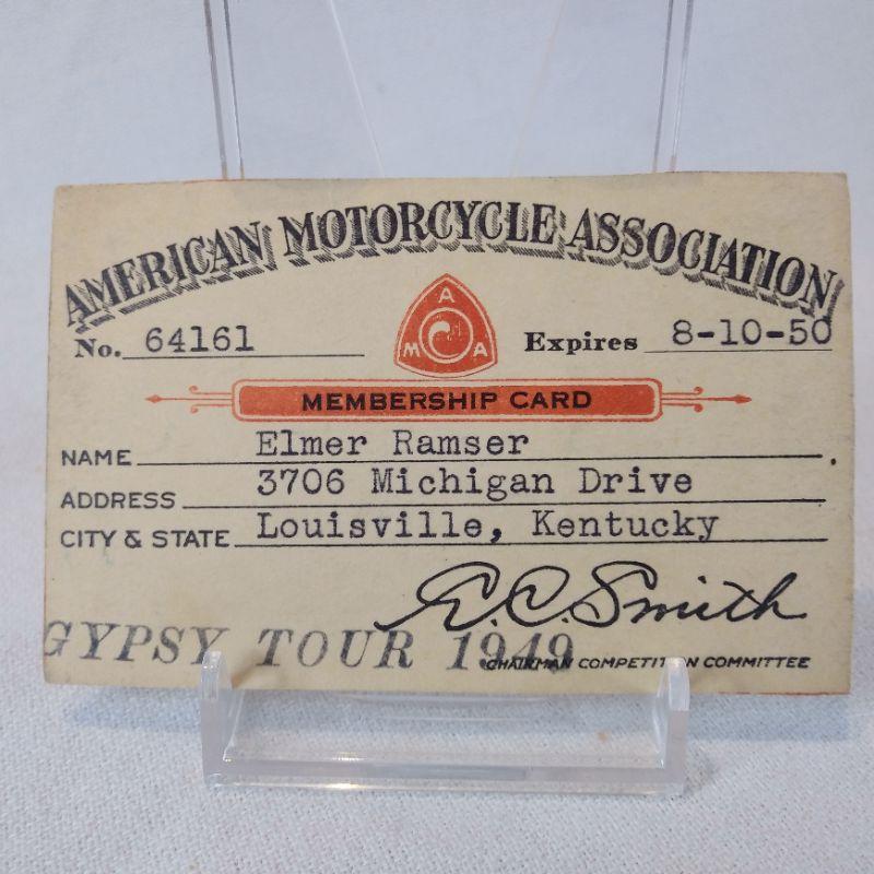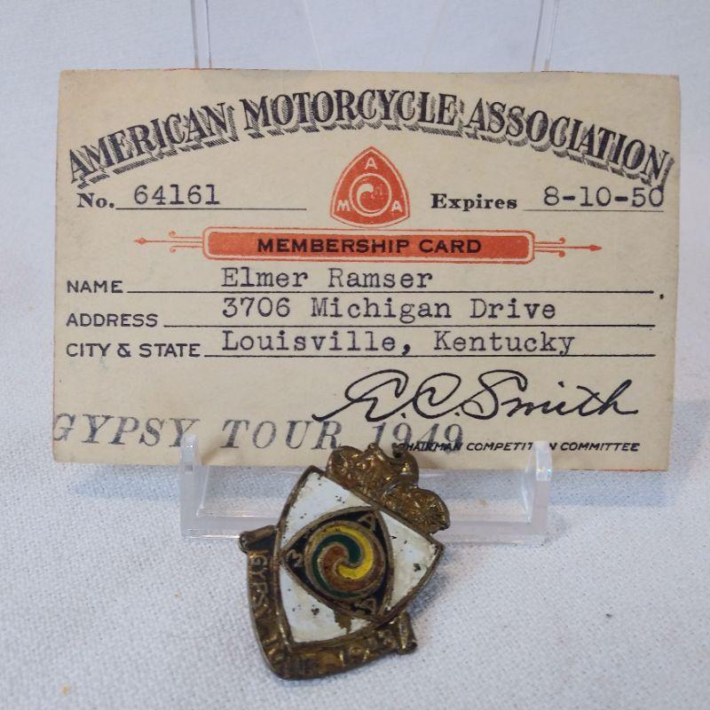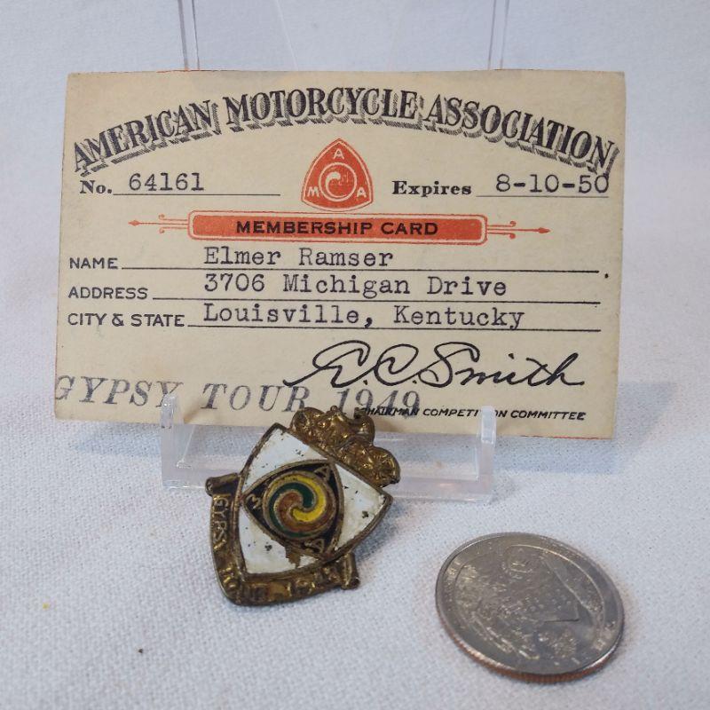 This offering is a wonderful example of the vintage motorcycle items now being sought by knowledgeable collectors and resellers. This is a 1948 AMA Gypsy Tour Metal Pin and 1949 Membership Card. Pin shows some wear - he worn it across the country on his leather jacket aboard his Harley - but card is very good. Starting Bid/Reserve is $12.