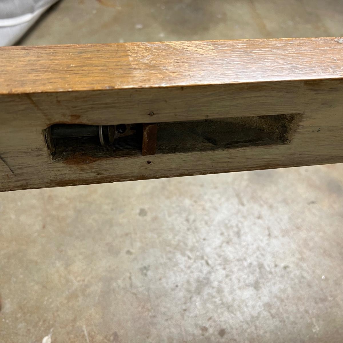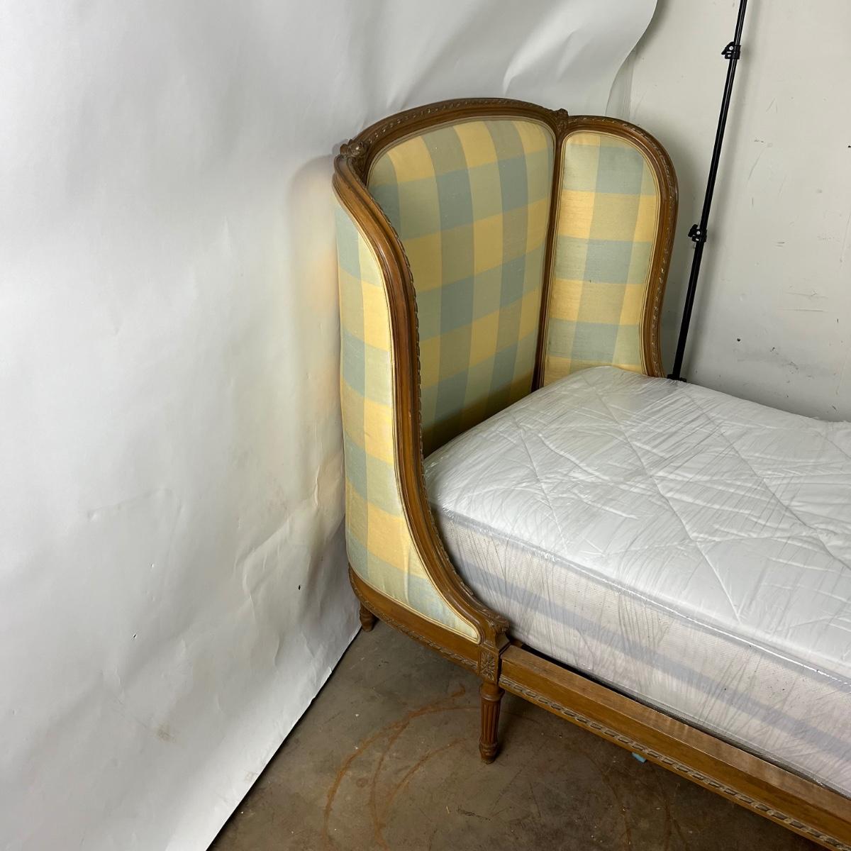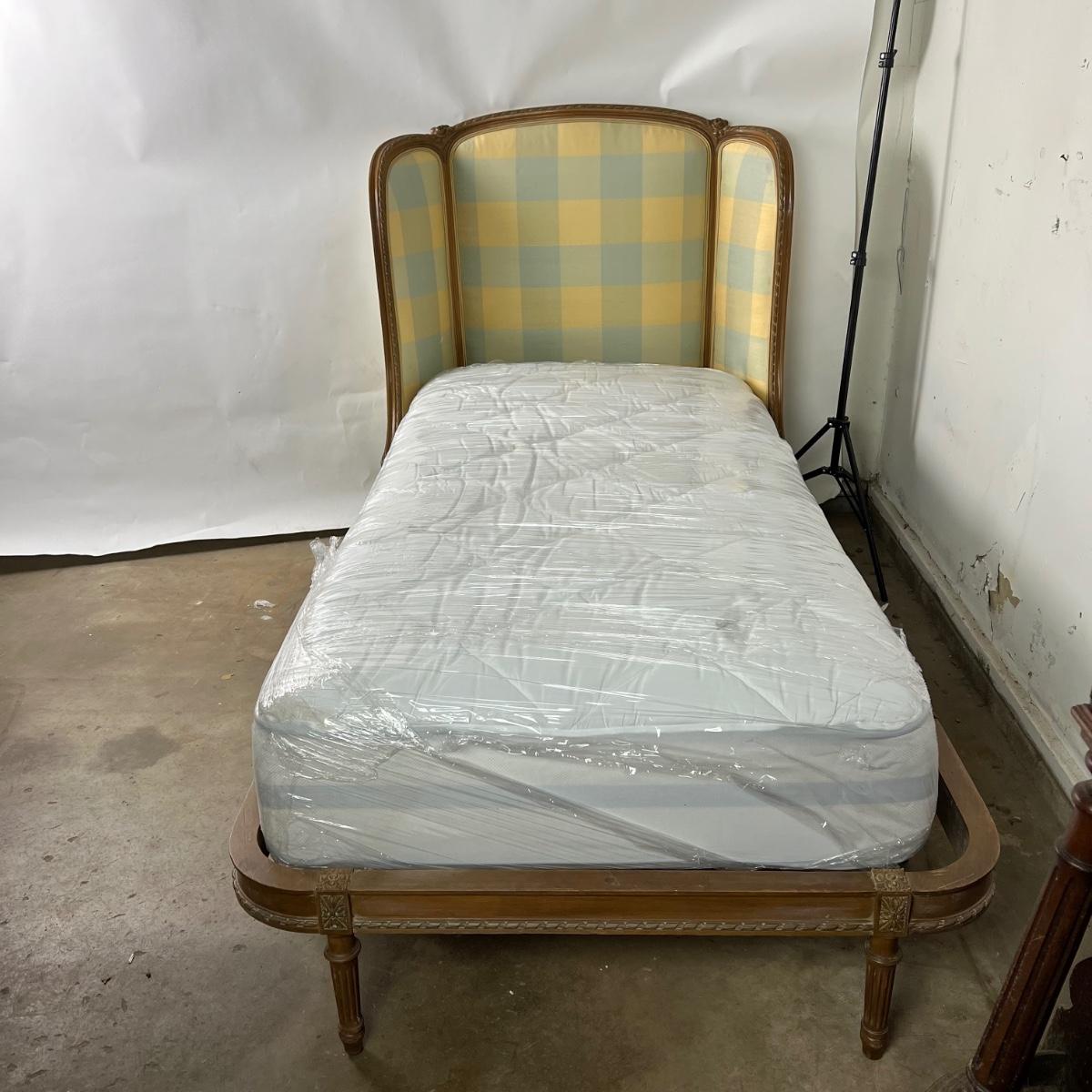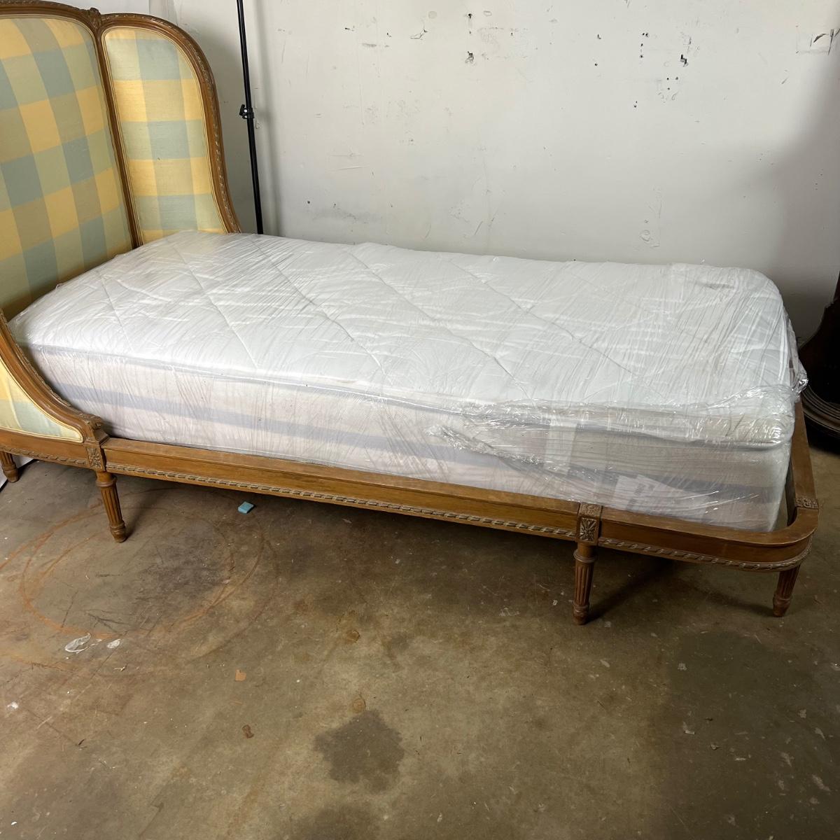 Very Clean condition, with large yellow and gray buffalo check. Picture shows back with crease , has been plastic wrapped for moving and should steam out. The ONE bed has signs of repair and has been glued / stapled. Can be professionally repaired. Overall good condition. Come with mattresses