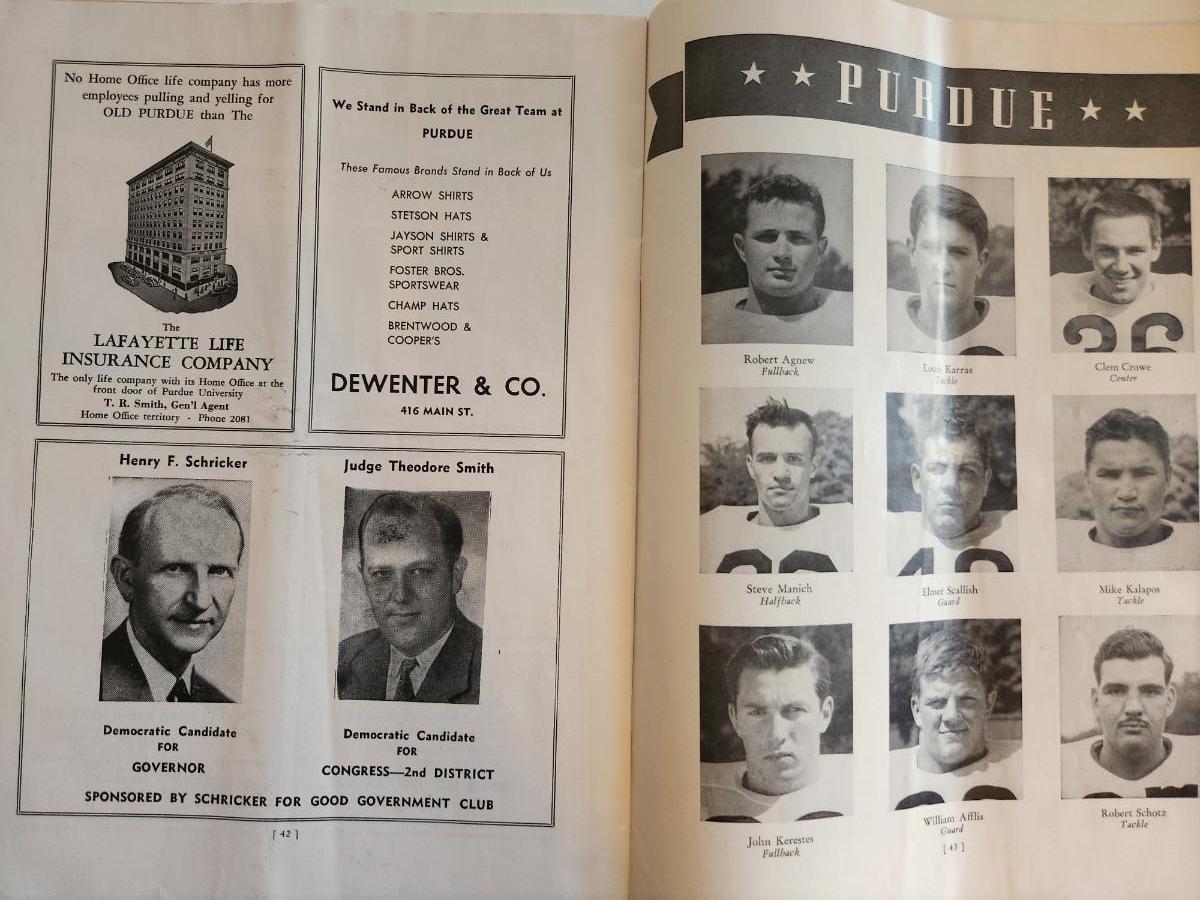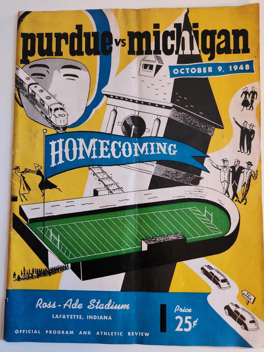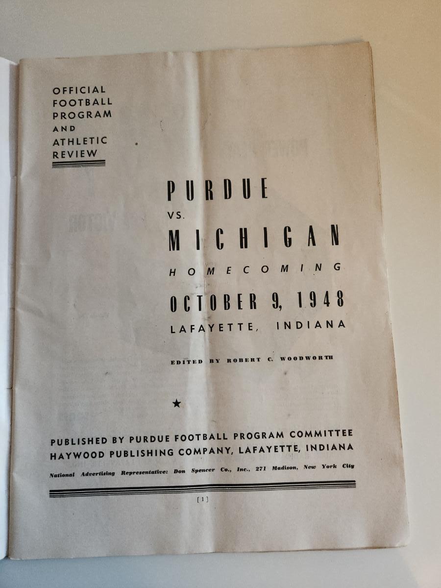 This auction lot is for a 1948 Purdue vs Michigan Football Program. This program is full of nifty old advertisements. Don't know which team won this game. There are a few very minor paper tears and folds but overall the program is In pretty good condition for its age and storage. This is a fun historical college football item.