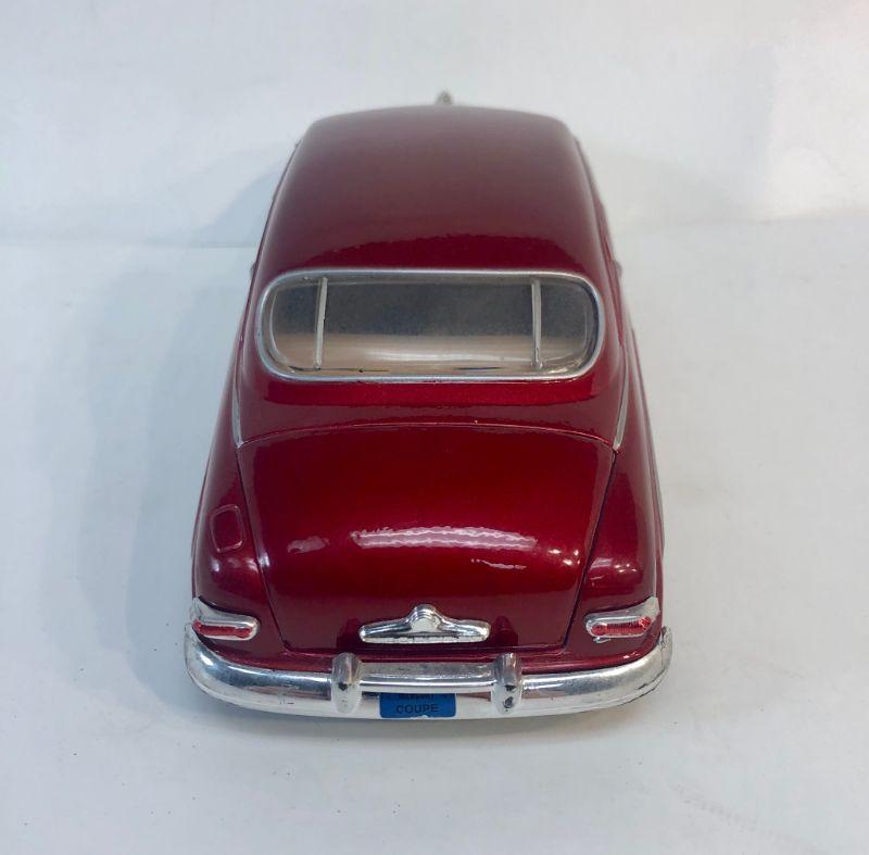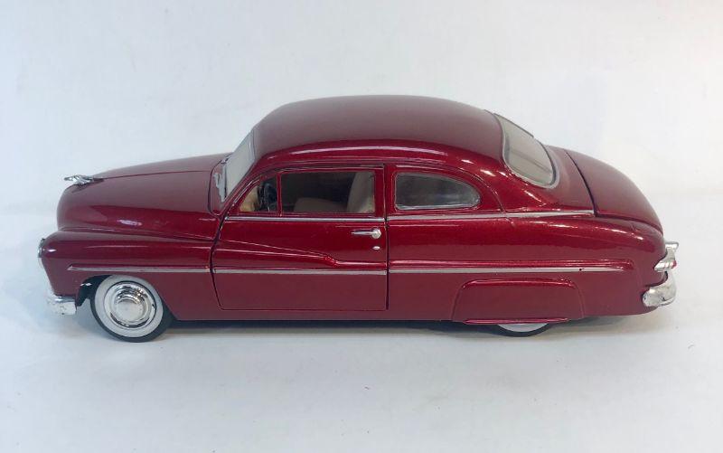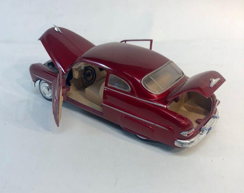 1949 Mercury Coupe. 1:24 scale car, measures 8.5" length. Candy apple red. Doors, hood and trunk open.