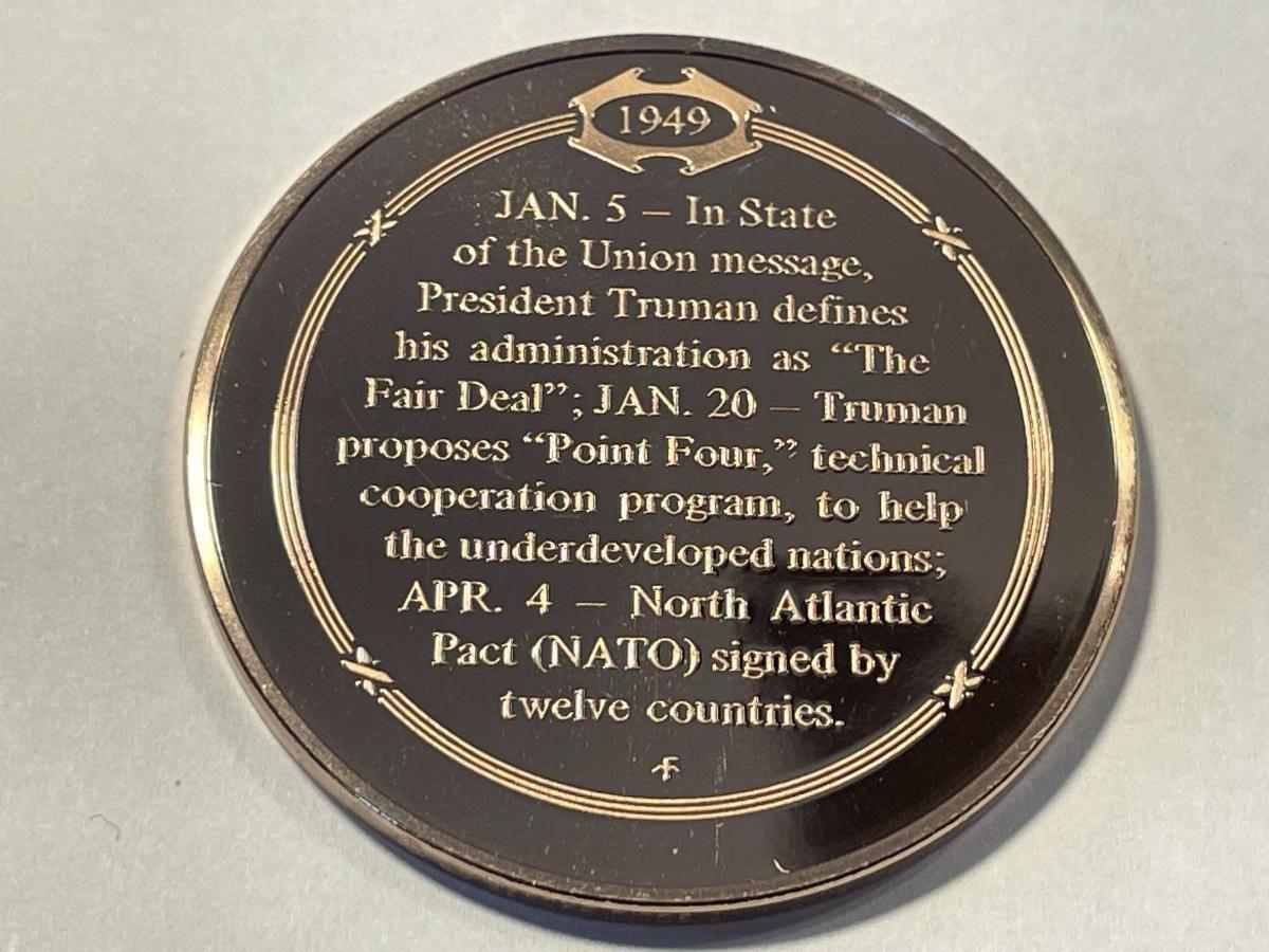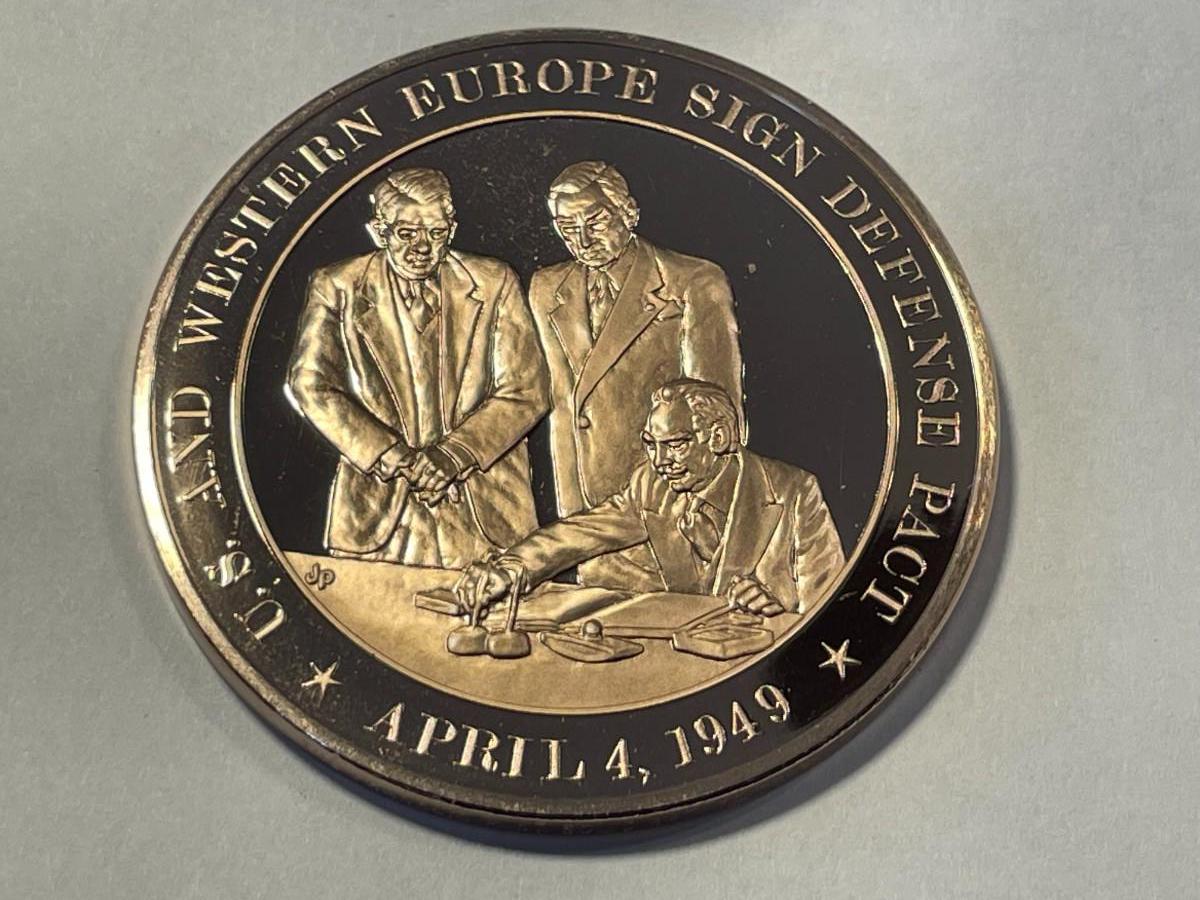 1949 U.S. AND WESTERN EUROPE SIGN DEFENSE PACT FRANKLIN MINT PROOF BRONZE MEDAL (MEDAL #55). FREE DOMESTIC SHIPPING.