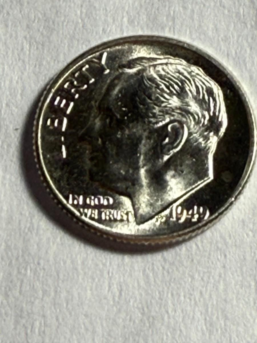 1949-D UNCIRCULATED/WHITE ROOSEVELT SILVER DIME AS PICTURED. $5 DOMESTIC SHIPPING.