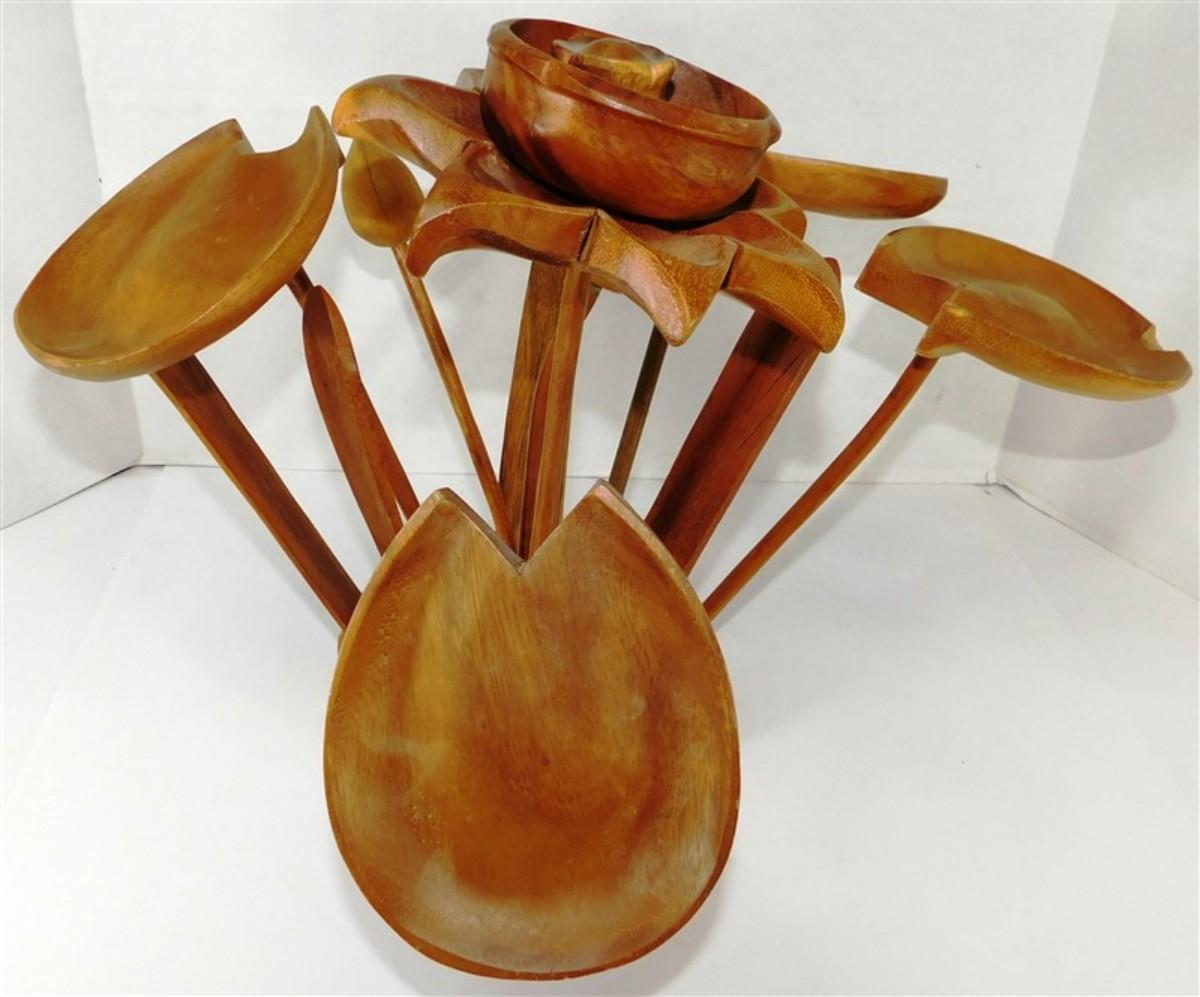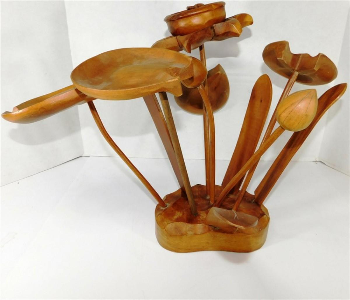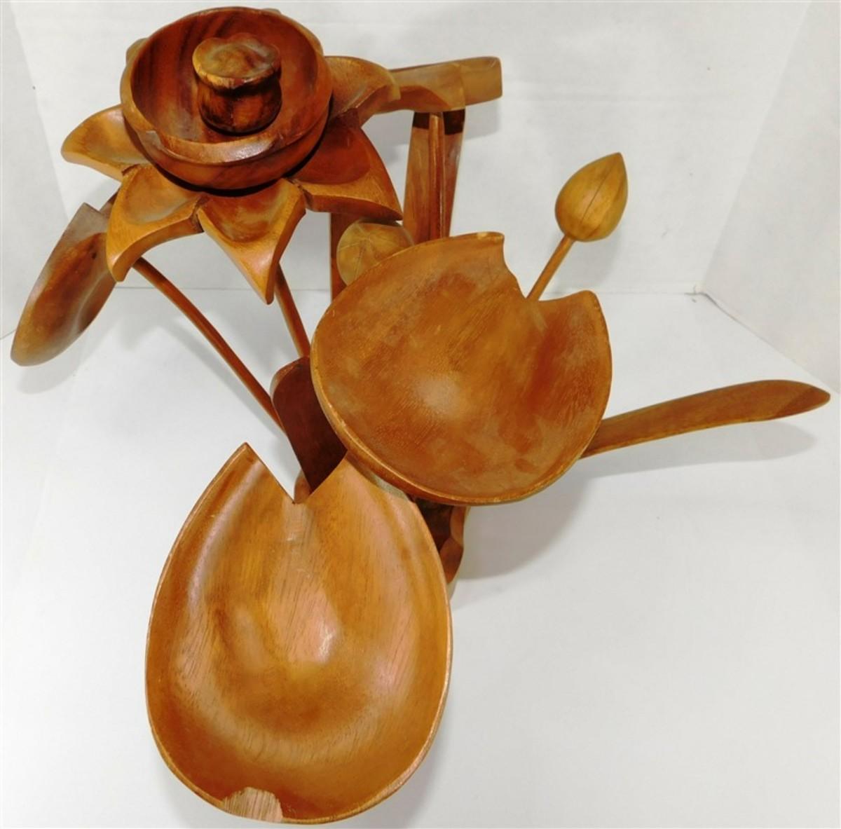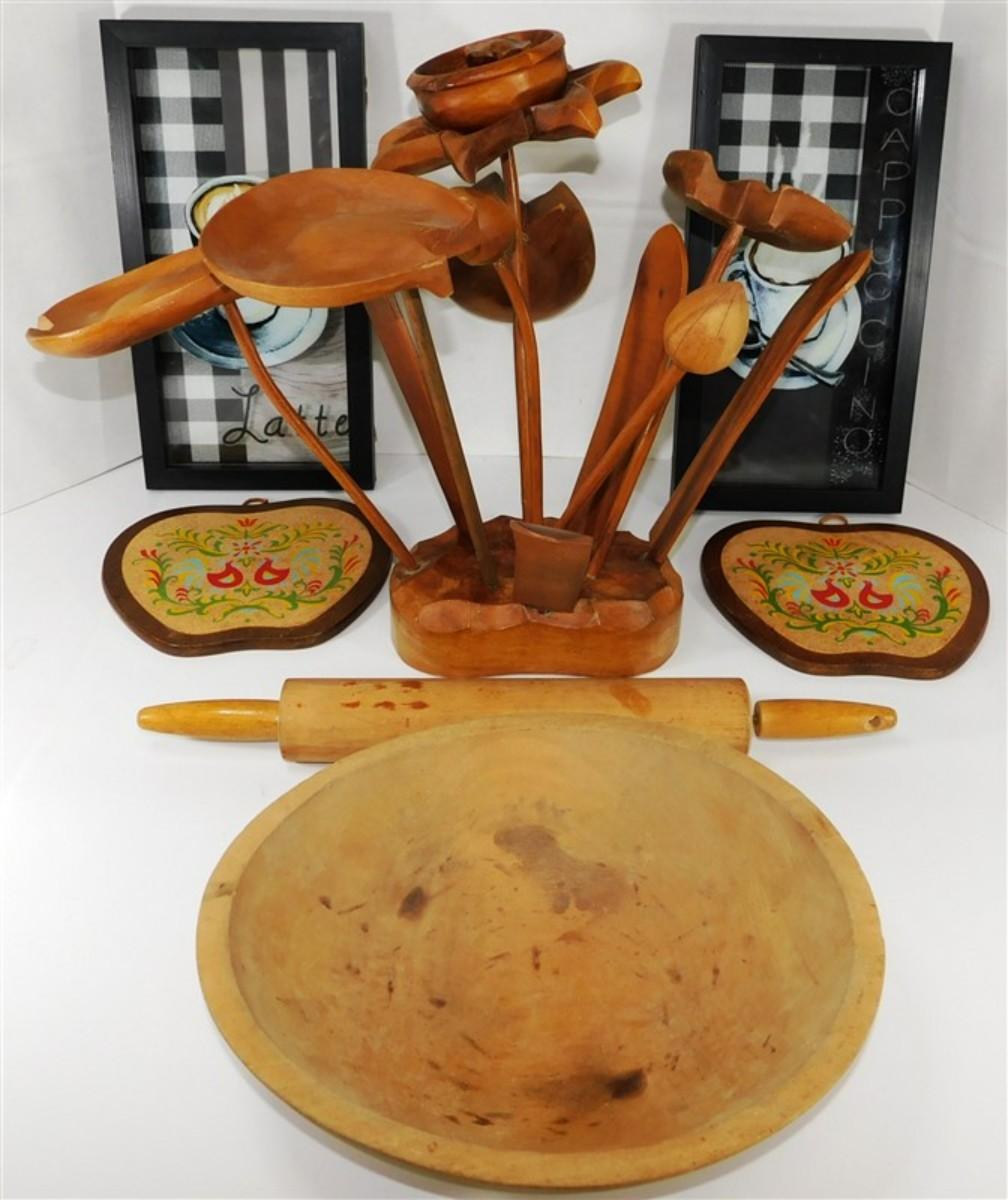 195 10 1/2 Small Wooden Dough Bowl - 7 x 14 Lot of 2 Plaid Coffee Shadow Box Style Pictures- 15" Wooden Sculpture of Lily Pads and Leaves 17" w/handles Wooden Rolling Pin